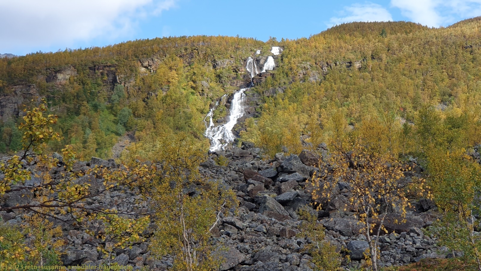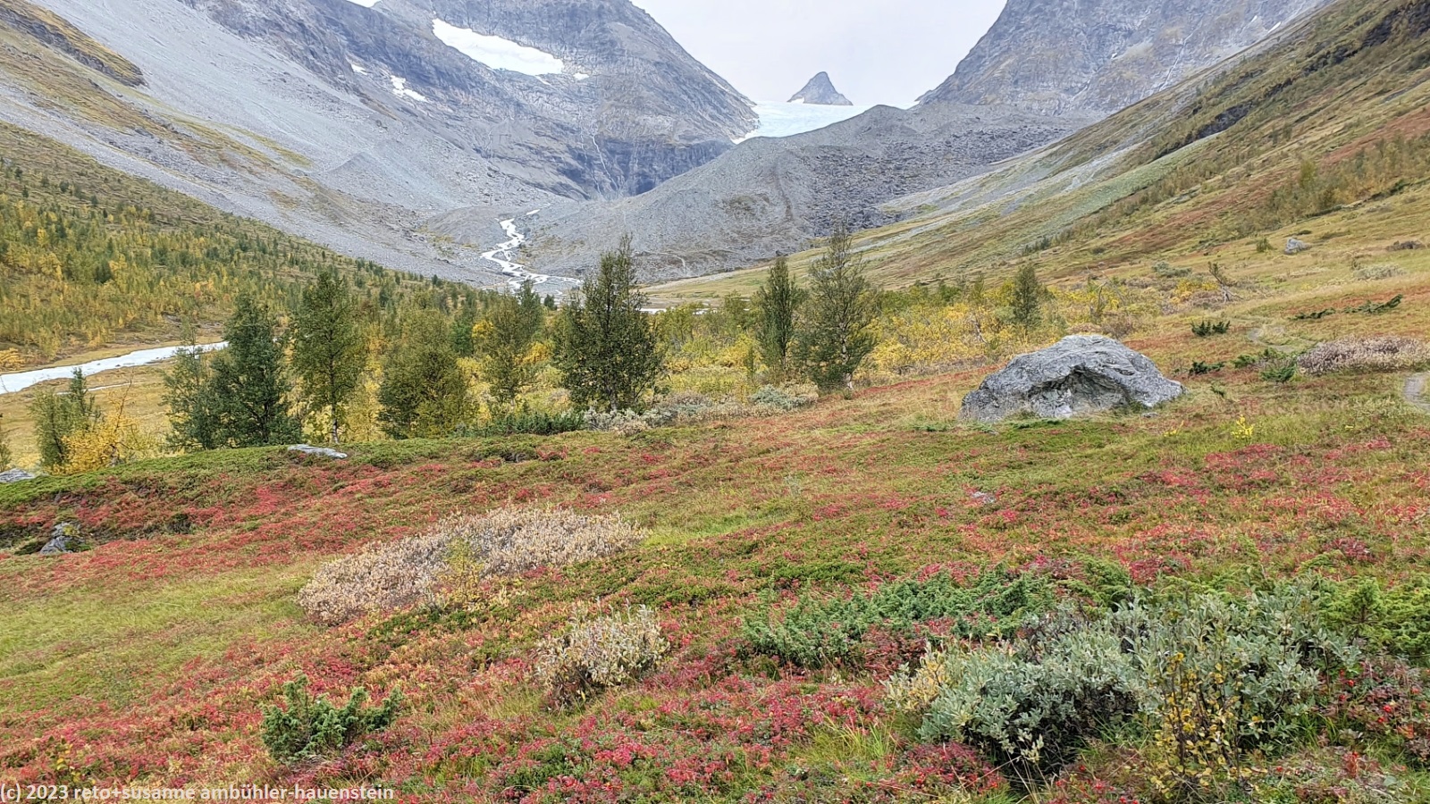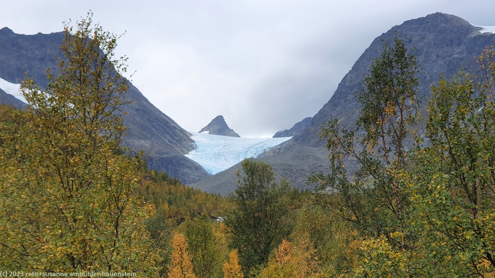 als uns unser handy um 7:30 uhr weckt, regnet es ziemlich heftig. wir haben uns für heute zwei optionen offen gehalten: entweder wir fahren weiter nach levi, oder wir bleiben noch einen tag länger hier und machen eine wanderung zum steindalsbreen. wir vertagen den entscheid bis nach dem frühstück. während wir im jogi essen, wird der himmel etwas freundlicher, man sieht sogar gelegentlich winzig kleine blaue flecken. wir entscheiden uns daher für die wanderung. die reception öffnet erst um 11 uhr, wir nehmen daher auch den tisch und die kabelrolle mit und registrieren uns am abend neu. der ausgangspunkt unserer wanderung liegt auf der anderen seite des storfjorden. luftlinie ist der parkplatz nur 10 km entfernt. wir müssen aber um den fjord herum fahren. dies bedeutet, erst auf der E6 27 km zurück in südwestlicher richtung - den weg, denn wir gestern gekommen sind, dann 17 km auf der strasse 868 in nordöstlicher richtung. kurz vor 11 uhr sind wir beim parkplatz. dieser ist - wie fast alle parkplätze in norwegen, egal wie abgelegen - kostenpflichtig. zum glück kann man überall mit der easypark app bezahlen. diese habe ich schon in kiel installiert und damit konnten wir auf dieser reise jeden gebührenpflichtigen parkplatz bezahlen, egal ob in deutschland, schweden oder norwegen. das ist schon fast genial. wir ziehen unsere wanderschuhe an und machen uns auf den weg. der himmel ist bewölkt, die wolken ziehen rasend schnell. entsprechend geht ein kräftiger wind. wenn ein bisschen sonne durch eines der seltenen löcher in der wolkendecke durchdringt, so ist dieses so schnell vorüber, dass wir kaum ein foto machen können. der weg steigt steil an und ist sehr steinig und holperig. er führt durch einen schönen birkenwald. die blätter der laubbäume sind nun vorwiegend gelb, es ist definitiv herbst geworden. nach knapp 2 km gelangen wir an den ziemlich wilden geailu. uns scheint, dieser führt erstaunlich viel wasser für die jahreszeit. zu unserer rechten hat es einen eindrücklichen wasserfall. nach 55 minuten erreichen wir die steindalshytta. diese ist abgeschlossen, zum übernachten müsste man sich vorher anmelden. über eine kleine brücke setzen wir unsere wanderung fort. bald kommen wir aus dem wald heraus, nun geht es über den breiten talboden. das tal hat die typische U-form, wie von gletscher geformte täler eben sind. vor uns sehen wir die mächtige schlussmoräne des steindalsbreen. der gletscher selbst ist eher klein. schilder markieren, wie weit das eis in früheren jahren gereicht hat. der aufstieg über die endmoräne ist sehr steil. vom gletscher weht ein eisiger wind. wir wandern bis zum see am ende des eises.