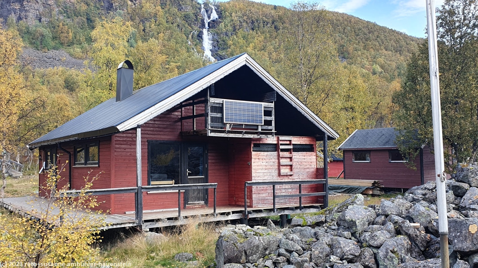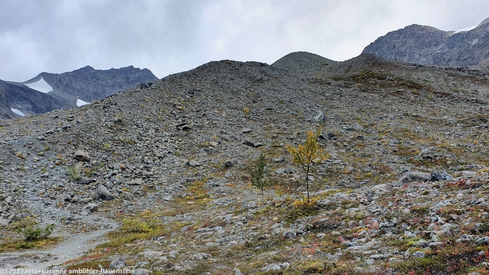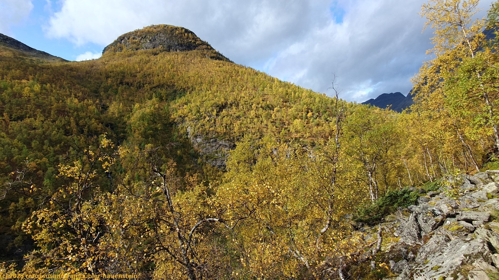 als uns unser handy um 7:30 uhr weckt, regnet es ziemlich heftig. wir haben uns für heute zwei optionen offen gehalten: entweder wir fahren weiter nach levi, oder wir bleiben noch einen tag länger hier und machen eine wanderung zum steindalsbreen. wir vertagen den entscheid bis nach dem frühstück. während wir im jogi essen, wird der himmel etwas freundlicher, man sieht sogar gelegentlich winzig kleine blaue flecken. wir entscheiden uns daher für die wanderung. die reception öffnet erst um 11 uhr, wir nehmen daher auch den tisch und die kabelrolle mit und registrieren uns am abend neu. der ausgangspunkt unserer wanderung liegt auf der anderen seite des storfjorden. luftlinie ist der parkplatz nur 10 km entfernt. wir müssen aber um den fjord herum fahren. dies bedeutet, erst auf der E6 27 km zurück in südwestlicher richtung - den weg, denn wir gestern gekommen sind, dann 17 km auf der strasse 868 in nordöstlicher richtung. kurz vor 11 uhr sind wir beim parkplatz. dieser ist - wie fast alle parkplätze in norwegen, egal wie abgelegen - kostenpflichtig. zum glück kann man überall mit der easypark app bezahlen. diese habe ich schon in kiel installiert und damit konnten wir auf dieser reise jeden gebührenpflichtigen parkplatz bezahlen, egal ob in deutschland, schweden oder norwegen. das ist schon fast genial. wir ziehen unsere wanderschuhe an und machen uns auf den weg. der himmel ist bewölkt, die wolken ziehen rasend schnell. entsprechend geht ein kräftiger wind. wenn ein bisschen sonne durch eines der seltenen löcher in der wolkendecke durchdringt, so ist dieses so schnell vorüber, dass wir kaum ein foto machen können. der weg steigt steil an und ist sehr steinig und holperig. er führt durch einen schönen birkenwald. die blätter der laubbäume sind nun vorwiegend gelb, es ist definitiv herbst geworden. nach knapp 2 km gelangen wir an den ziemlich wilden geailu. uns scheint, dieser führt erstaunlich viel wasser für die jahreszeit. zu unserer rechten hat es einen eindrücklichen wasserfall. nach 55 minuten erreichen wir die steindalshytta. diese ist abgeschlossen, zum übernachten müsste man sich vorher anmelden. über eine kleine brücke setzen wir unsere wanderung fort. bald kommen wir aus dem wald heraus, nun geht es über den breiten talboden. das tal hat die typische U-form, wie von gletscher geformte täler eben sind. vor uns sehen wir die mächtige schlussmoräne des steindalsbreen. der gletscher selbst ist eher klein. schilder markieren, wie weit das eis in früheren jahren gereicht hat. der aufstieg über die endmoräne ist sehr steil. vom gletscher weht ein eisiger wind. wir wandern bis zum see am ende des eises.