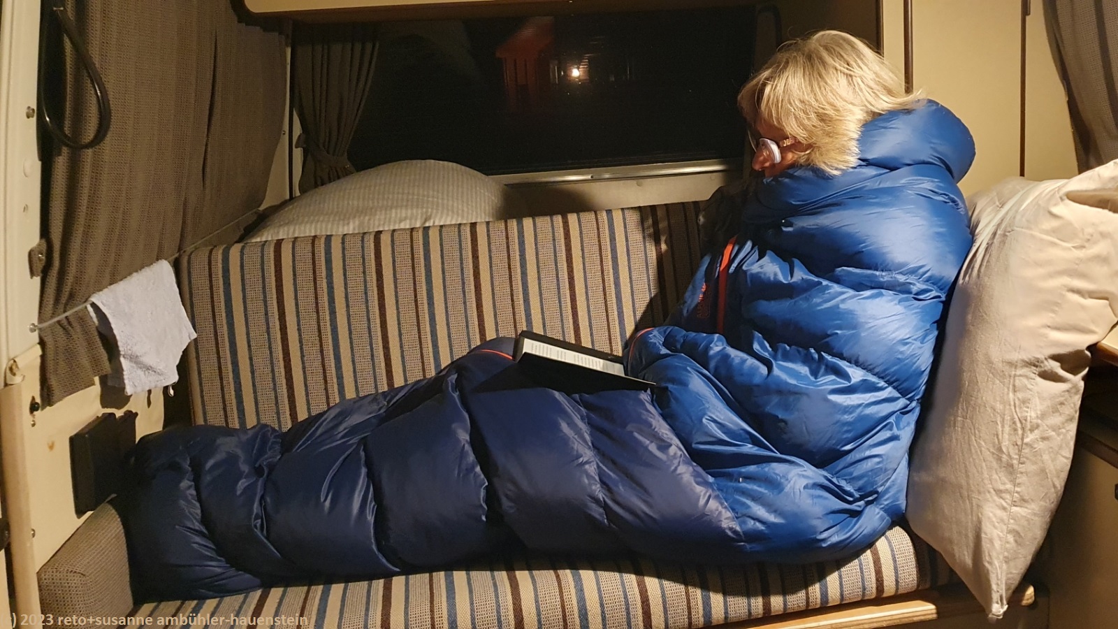 danach geniessen wir eine sitzung in der sauna und eine erfrischende dusche. vor dem nachtessen liest susanne ein bisschen, ich führe die bücher nach. nun wird es schon wieder früh dunkel. gemäss www.timeanddate.de wird die taglänge zur zeit jeden tag 8.5 minuten kürzer. nach dem essen liest susanne, ich überarbeite die tagebücher. zum lesen schlüpft meine frau in ihren schlafsack, denn sie empfindet es in unserem wagen kalt. die temperatur liegt aber immer noch über dem gefrierpunkt. noch vor mitternacht sind wir im bett.