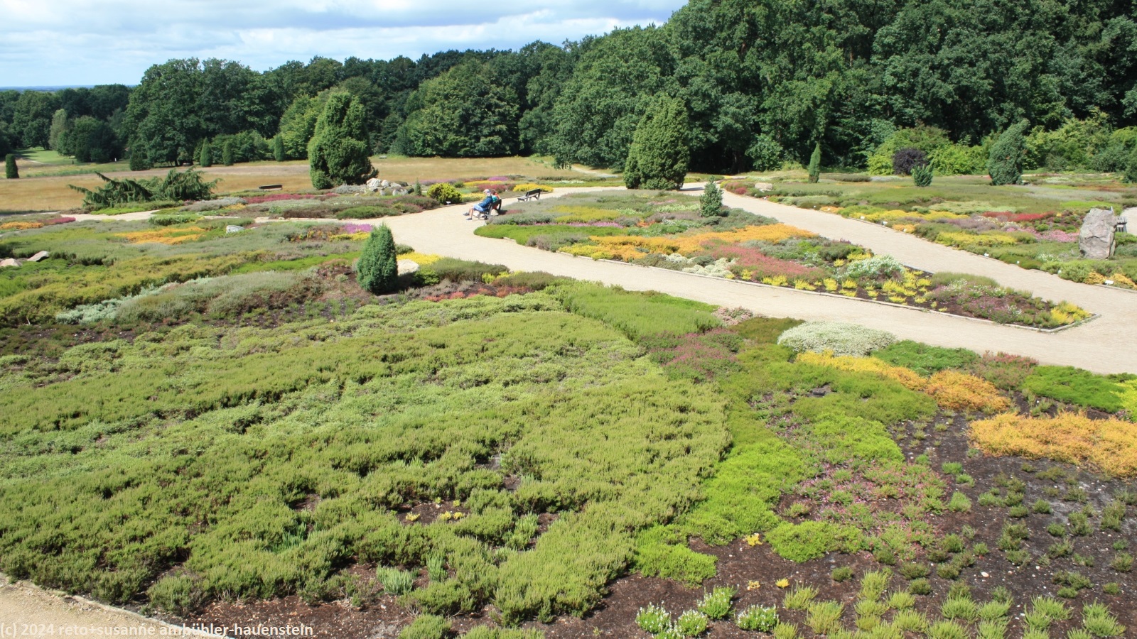 die nacht ist sehr ruhig. es regnet zumindest einmal ziemlich heftig. wir schlafen gut. als wir um 08:30 uhr aufstehen, fällt leichter nieselregen. wir gehen zu fuss zum bauernhof auf der anderen strassenseite und kaufen heidelbeeren für's frühstück. auf dem rückweg nehmen wir die bestellten brötchen mit. essen müssen wir im auto, denn der nieselregen hat sich ziemlich verstärkt. gegen 10:45 uhr fahren wir ins nahe schneverdingen und kaufen lebensmittel für die nächsten beiden tage ein. der regen hat inzwischen aufgehört. die kompakte wolkenschicht beginnt sich etwas aufzulockern, wir sehen winzig kleine blaue flecken am himmel. auf der suche nach dem parkplatz beim ausgangsort unserer heutigen wanderung fahren wir durch ein nettes einfamilienhaus-quartier. schliesslich werden wir beim heidegarten fündig und parkieren unseren wagen im schatten der bäume.