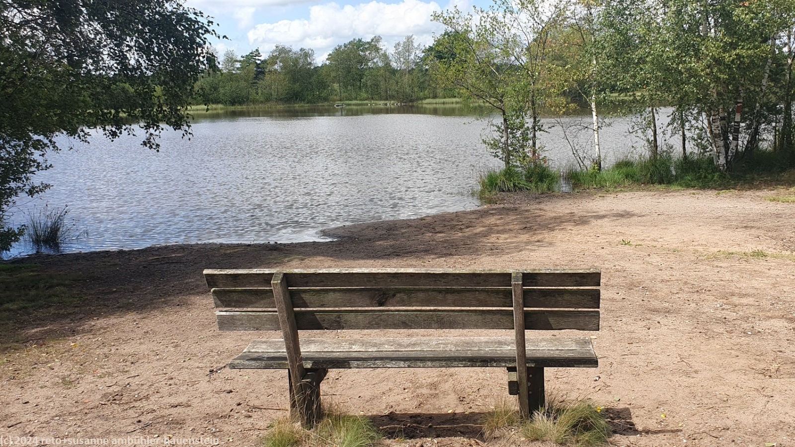 wir folgen den verschiedenen wanderwegen und kommen dabei erst an der freilichtbühne höpen und dann am sehr schönen haus mit dem atelier de bruycker vorbei. in der nähe sehen wir einen schäfer mit seiner herde. als einige schafe die richtung ändern, sorgt der fleissige hund dafür, dass sich die herde wieder vereint. wir überqueren erst die landstrasse L171 und folgen dann ein kurzes stück dem wanderweg richtung winterhof. nach einigen hundert metern erreichen wir die unterführung, durch welche wir auf die andere seite der bahnlinie gelangen. wenig später sind wir im naturschutzgebiet lüneburger heide. das wetter wird zusehends freundlicher mit längeren sonnigen abschnitten. wir wandern durch eine flache, aber sehr schöne landschaft. neben dem wanderweg hat es eine spur für pferdewagen. uns scheint, dass sich der wald immer mehr ausdehnt. in manchen heideflächen wachsen kleine nadelbäume. es gibt aber auch bereiche ohne solche bäumchen. wir vermuten, es hängt von der beschaffenheit des bodens ab, ob bäume wachsen können oder nicht. wir folgen einem wanderwegs südwärts bis zur alten landstrasse. dort führt ein pfad neben der strasse westwärts. nach etwas mehr als einem kilometer schwenken wir wieder richtung süden und erreichen gegen 13:30 uhr den kleinen sylvestersee. bis hier waren wir ziemlich alleine unterwegs, aber als wir uns auf eine der bänke am ufer setzen, erhalten wir bald gesellschaft. trotzdem sind wir erstaunt, wie wenig leute hier unterwegs sind. wir geniessen unsere brote.