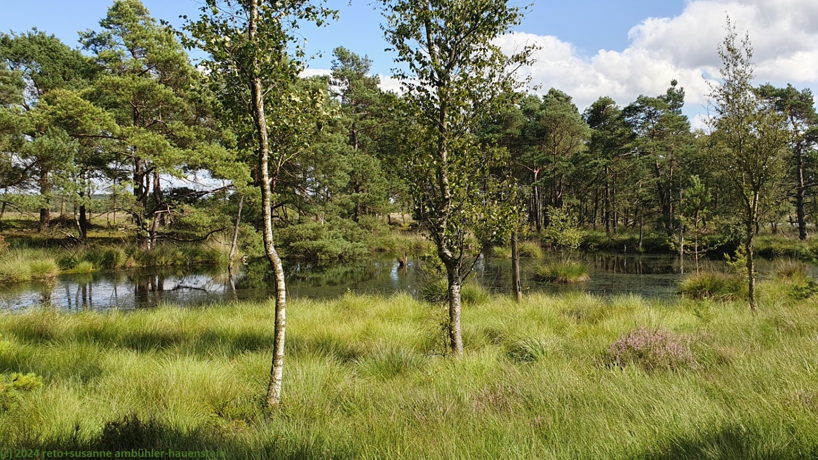 obwohl es in der nacht kräftig regnet schlafen wir bestens. wir stehen um 08:30 uhr auf und kaufen beim bauernhof auf der anderen strassenseite heidelbeeren für's frühstück. gegen 10:45 uhr fahren wir nach schneverdingen, wo wir erst einkaufen gehen und dann unseren wagen beim heidegarten parkieren. wir wandern durch einen schönen wald bis zum stattlichen haus des atelier de bruycker. ganz in der nähe sehen wir einen hirten mit seiner schafherde. wir überqueren erst die landstrasse L171 und gelangen wenig später durch eine bahnunterfühung in das naturschutzgebiet lüneburger heide. über offenes heideland wandern wir bis zum sylvestersee, wo wir auf einer sitzbank zu mittag essen. über breite wanderwege erreichen wir um 15:15 uhr den schäferhof. auf dessen gartenterrasse geniessen wir kaffee und kuchen. bevor wir den rückweg zum heidegarten unter die füsse nehmen, wandern wir über den pietzmoor moorrundweg. dieser führt uns durch eine wunderschöne moorlandschaft. von schneverdingen fahren wir zurück zum campingplatz. das nachtessen können wir bei sonnenschein im freien geniessen. nach einem gemütlichen abend schlüpfen wir noch vor 23 uhr unter die bettdecke.