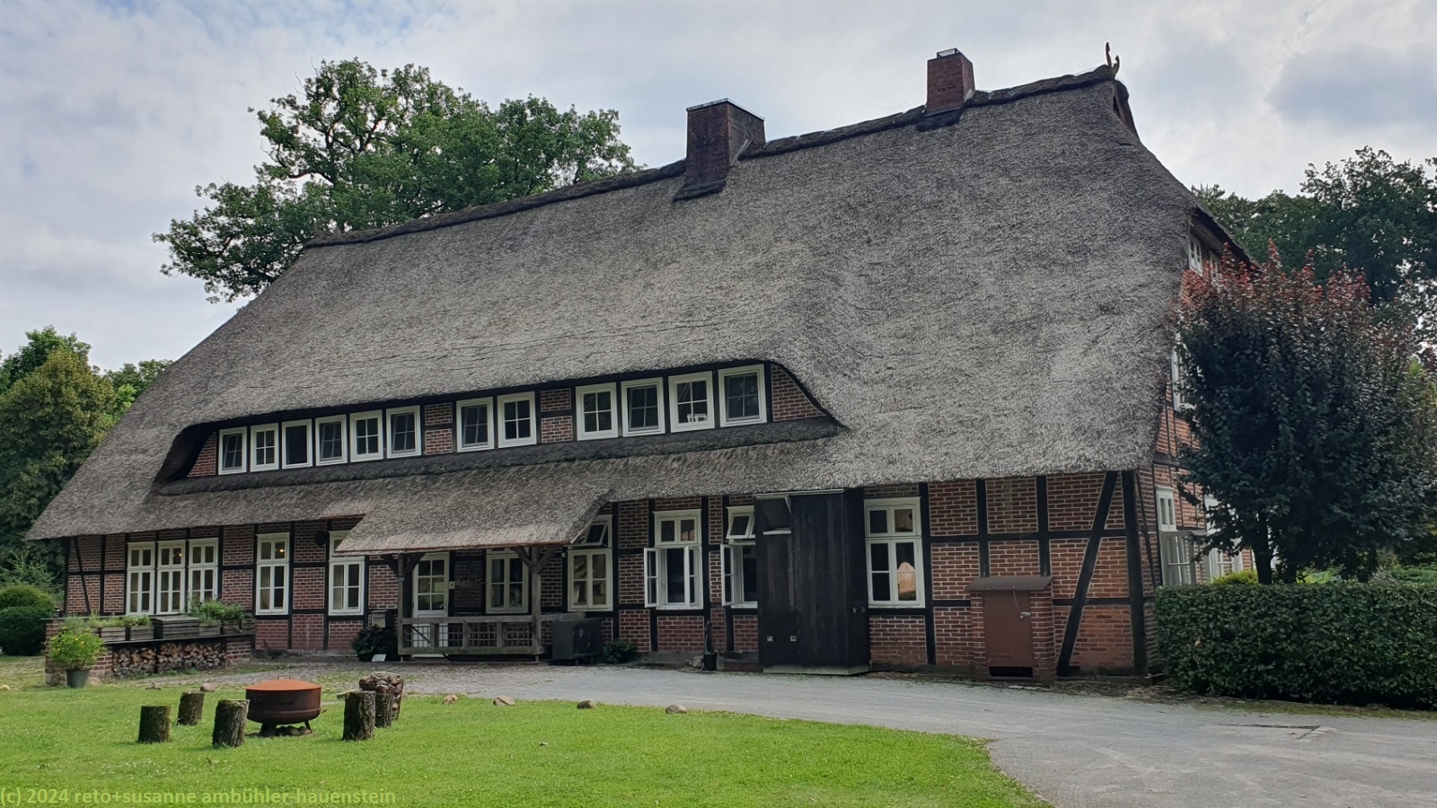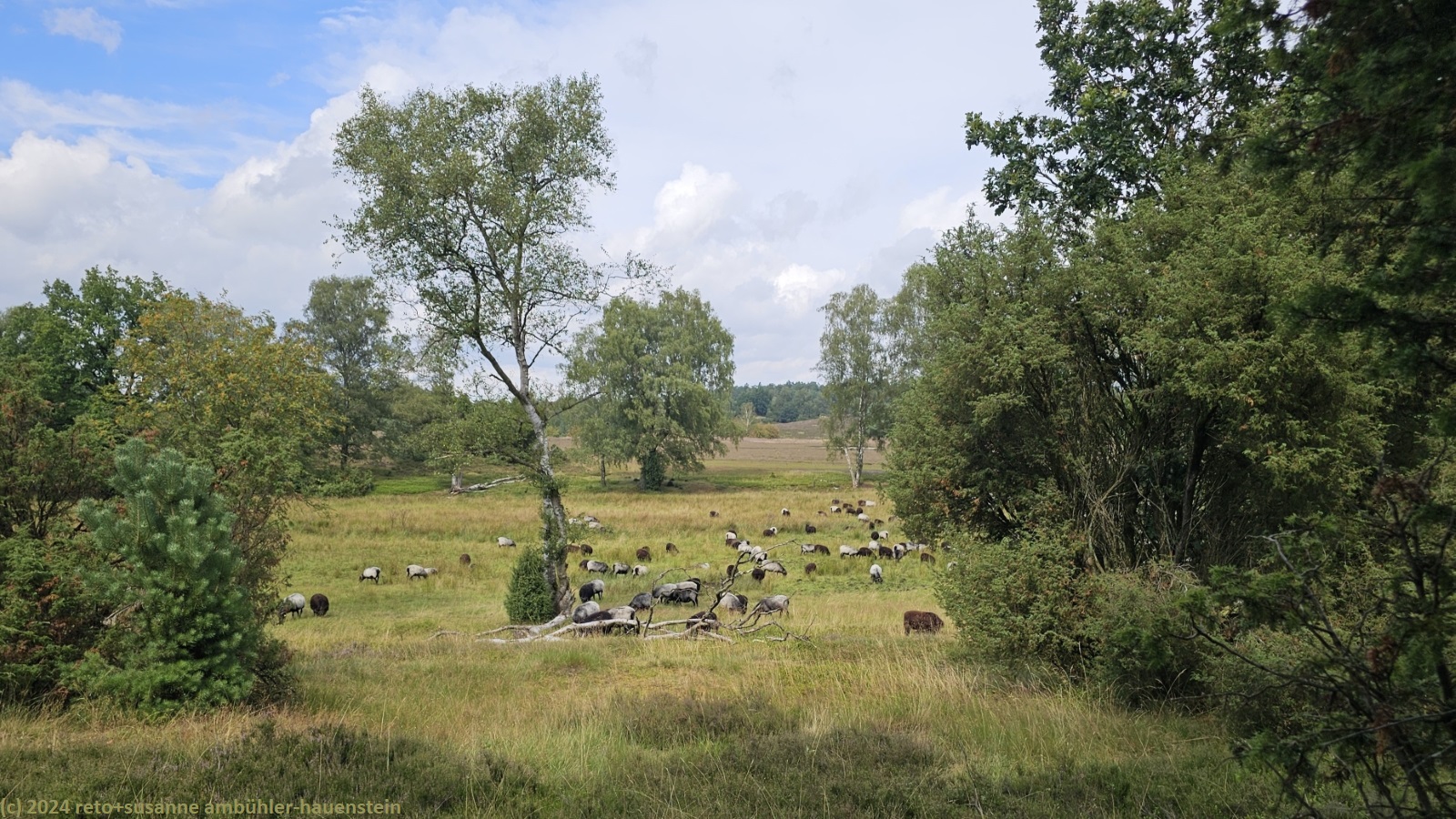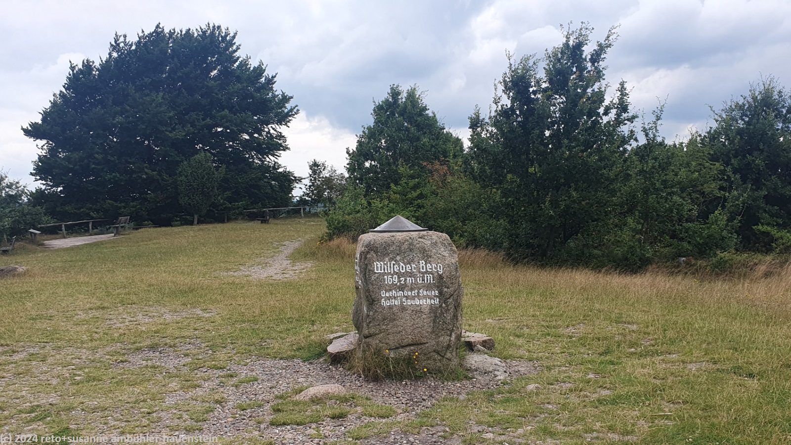 als wir um 08:30 uhr aufstehen ist es bewölkt, nur im westen ist der himmel blau. während wir im freien frühstücken, ziehen die wolken ostwärts und schon bald wird es sonnig. um 10:15 uhr machen wir uns auf den weg nach oberhaverbeck, dem ausgangspunkt unserer heutigen rundwanderung. wir finden einen schattigen parkplatz sowie eine karte mit verschiedenen wanderwegen. wir wandern erst durch den ort und bewundern die zahlreichen fachwerkhäuser. manche höfe wurden in hotels umgebaut. die nebengebäude bieten unterschiedliche unterkünfte und gruppenräume für verschiedene aktivitäten an. ausgangs dorf folgen wir einem weg durch eine graslandschaft. hier am rande des naturparkes wird noch landwirtschaft betrieben. bei niederhaverbeck wären wir beinahe der falschen strasse gefolgt, dank des navi bemerken wir den irrtum nach wenigen metern. nun folgen wir dem pfad richtung wilseder berg. die landschaft ist etwas hügliger als gestern und es hat auch mehr bäume. inzwischen sind wieder wolken aufgezogen, die temperatur ist daher sehr angenehm. kurz vor mittag stehen wir auf dem 169.2 meter hohen "berg". der "gipfel" ist kaum zu erkennen. wäre da nicht der markante stein, wir wüssten nicht genau, wo der höchste punkt ist. nun geht es ostwärts richtung wilsede. der pfad senkt sich ganz leicht. kurz vor dem ort picknicken wir auf einer bank mit blick auf ein schönes heidefeld. während wir unsere brote verzehren, beginnt es leicht zu regnen, aber nur für einige minuten.