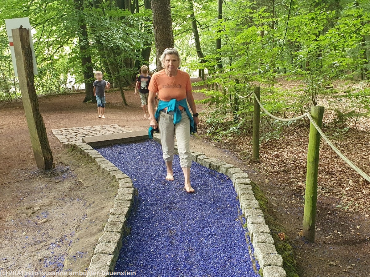 wir stehen auch heute um 08:30 uhr auf. es ist trocken, wenn auch etwas windig. die bedingungen sind gut genug, um im freien zu frühstücken. nach dem abwaschen packen wir zusammen und melden uns beim empfang ab. über die A7 gelangen wir nach egestorf, wo wir den barfusspark besuchen. der besucherandrang ist sehr erträglich. es sind viele familien mit kindern unterwegs, der park ist super geeignet für familien mit kinder jeden alters. der rundweg führt über unterschiedliche unterlagen inklusive holz, stein, glasscherben, pfirsichkerne, tannzapfen, tannenzweige, schlamm- und torfbäder. der waldboden ist angenehm zu begehen. der pfad ist sehr abwechslungsreich. die über 60 posten haben nicht nur mit barfussgehen zu tun, sondern es gibt noch diverse andere attraktionen wie klänge, pendel usw. etwas besonderes ist die "längste barfuss-begehbare hängebrücke". um 12:30 uhr sind wir wieder beim ausgangspunkt.