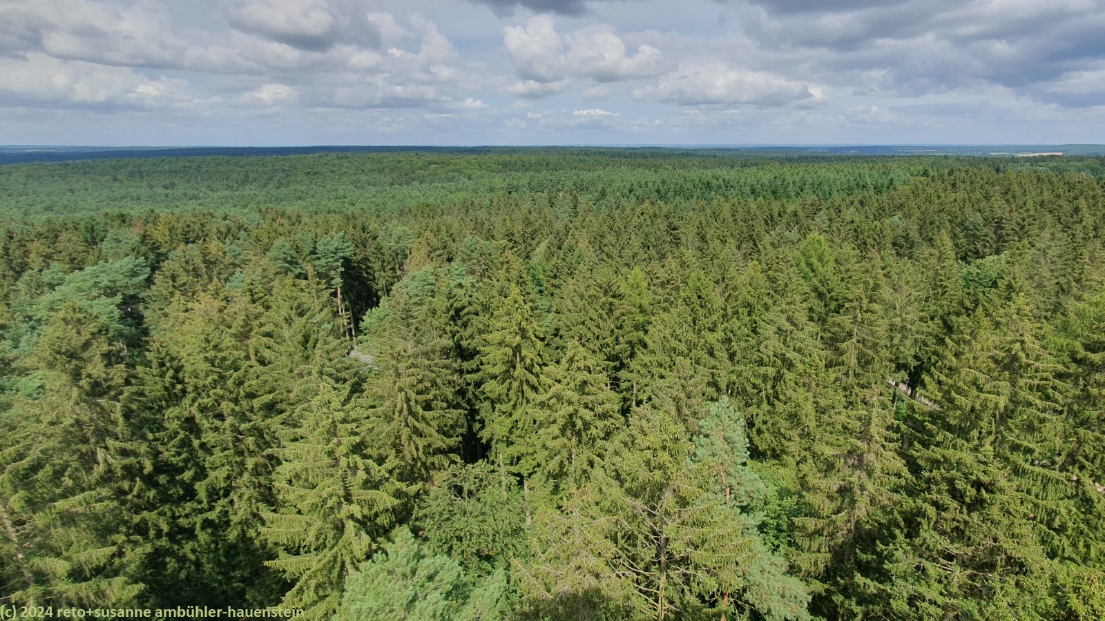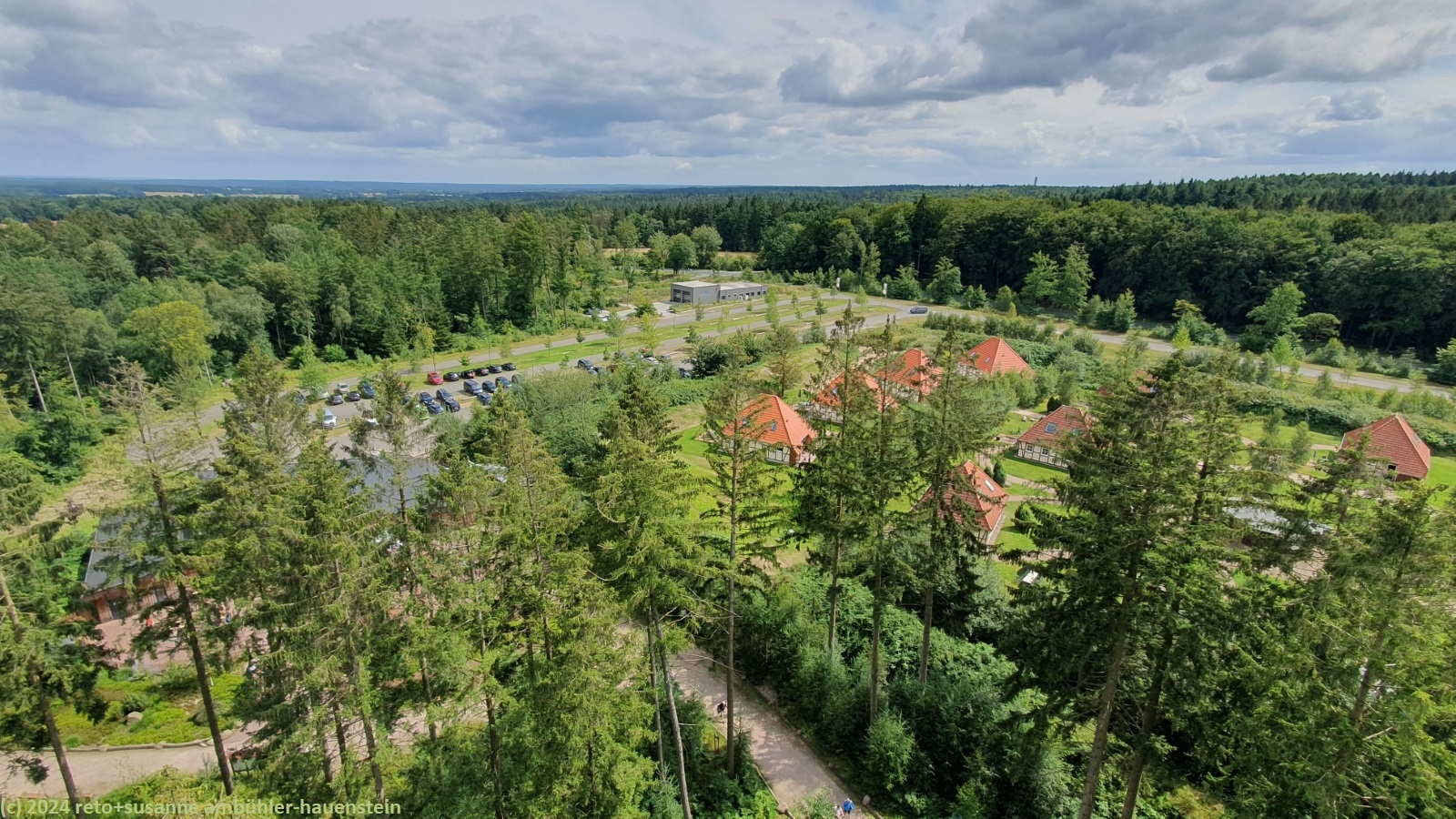 wir fahren zum "heide himmel", einem baumwipfelpfad im wildpark lüneburger heide. allerdings fahren wir nicht direkt, sondern machen einen bogen durch die heidelandschaft um wesel und schierhorn. dabei fahren wir durch undeloh. dieses dorf ist gemäss reiseführer der typische ort in der lüneburger heide schlechthin. manche häuser sind tatsächlich sehr schön, aber uns reicht die fahrt durch den ort, auf den geplanten spaziergang verzichten wir. kurz nach 13 uhr sind wir beim baumwipfelpfad. auch hier hält sich der andrang sehr in grenzen. wir picknicken zuerst an einem der tische beim eingang und geniessen anschliessend kaffee und kuchen auf der terrasse. danach schlendern wir über den baumwipfelpfad. vom steg sehen wir nicht nur in die baumkronen, sondern auch in die gehege des tiergartens. wir erkennen zwei luchse, dachse und waschbären. offenbar dürfen die besucher hier in manche gehege und tiere füttern. zudem sehen wir rehe, welche sich von den besuchern streicheln lassen. schliesslich erreichen wir den 45 meter hohen aussichtsturm. von der plattform haben wir eine tolle rundsicht. wir sehen vorwiegend wald, soweit das auge reicht. selbst der fernsehturm von hamburg ist mit blossem auge zu erkennen. kurz vor 15 uhr sind wir wieder beim jogi.