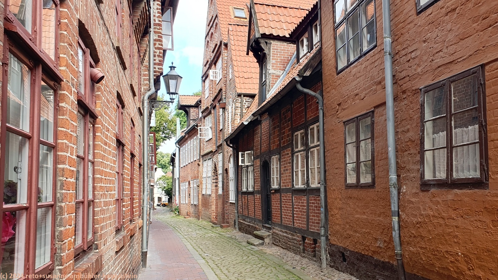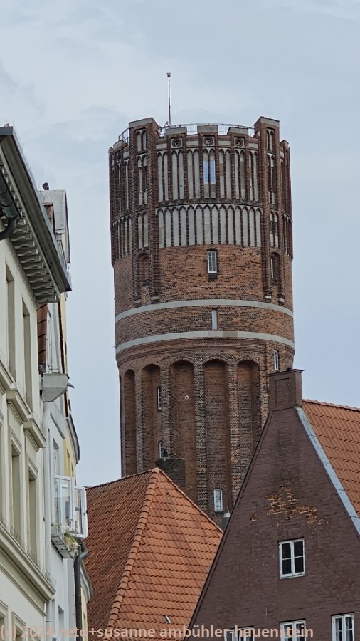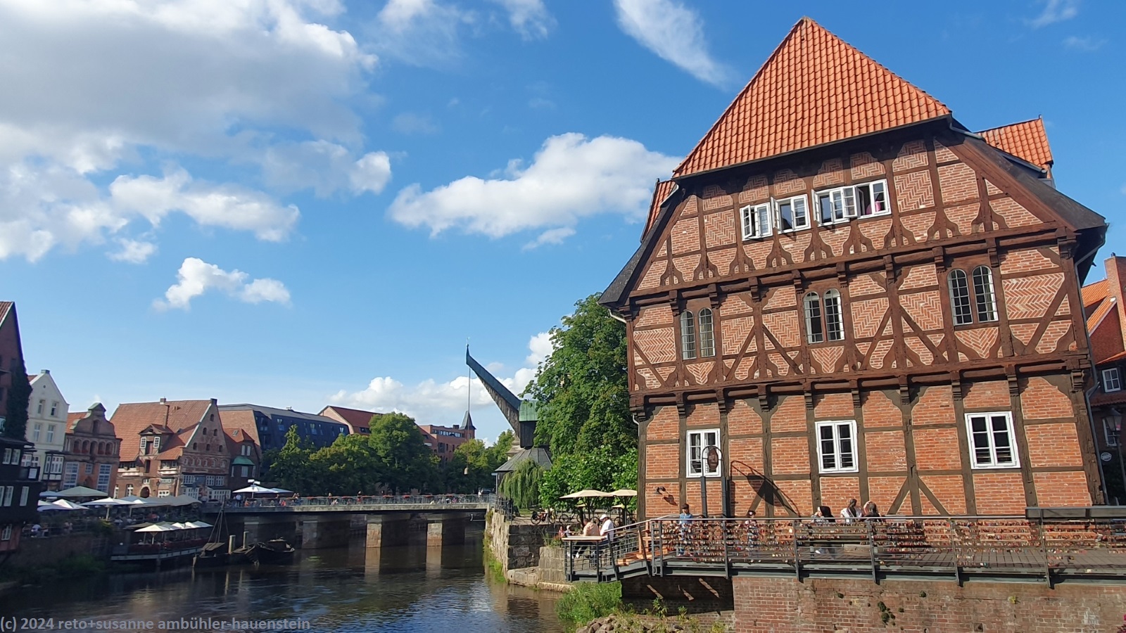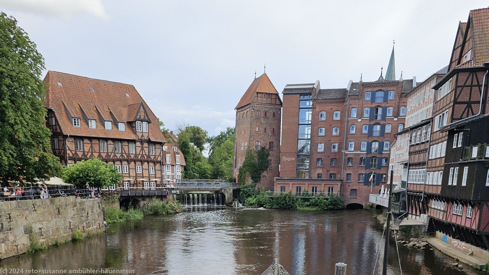 die fahrt nach lüneburg dauert etwas länger als erwartet, weil die strasse zwischen garlstorf und salzhausen gesperrt ist und wir deshalb eine umfahrung nehmen müssen. kurz nach 15:30 uhr erreichen wir lüneburg und finden auch den parkplatz "hinter der saline" auf anhieb. zu fuss gehen wir in die altstadt. im touristenbüro erhalten wir einen stadtplan. wir erfrischen uns "am sande" in einer bäckerei mit tee und einem brötchen, danach spazieren wir durch das stadtzentrum. an der mächtigen sankt johanniskirche vorbei gelangen wir zum 56 meter hohen wasserturm. wir erklimmen die treppe zur aussichtsplattform und haben einen fantastischen rundblick über die stadt. im wasserturm wurden einst 500'000 liter wasser gespeichert. heute dient das gebäude als touristenattraktion und veranstaltungsort. es hat diverse ausstellungen und den zweiten stock kann man für veranstaltungen mieten. wieder auf dem boden gehen wir richtung fluss und folgen der ilemnau bis zur lünerstrasse. hier befindet sich das restaurant "das kleine", wo wir gerne zu abendessen möchten. noch ist es etwas zu früh, aber eine freundliche dame meint, wir bräuchten keine reservation, wir sollen einfach kommen wenn uns danach ist. wir spazieren noch einmal durch die altstadt und sind dann kurz vor 18 uhr beim "kleinen".