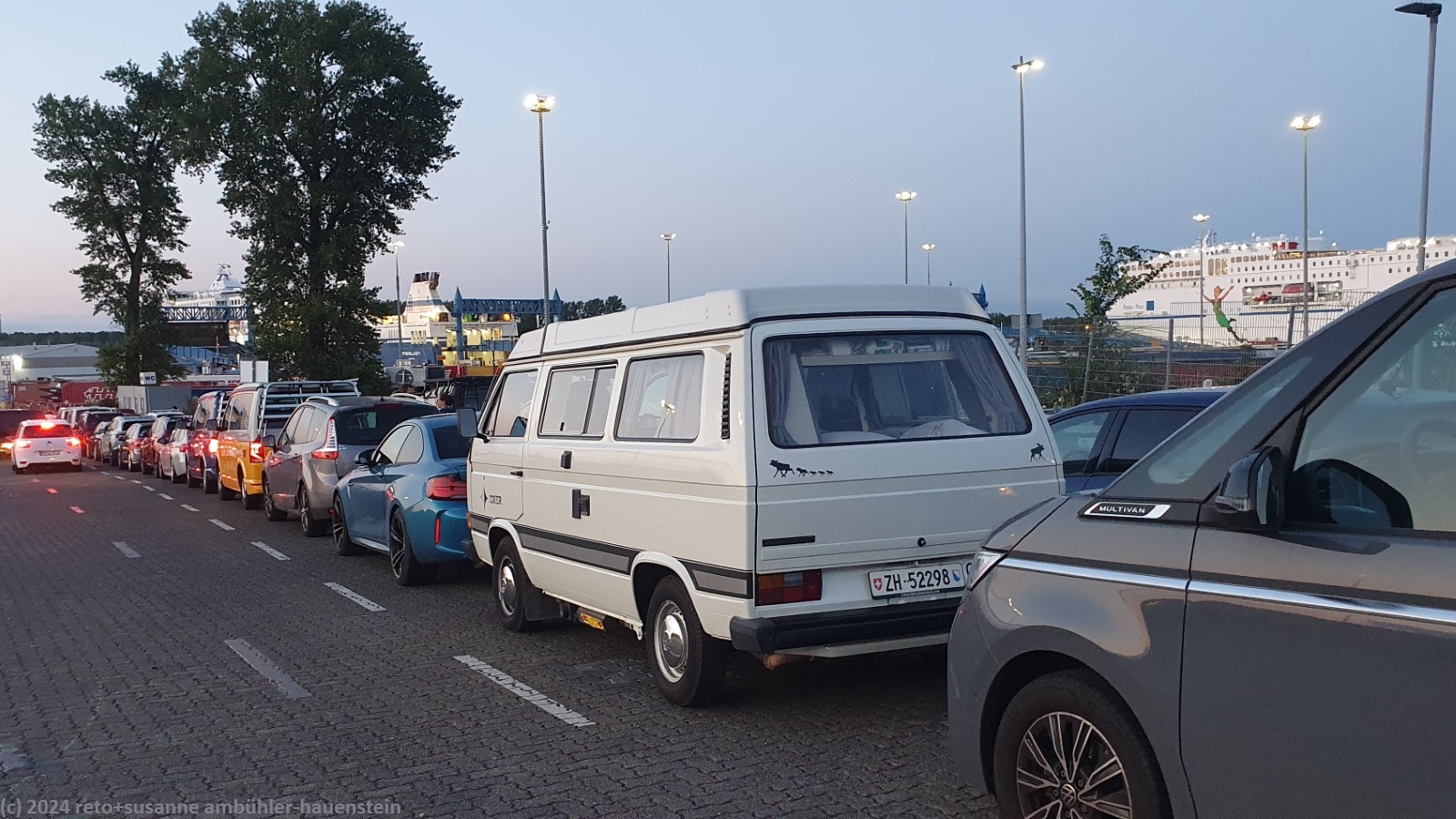 wir geniessen ein köstliches abendessen im licht der abendsonne. am tisch nebenan sitzen ein junger mann und zwei frauen aus mexiko. ihre lebhafte unterhaltung ist nicht zu überhören. offensichtlich entspricht das servierte essen nicht ihren erwartungen. irgendwann möchte der mann "pasta" bestellen, aber das gibt es in diesem restaurant nicht. hier werden norddeutsche spezialitäten serviert und keine teigwaren. als ich zum dessert einen blaubeerbecher bestelle, möchte er auch einen haben. wir stellen uns vor, dass es uns ähnlich ergehen wird, falls aus der angedachten japanreise einmal etwas wird. um 19 uhr brechen wir wieder auf. wir kehren zum jogi zurück und fahren zum überseehafen bei travemünde. kurz vor dem hafen tanken wir unseren wagen auf. da sich die tankstelle auf der anderen strassenseite der richtungsgetrennten B75 befindet, ist die anfahrt und der weg zurück zur route richtung hafen etwas kompliziert und erfordert mehrere wendemanöver. der check-in braucht ein bisschen geduld, klappt aber problemlos. während wir auf den beginn des verlads warten, packen wir erst unsere sachen, die wir auf die fähre mitnehmen wollen. danach liest susanne, ich führe die bücher nach.
