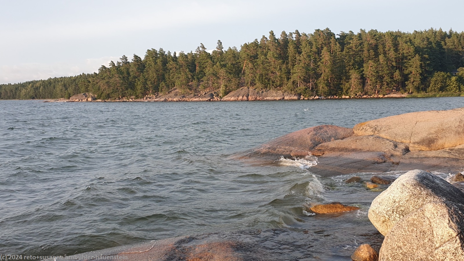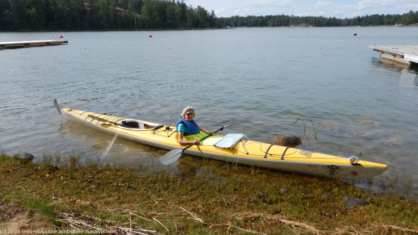wir erwachen gegen 8 uhr. nach dem frühstück paddeln wir westwärts bis zum hotel sandvik, wo wir schöne öffentliche toiletten finden. im weiteren verlauf gelangen wir durch ein kleines tunnel in den sommarö sund und erreichen eine stunde später die insel anisor, wo wir in einer kleinen bucht picknicken. die weiterfahrt richtung nagu führt anfangs nordwärts, unterwegs kämpfen wir gegen wind und wellen. durch eine schilfreiche passage gelangen wir in den yachthafen von nagu. in einem der restaurants erfrischen wir uns mit einem heissen getränk und zimtschnecken. im touristenbüro hat eine junge dame einen guten tipp, wo wir die nacht im zelt verbringen könnten. wir paddeln noch einmal 9 km, nun aber mit rückenwind ostwärts. westlich der bucht dyviken bei der landzunge källarudden an der nordküste der insel lillandet finden wir auf einer kleinen anhöhe in einem wald einen schönen platz zum übernachten.