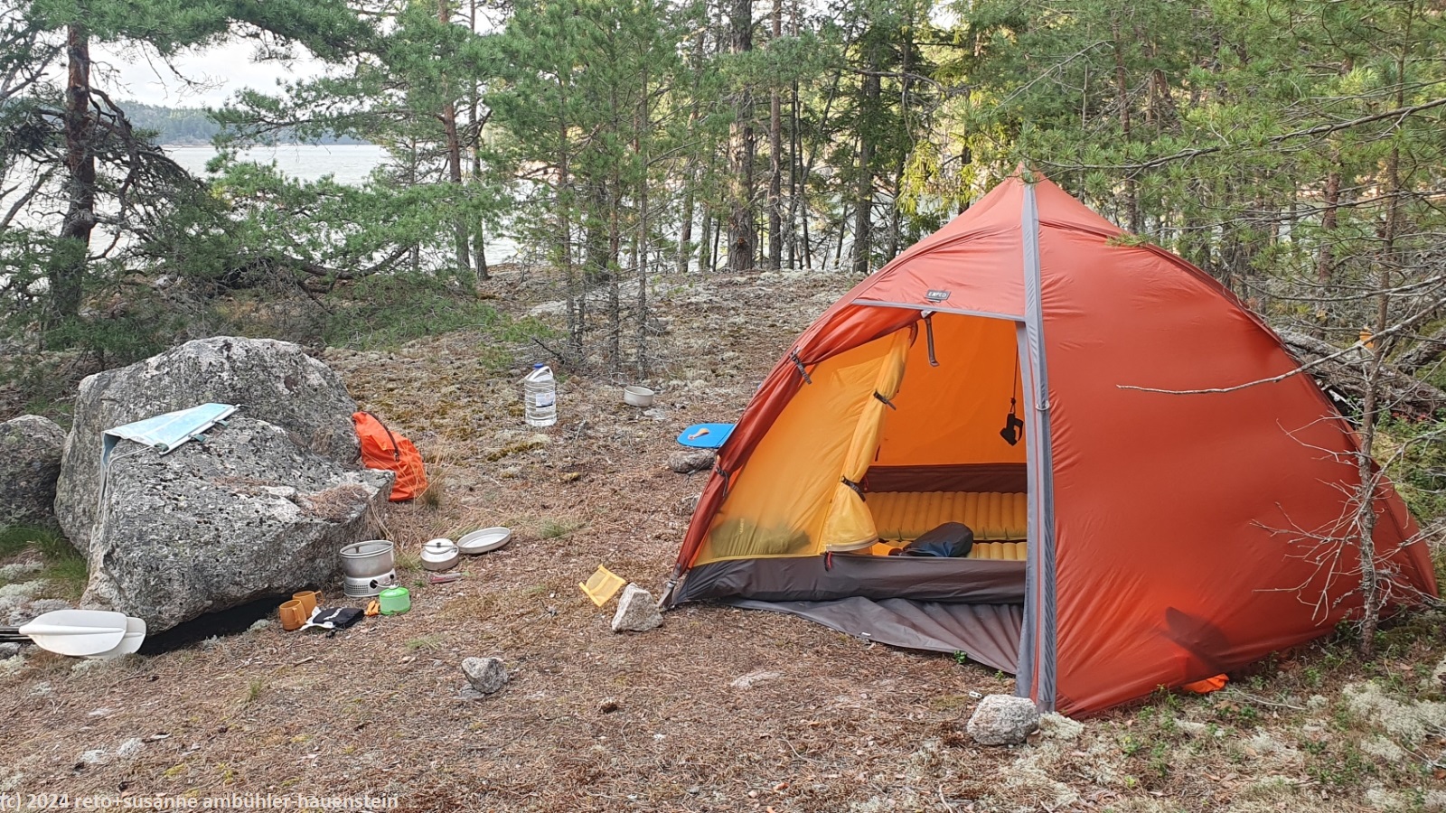 wir wechseln noch einmal die kleider und nehmen den letzten abschnitt für heute in angriff. während wir ostwärts paddeln haben wir rückenwind und kommen entsprechend rasch voran. fast zu schnell, denn beinahe wären wir in den vikom viken gerudert. am eingang zur bucht bemerken wir den fehler und müssen etwa 300 meter zurück paddeln, um nördlich an der landzunge pepparstrand vorbei zu kommen. hier treffen wind und wellen seitlich auf uns er boot, das ist sehr unangenehm. wir folgen nun dem nördlichen ufer der insel lillandet, an deren küste sich die bucht mit der übernachtungsmöglichkeit befinden soll. dabei paddeln wir erst durch den ramsdals fjärden und dann durch den hangslax fjärden. allerdings folgt auch hier ein strandhaus dem anderen, so dass wir uns etwas sorgen machen, ob das wirklich etwas wird. an der angegebenen stelle befindet sich die kleine landzunge källarudden und auf dieser hat es etwas erhöht einen wald. hier richten wir uns für die nacht ein.