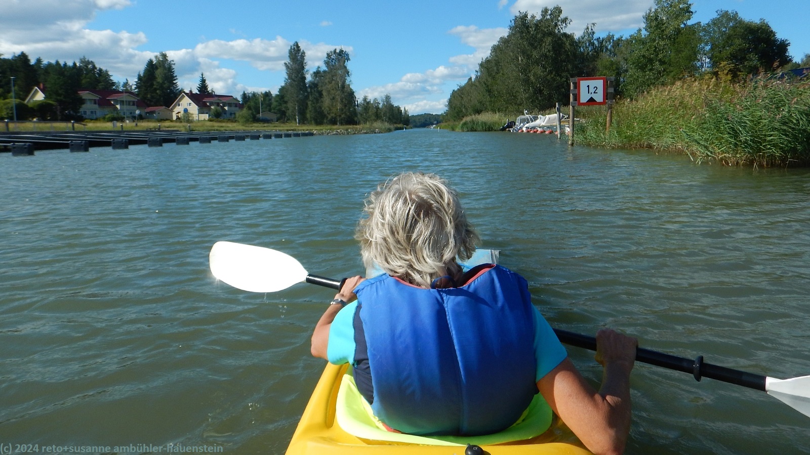 da wir von ihm keine rückmeldung erhalten, landen wir beim südlichen ende des kanals kyrksundet nochmals und rufen hannu an um die rückgabe des kajaks auszumachen. die fahrt durch den schmalen kanal ist locker. aber ab dem nordende der stadt haben wir noch einmal richtig gegenwind. als wir das haus des kajakclubs erreichen, kommt hannu auch gerade.