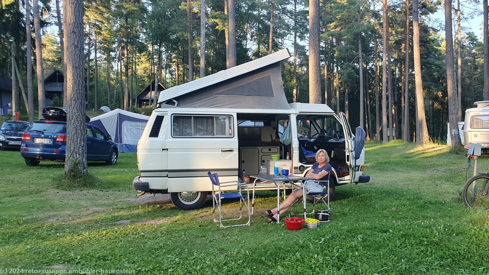 wir retournieren die ausrüstung. hanno meint, er hätte dieses boot selber entworfen. da hat er einen super job gemacht ! wir verabschieden uns von hannu und bedanken uns nochmals für den tollen service. nachdem wir unser gepäck im jogi verstaut haben, registrieren wir uns beim campingplatz. wir werden äusserst freundlich empfangen. wir suchen uns einen schönen stellplatz und geniessen anschliessend eine sehr erfrischende dusche. danach fahren wir zum nahen supermarkt und kaufen lebensmittel für heute abend und morgen früh. zurück auf dem campingplatz kocht susanne ein köstliches abendessen, welches wir im freien geniessen. der naturnahe platz ist schön gelegen in einem lichten wald.