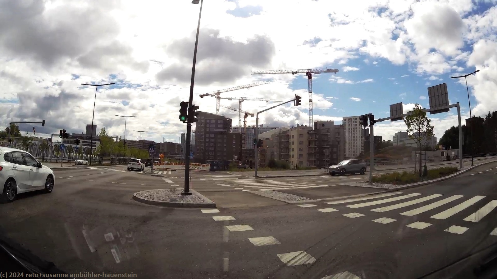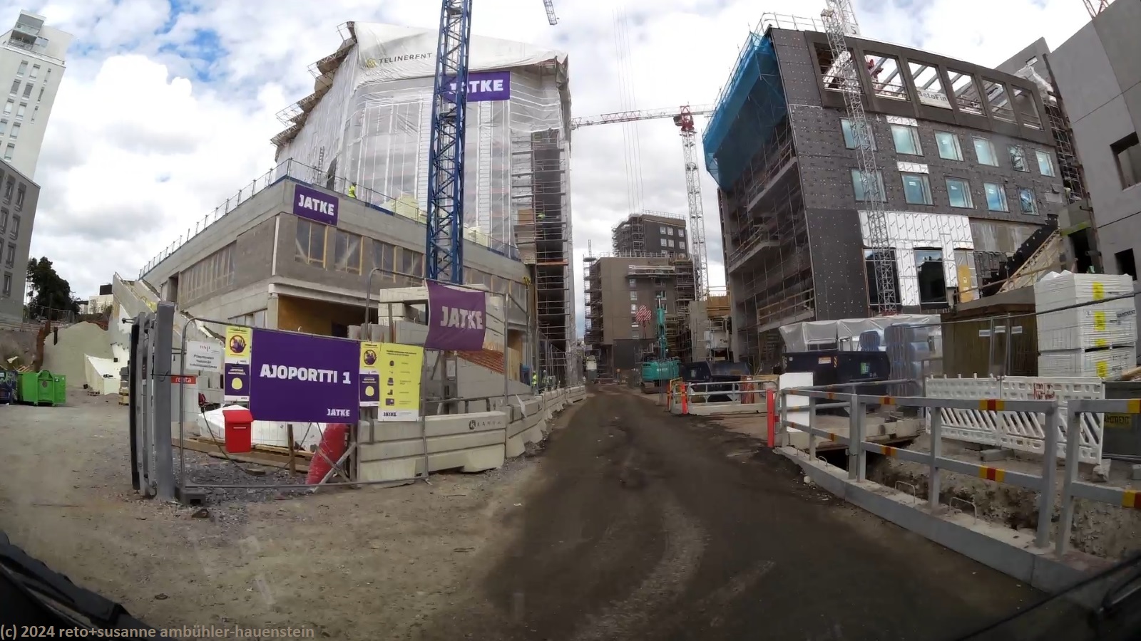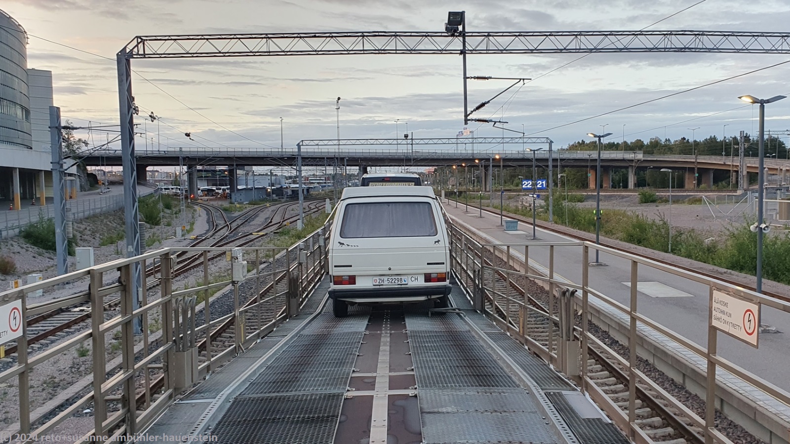 wir stehen gegen 08:30 uhr auf und frühstücken im freien. der himmel ist bewölkt, es gibt kaum sonne. die temperatur ist angenehm. nach dem abwaschen packen wir zusammen. die fahrt nach pasila verläuft entspannt. die zufahrt zur autoverladestation ist immer noch extrem chaotisch. auch wenn der bahnhof nun fertig ist, so hat es trotzdem nichts als baustellen entlang der zufahrtsstrasse.