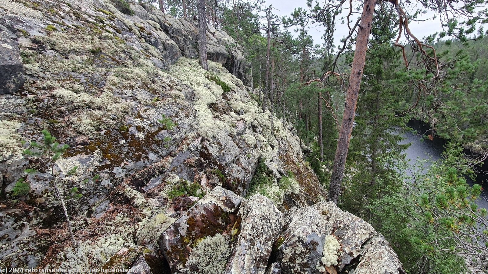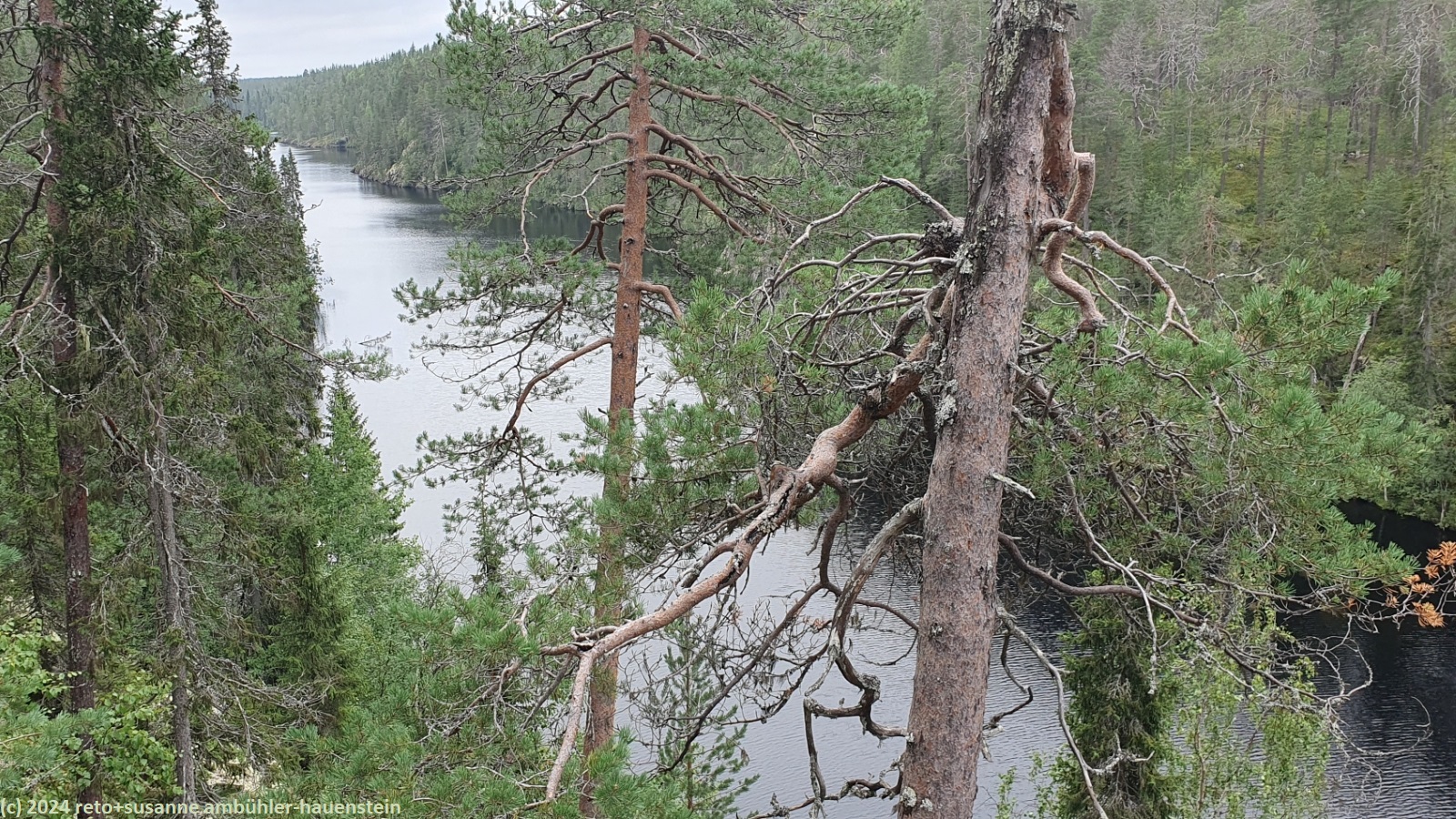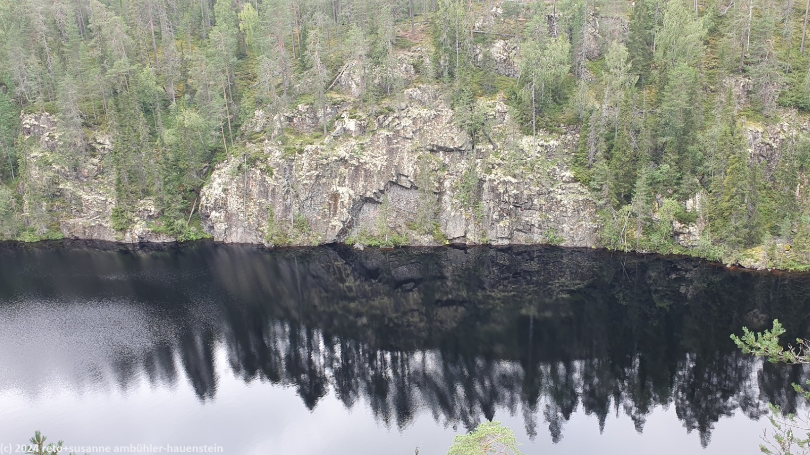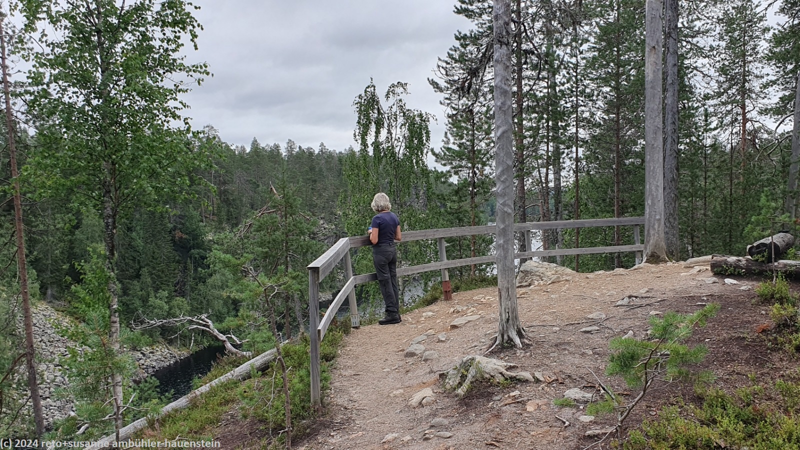 wir schlafen bis 08:45 uhr. nach dem frühstück im wagen fahren wir zum julma-ölkky, wobei wir auch heute über eine holprige, unbefestigte strasse zum ausgangspunkt unserer rundwanderung gelangen. diese führt uns um die langgezogene schlucht des julma-ölkky, ein schmaler see, der bis zu 50 meter tief sein soll. die steilen felswände überragen die wasseroberfläche nochmals um bis zu 50 meter. der schmale pfad ist ein auf und ab. wir wandern auf der ostseite bis zum nördlichen ende der schlucht. dabei kommen wir auf etwa halbem weg an der hängebrücke vorbei, welche den see überspannt, zur zeit aber geschlossen ist. es ist schon bald 13:30 uhr, als wir bei der schutzhütte ölökynperä picknicken. obwohl uns unterwegs kaum jemand begegnet ist, hat es hier erstaunlich viele menschen. auf dem rückweg zum ausgangspunkt folgen wir dem westlichen rand der schlucht. auch hier gibt es einige schöne aussichtspunkte. zurück beim parkplatz holen wir uns beim kiosk kaffee und eine zimtschnecke. während wir zum campingplatz zurück fahren, zeigt sich die sonne. wie schon gestern geniessen wir erst die sauna und dann das abendessen im freien. den abend verbringen wir am computer.