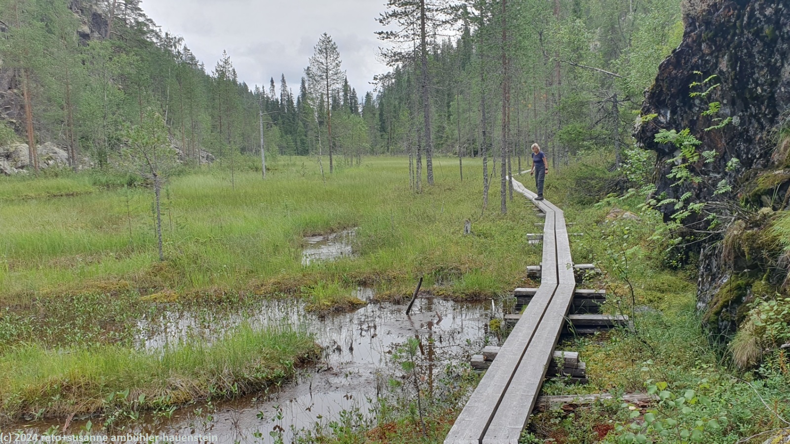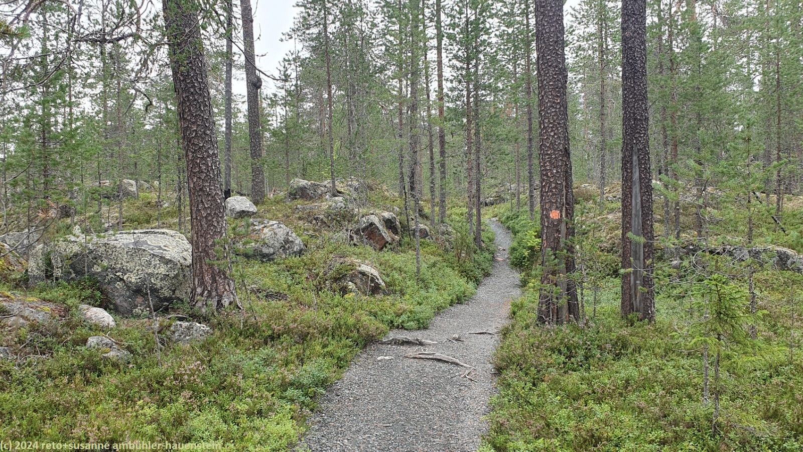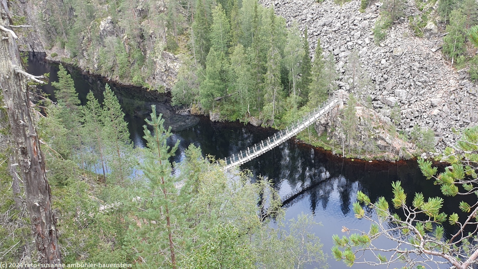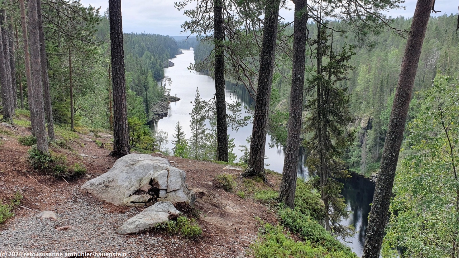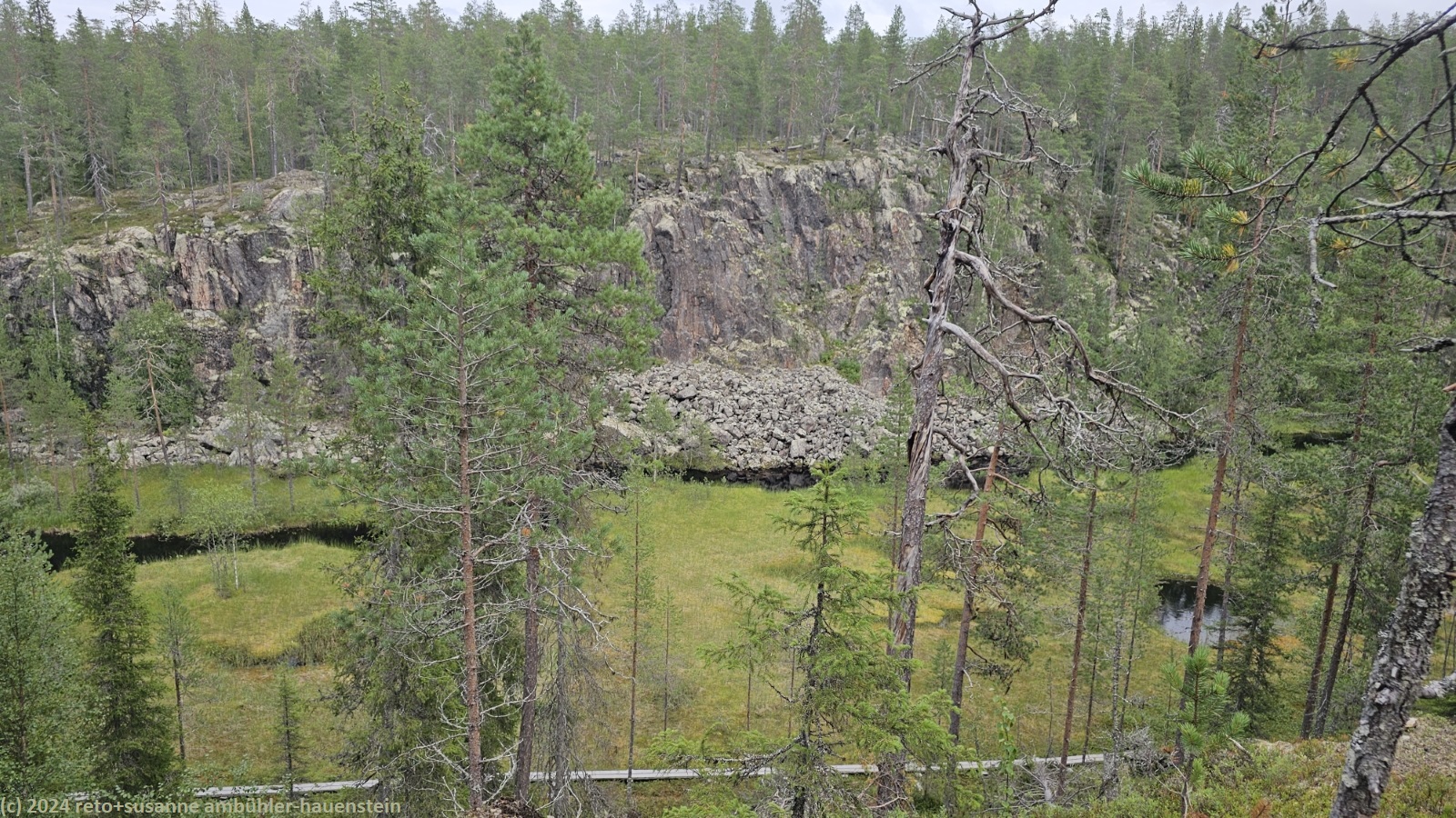 wir schlafen bis 08:45 uhr. nach dem frühstück im wagen fahren wir zum julma-ölkky, wobei wir auch heute über eine holprige, unbefestigte strasse zum ausgangspunkt unserer rundwanderung gelangen. diese führt uns um die langgezogene schlucht des julma-ölkky, ein schmaler see, der bis zu 50 meter tief sein soll. die steilen felswände überragen die wasseroberfläche nochmals um bis zu 50 meter. der schmale pfad ist ein auf und ab. wir wandern auf der ostseite bis zum nördlichen ende der schlucht. dabei kommen wir auf etwa halbem weg an der hängebrücke vorbei, welche den see überspannt, zur zeit aber geschlossen ist. es ist schon bald 13:30 uhr, als wir bei der schutzhütte ölökynperä picknicken. obwohl uns unterwegs kaum jemand begegnet ist, hat es hier erstaunlich viele menschen. auf dem rückweg zum ausgangspunkt folgen wir dem westlichen rand der schlucht. auch hier gibt es einige schöne aussichtspunkte. zurück beim parkplatz holen wir uns beim kiosk kaffee und eine zimtschnecke. während wir zum campingplatz zurück fahren, zeigt sich die sonne. wie schon gestern geniessen wir erst die sauna und dann das abendessen im freien. den abend verbringen wir am computer.