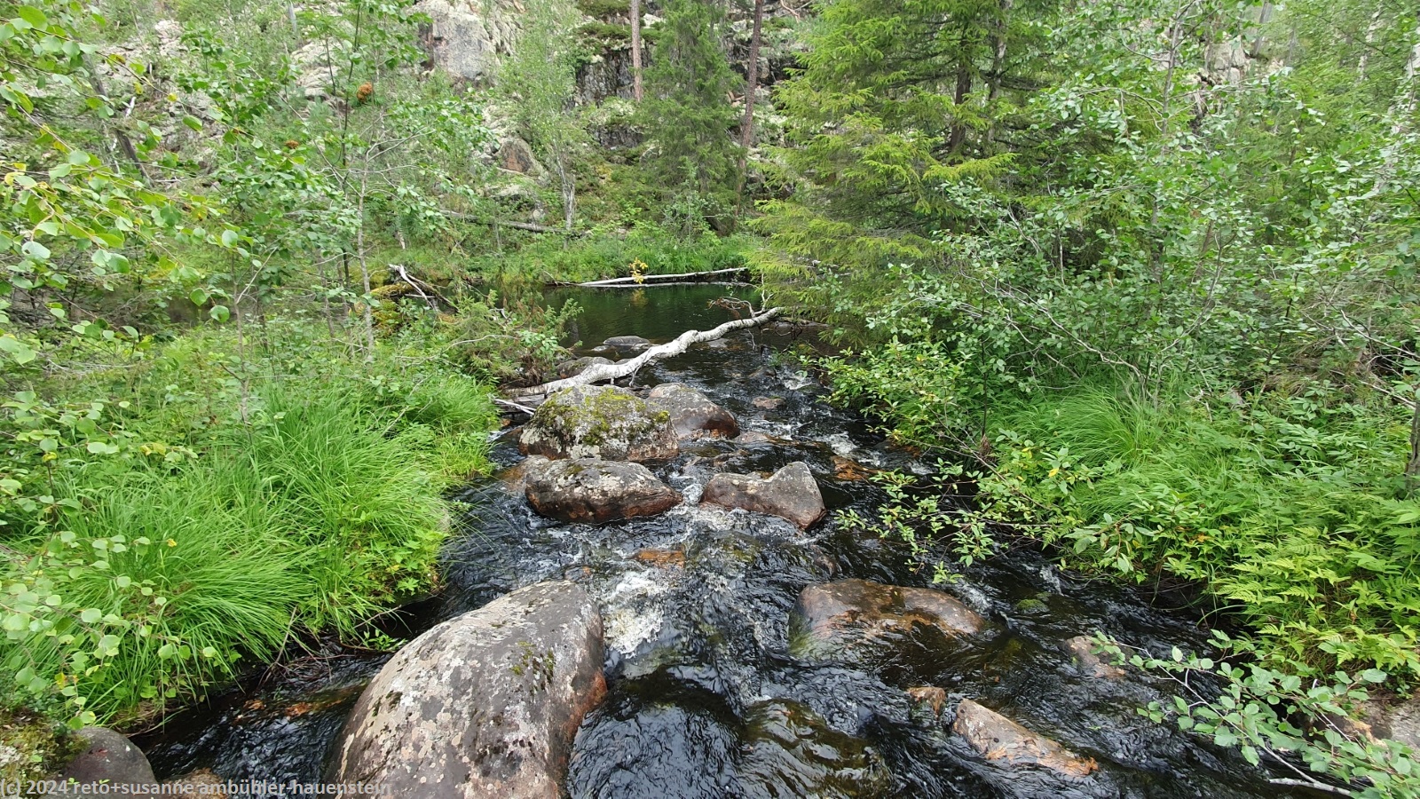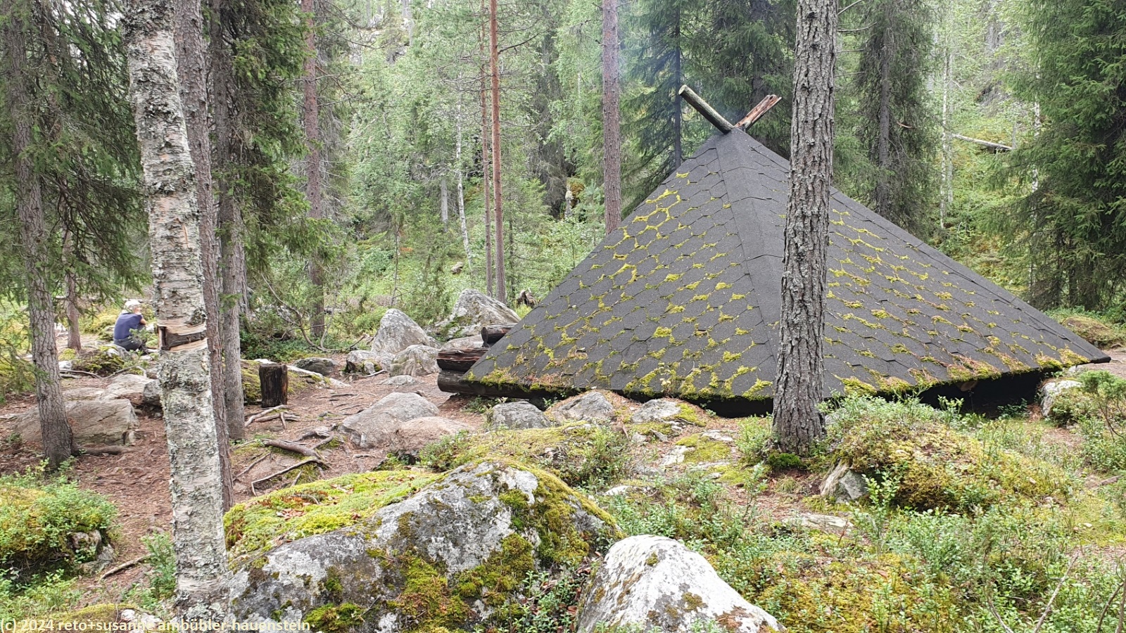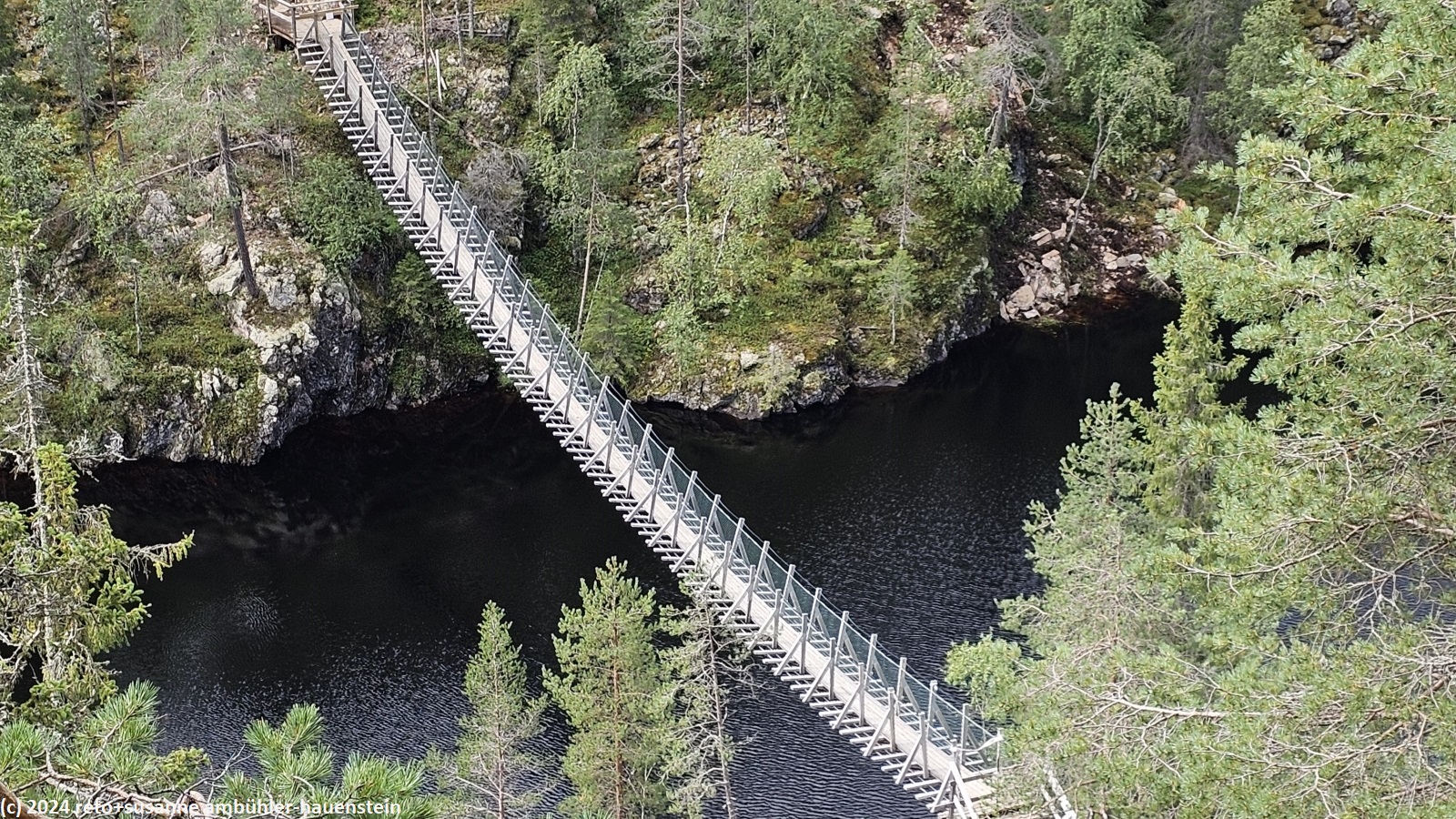 unsere heutige wanderung führt uns rund um den gleichnamigen see. obwohl "see" nicht ganz passend ist: das schmale und langgezogene gewässer befindet sich in einer schlucht, deren wände bis zu 50 meter über die wasseroberfläche hinaus ragen. der see soll noch einmal bis 50 meter tief sein. eine solche schlucht ist in finnland eher eine seltenheit. wir wandern auf der östlichen kante nordwärts. der wald ist gegenüber der gestrigen wanderung abwechslungsreicher, vielfältiger und wilder. der weg ist holpriger und manchmal geht es ziemlich steil auf- oder abwärts, wenn auch immer nur ganz kurz. auch die stege durch die sumpfgebiete fehlen nicht. auf etwa halbem weg befindet sich die spektakuläre hängebrücke, welche den canyon überspannt. diese brücke ist allerdings zur zeit wegen wartungsarbeiten geschlossen. offenbar wurde sie bei einem unwetter im juni stark beschädigt. wir wollten zwar nicht über diese brücke gehen, aber der blick von derselben wäre bestimmt eindrücklich gewesen. wir setzen unsere wanderung fort und sind kurz nach 13:20 uhr bei der schutzhütte ölökynperä. hier essen wir zu mittag. mit dieser schutzhütte haben wir den nördlichsten punkt unserer rundwanderung erreicht.