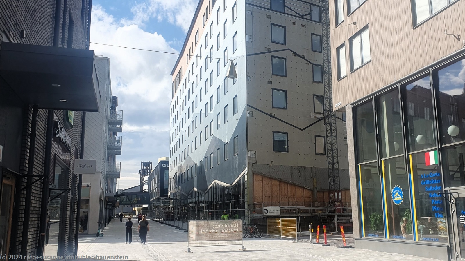 uns scheint, gegenüber dem vorjahr hat sich nicht viel getan. rund um die bereits erstellten hochhäuser wird weitergebaut. wir essen wieder im cafe oscar zu mittag und geniessen da auch kaffee und kuchen. danach kaufen wir für susanne eine aktuelle strassenkarte von schweden sowie lebensmittel für das heutige nachtessen.