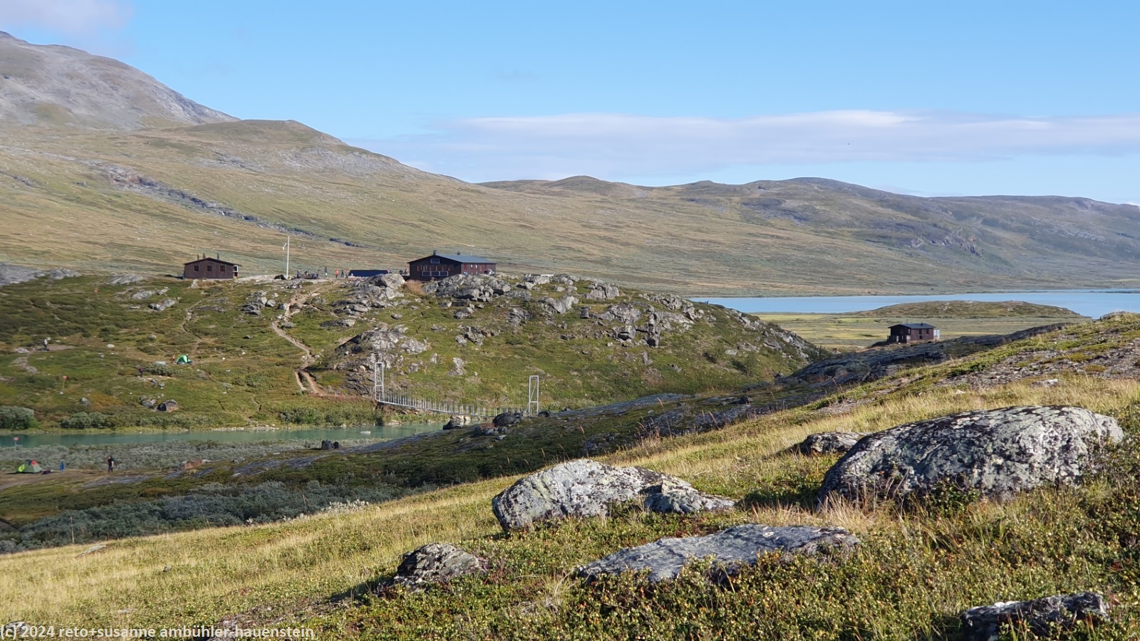 35 minuten später brechen wir wieder auf und passieren den checkpoint. hier können sich die teilnehmenden verpflegen und wohl auch pflegen lassen. unmittelbar nach dem checkpoint müssen wir den breiten zufluss sielmmánjira des aliseatnu durchqueren. ein crew member des fjällräven classic zeigt uns, wo der fluss am besten zu durchqueren ist. es gelingt uns, trockenen fusses ans andere ufer zu kommen, das war ein guter tipp. nun sind es noch zwei kilometer bis zum tagesziel. längst sehen wir die stuga auf der anderen seite des tals. der ceavccanjira hat eine tiefe schlucht ins gelände geschnitten. eine hängebrücke überspannt die schlucht. sie befindet sich etwas südlich der stuga, wir gehen deshalb an letzterer vorbei. auf der anderen talseite geht es dann einige hundert meter nordwärts zurück zur stuga. wir erreichen diese gegen 14 uhr.