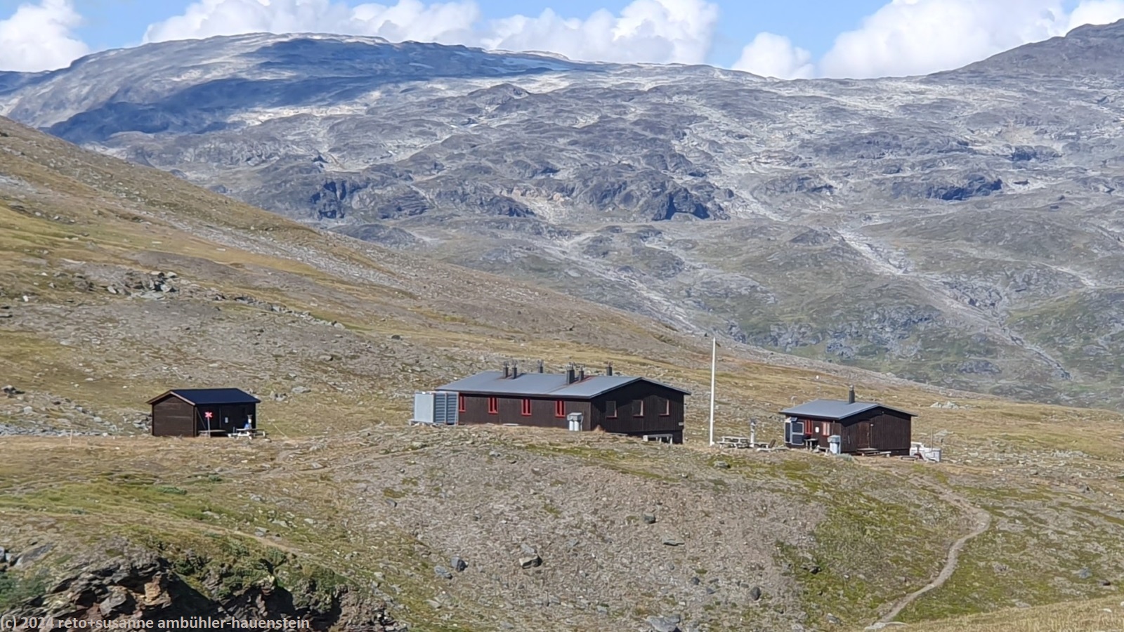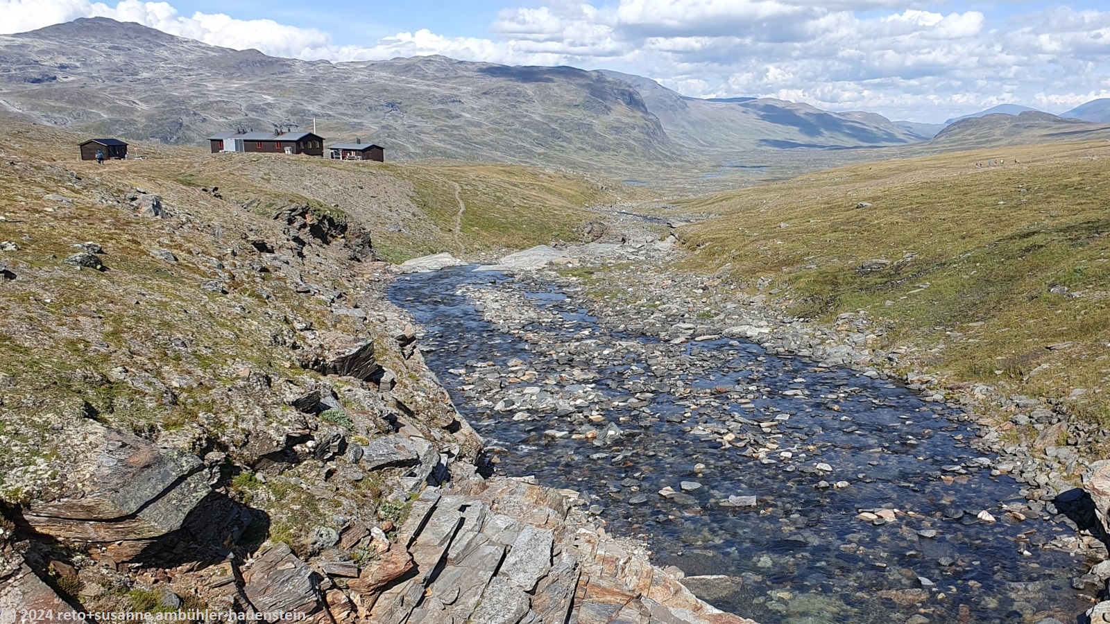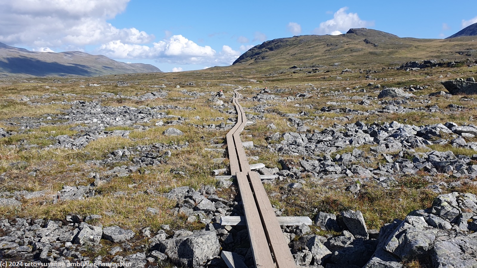die nacht war sehr ruhig. ich habe bestens geschlafen, meine frau etwas weniger gut, da sie von kopfschmerzen geplagt wird. als wir um 07:30 uhr aufstehen, scheint die sonne, der himmel ist leicht bewölkt. allerdings bläst ein kräftiger südwind, dieser dürfte die ursache für die kopfschmerzen sein. wir frühstücken in der küche, danach wischen wir um unseren tisch. nachdem wir unsere rucksäcke gepackt haben, machen wir auch in unserem zimmer sauber. gegen 9 uhr brechen wir auf. um die fjällstube herrscht reger betrieb. heute begegnet uns wohl der grösste teil der fjällräven classic teilnehmenden. wir überqueren die hängebrücke südlich der stuga, danach wandern wir bei herrlichem wetter durch eine fantastisch schöne landschaft. auch die heutige strecke sind wir schon einmal gewandert, siehe tagebuch vom 07-aug-2017. damals haben wir allerdings unser heutiges tagesziel - die tjäktjastuga - ausgelassen und sind direkt zu den sälkastugorna durchgewandert. dieses jahr nehmen wir es gemütlicher und übernachten in jeder stuga entlang der route. der kungsleden folgt dem aliseatnu. dieser fliesst durch ein breites tal. im westen sehen wir zwischen den gipfel kleine eisfelder. im laufe des aufstieges richtung tjäktjapass müssen wir mehrmals kleinere flüsse durchqueren. die teilnehmenden des fjällräven classic kommen uns nun fast ununterbrochen entgegen. gemäss aussage des hütenwartes bei der alesjaure stuga sind es 1800 teilnehmende. meistens laufen sie in gruppen, manchmal kommt uns auch eine einzelne person entgegen. es hat auffallend viele asiaten, insgesamt sind es teilnehmende aus 24 verschiedenen ländern. auffallend ist aber auch, dass absolut kein abfall herum liegt. die disziplin der teilnehmenden ist diesbezüglich enorm. ebenso bezüglich des kreuzens auf den bohlen. fast alle warten oder weichen aus, wenn wir uns auf einem steg kreuzen. kurz nach 12:30 uhr sind wir kurz vor einem checkpoint des fjällräven classic. in einer kleinen mulde essen wir zu mittag. hier sind wir ein bisschen vor dem wind geschützt.