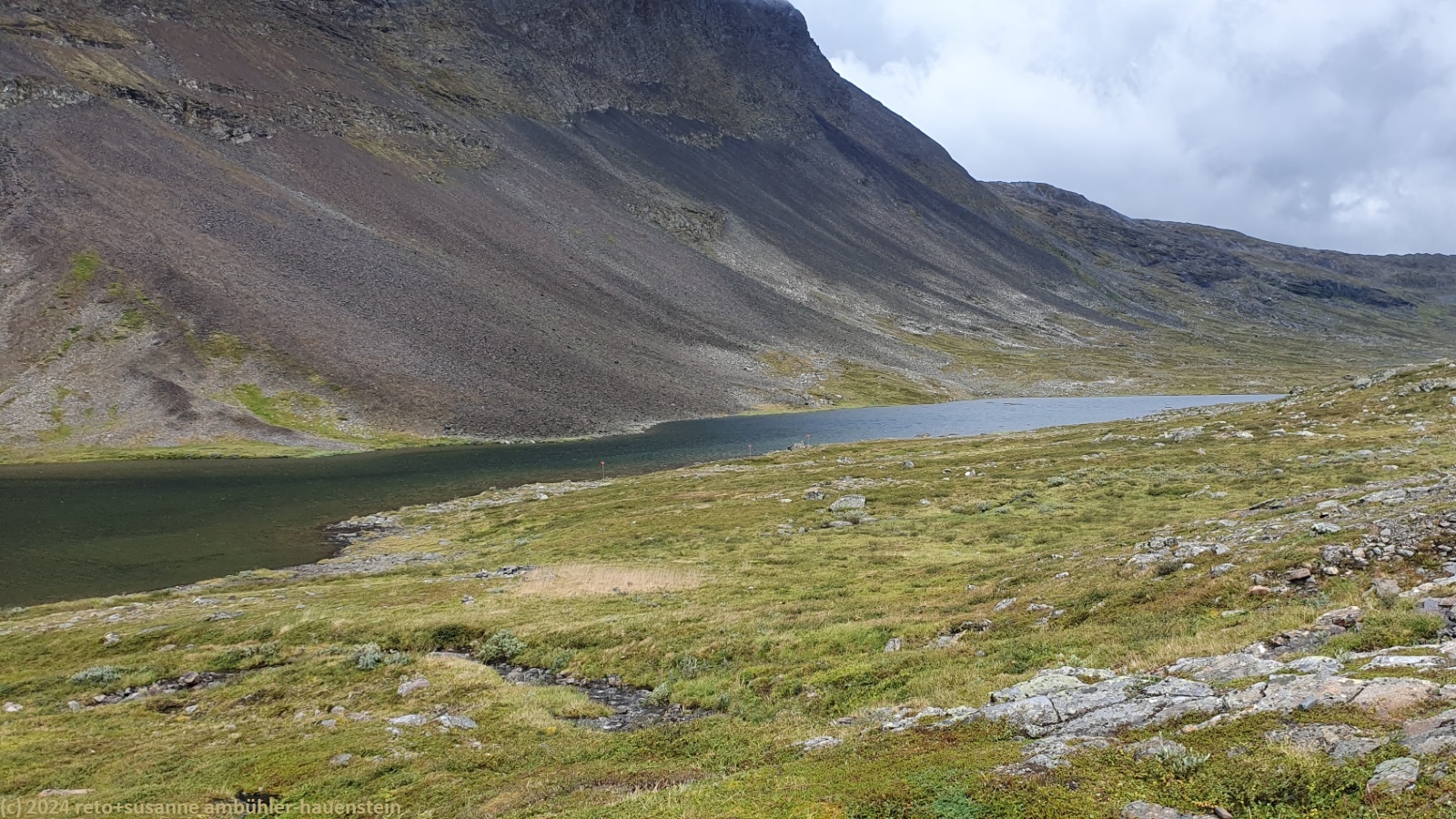 da heute vorallem für den vormittag starker regen angesagt ist, verzichten wir darauf, einen wecker zu stellen. die nacht ist sehr ruhig, wir schlafen bestens. um 07:45 uhr stehen wir auf. das deutsche pärchen ist bereits in der küche. wir bereiten ebenfalls unser frühstück zu. draussen bläst ein stürmischer wind und es regnet. in der nacht war es noch trocken, aber nun entleeren sich die grauen, tiefliegenden wolken. gegen 09:10 uhr sind wir startbereit. wir haben regenhosen und regenjacken angezogen und auch an den rucksäcken die regenschütze montiert. heute folgen wir nicht mehr dem kungsleden, sondern wir wandern auf dem "dag hammarskjöldsleden" westwärts richtung nikkaluokta. genau genommen waren wir schon die ganze zeit auf diesem als "moderner pilgerweg" bezeichneten pfad unterwegs, denn dieser führt von abisko nach nikkaluokta, dies ist exakt unsere route. entlag des "dag hammarskjöldsleden" hat es sieben sogenannte "meditationsplätze" wo menschen ihre "innere ruhe" finden können. der pilgerweg hat einen religösen hintergrund, siehe website der schwedischen kirche. unser heutiges ziel ist die kebnekaise fjällstation. von dieser strecke sind wir nur die letzten kilometer schon einmal gewandert, als wir von der kebnekaise fjällstation aus einen tagesausflug zum silverfallet gemacht hatten, siehe tagebuch vom 24-jul-2013. der weg steigt sofort an. vor uns liegen 150 höhenmeter bis zum lássajávri. es regnet und es bläst immer noch dieser kräftige wind. eigentlich hatte ich erwartet, dass wir heute rücken- oder zumindest seitenwind hätten, aber der wind bläst uns direkt ins gesicht. während dem aufstieg intensiviert sich der regen. erst als wir die passhöhe erreicht haben, lässt er etwas nach. wir wandern nun ins hübsche tal des láddjujohka. anfangs hat es einige seelein, dann geht es dem fluss entlang. eher überraschend macht der regen etwas pause. wir nutzen die gelegenheit, setzen uns auf einen grossen stein am wegrand und essen einen stengel. kaum brechen wir wieder auf, beginnt der regen erneut und nun ziemlich heftig. der pfad ist entsprechend matschig mit vielen pfützen. manche steine sind sehr rutschig, so dass man stets auf der hut sein muss. wir überstehen die holprige wanderung schadlos. gegen 12:15 uhr halten wir ausschau nach einer gelegenheit um zu mittag zu essen. schutzhütten gibt es an dieser strecke leider keine. susanne entdeckt etwas abseits des weges einen mächtigen felsen, der dank seiner schrägen form etwas schutz vor dem regen bietet. wir setzen uns unter den vorsprung und essen unsere sandwiches.