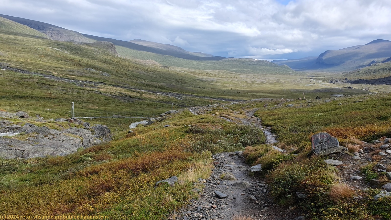 da ein nasser vormittag zu erwarten ist, schlafen wir bis 07:45 uhr. als wir um 09:10 uhr aufbrechen herrscht übles regenwetter. wir folgen nun nicht mehr dem kungsleden, sondern dem als "moderner pilgerweg" bezeichneten "dag hammarskjöldsleden". auf den ersten knapp 3 km überwinden wir 150 höhenmeter. nach der passhöhe wandern wir durch das tal des láddjujohka. als der regen kurz pause macht, setzen wir uns auf einen grossen stein am wegrand und essen einen stengel. der regen hat den pfad in einen schlammigen und pfützenreichen matsch verwandelt. gegen 12:15 uhr finden wir unter einem schrägen felsen etwas schutz und essen unsere brote. als wir wieder aufbrechen schüttet es immer noch. wir kämpfen uns durch sumpf und schlamm. inzwischen sind wir völlig durchnässt. eher überraschend gibt es auf den letzten kilometern doch noch ein paar sonnenstrahlen. kurz nach 14:30 uhr erreichen wir unser tagesziel. die kebnekaise fjällstation ist gemäss aussage der dame am empfang völlig ausgebucht. wir teilen unser 4-bett-zimmer mit einem jungen pärchen. nach einer erfrischenden dusche verbringen wir den nachmittag im gut besuchten aufenthaltsraum des hauptgebäudes. für das nachtessen dürfen wir uns im restaurant ans fenster setzen, das ist toll. um 19 uhr besuchen wir die sauna, den abend verbringen wir im aufenthaltsraum.