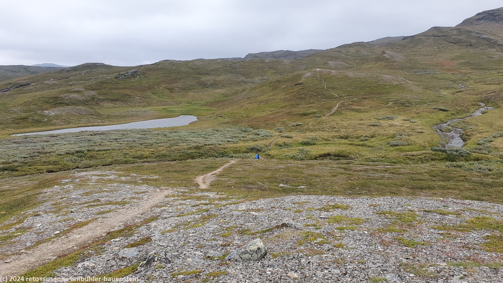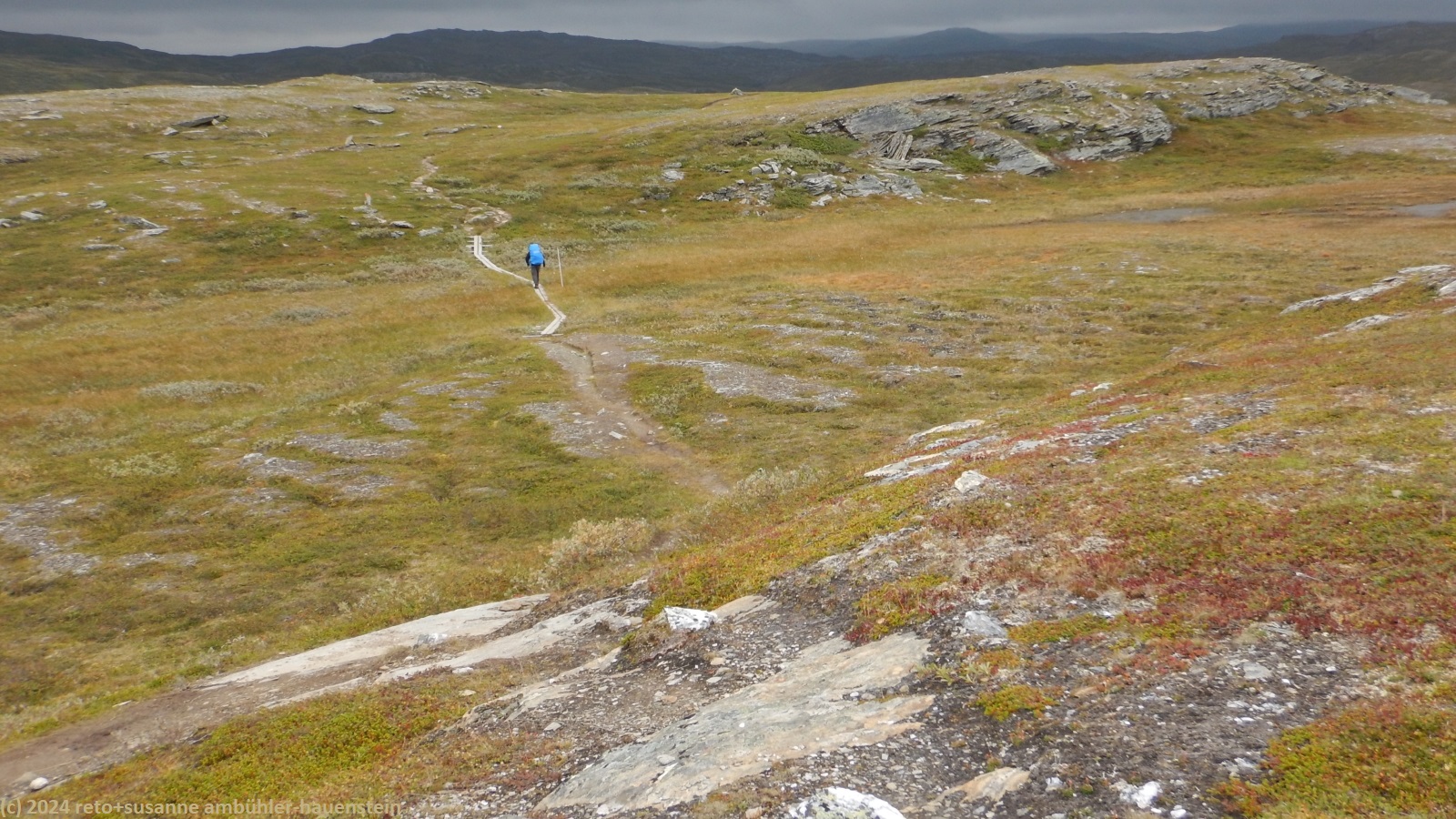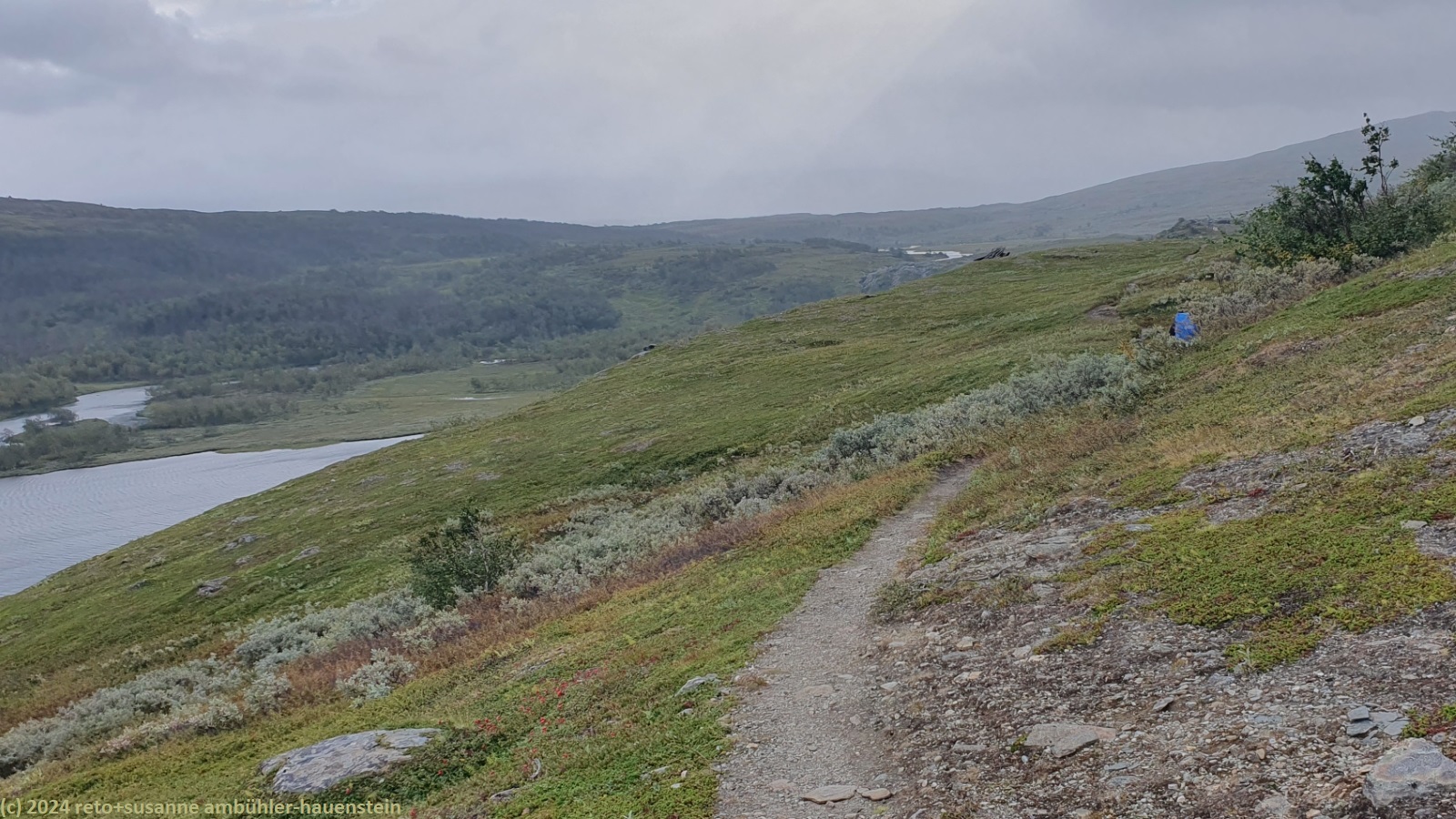 unser handy weckt uns um 7 uhr. die nacht war äusserst ruhig, ich habe sehr gut geschlafen. auch jetzt ist es im haus immer noch völlig still, offenbar sind noch alle gäste am schlafen. wir frühstücken im aufenthaltsraum mit blick auf den see. der himmel ist immer noch sehr verhangen und trüb, der wind bläst wie schon seit tagen. nach dem essen packen wir unsere rucksäcke, danach reinigen wir unser zimmer und den hintereingang. um 08:50 uhr brechen wir auf. wir überqueren die hängebrücke über den gieddejåhkå, danach steigt der weg sanft an. wenig später zweigt der nordkalottleden richtung süden ab. wir folgen dem padjelantaleden vorwiegend ostwärts. anfangs wandern wir durch niedrige birken, bei 630 m.ü.m. kommen wir über die baumgrenze. das kahle fjäll ist sehr grün, dazwischen sehen wir gelbliche und rötliche sträucher. es fällt ein leichter nieselregen, der manchmal etwas intensiver wird, dazwischen aber auch längere pausen macht. susanne hat die regenjacke angezogen, ich laufe im langarm t-shirt. am gieddávrre vorbei geht es ins weite tal des rådoljåhkå. der pfad ist grundsätzlich einfach und bequem zu begehen. er führt abwechslungsweise über offenes gelände und niedrige büsche. manchmal ist der weg ziemlich tief und sehr schmal, so dass nicht beide füsse nebeneinander platz haben. der aufstieg wird immer wieder durch kleine senken unterbrochen, so dass der weg ein bisschen einer berg- und talbahn ähnelt. bei der brücke über den ballavrijåhkå machen wir eine kurze pause. der fluss stürzt über mehrere kleine wasserfälle talwärts und macht einen ziemlichen lärm. ich liebe dieses geräusch. nach zehn minuten brechen wir wieder auf. am gegenüberliegenden hang scheint die sonne. das blaue loch in der wolkendecke ist stets vor uns, aber die sonnenstrahlen erreichen uns nicht. der weg steigt weiter sanft aber kontinuierlich an. wir wandern durch eine weite hochebene. die krete der bergkette rechts von uns ist in den wolken. gelegentlich sehen wir rentiere. gegen mittag finden uns die sonnenstrahlen dann doch noch. um 12:25 uhr picknicken wir in der nähe des ieltijávrásj zwischen grossen steinen.