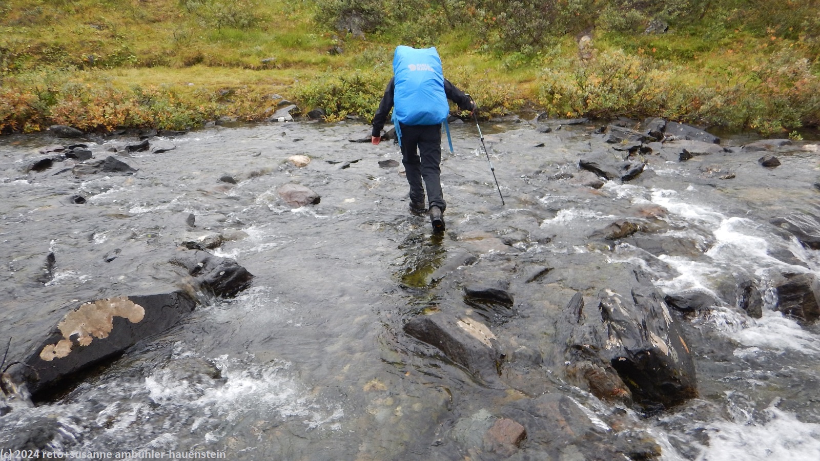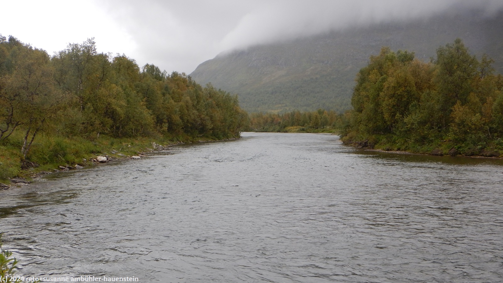 wir schlafen bis 07:15 uhr. das war wiederum eine wunderbare nacht, wir haben göttlich geschlafen. das wetter ist etwas weniger brilliant, der himmel ist verhangen und es fällt ein leichter nieselregen. der wind hat immerhin etwas nachgelassen. während wir in unserer gemütlichen hütte frühstücken, sehen wir den hüttenwart vorbeigehen. er hatte uns gestern gesagt, dass er heute morgen frisches fladenbrot backen werde und wir ab 8 uhr solches bei ihm kaufen könnten. so besuchen wir ihn nach dem frühstück in seinem büro und kaufen zwei scheiben fladenbrot. dabei erfahren wir, dass wir die vergangene nacht im sarek nationalpark verbracht hatten. das waren wir uns gar nicht bewusst. ein blick auf die karte zeigt, dass der sarek hier ein kleines stück in den padjelante nationalpark hineinragt. zurück in der hütte packen wir unsere rucksäcke, wischen den boden und entleeren das abwasser. um 09:30 uhr machen wir uns auf den weg. obwohl der himmel sehr trüb ausschaut, fällt nur ab und zu ein leichter regen. grundsätzlich wandern wir abwärts, aber auch heute ist der pfad ein auf und ab. nach knapp 800 metern gibt es schon die erste flussdurchquerung. wir entscheiden uns, die wanderschuhe auszuziehen und den fluss in unseren trockensocken zu durchqueren. es wäre schlecht, den rest des tages in nassen schuhen gehen zu müssen. wir erreichen das andere flussufer ohne probleme. nun wechseln wir das schuhwerk wieder. mit der durchquerung des gárránisjågåsj haben wir die grenze vom sarek zum padjelanta nationalpark überschritten. wenig später erreichen wir die waldgrenze. nun wechseln sich wilder birkenwald und sumpfiges gelände ab. in ersterem ist der pfad eher holprig, wenn auch nicht so sehr wie auf dem kungsleden, in letzterem geht es meistens über planken. solange wir im padjelanta nationalpark laufen, sind diese in recht gutem zustand. es ist nun meistens trocken, so dass ich meine regenjacke im rucksack verstaue. nach 6 km machen wir einen kurzen halt und essen einen stengel. die landschaft und die beschaffenheit des pfades ändern sich nur wenig. wir wandern durch das breite tal des tarrajåkkå. links und rechts säumen hügelzüge das tal. die kreten sind meistens in wolken gehüllt. nach knapp 11 km erreichen wir die parkgrenze und wechseln in das pärlälvens fjällurskog naturreservat. hier picknicken wir auf einer kleinen anhöhe. wir sehen und hören den tarrajåkkå unten im tal. am wetter ändert sich nichts, es ist trüb und windig, aber entgegen der vorhersage fast immer trocken.