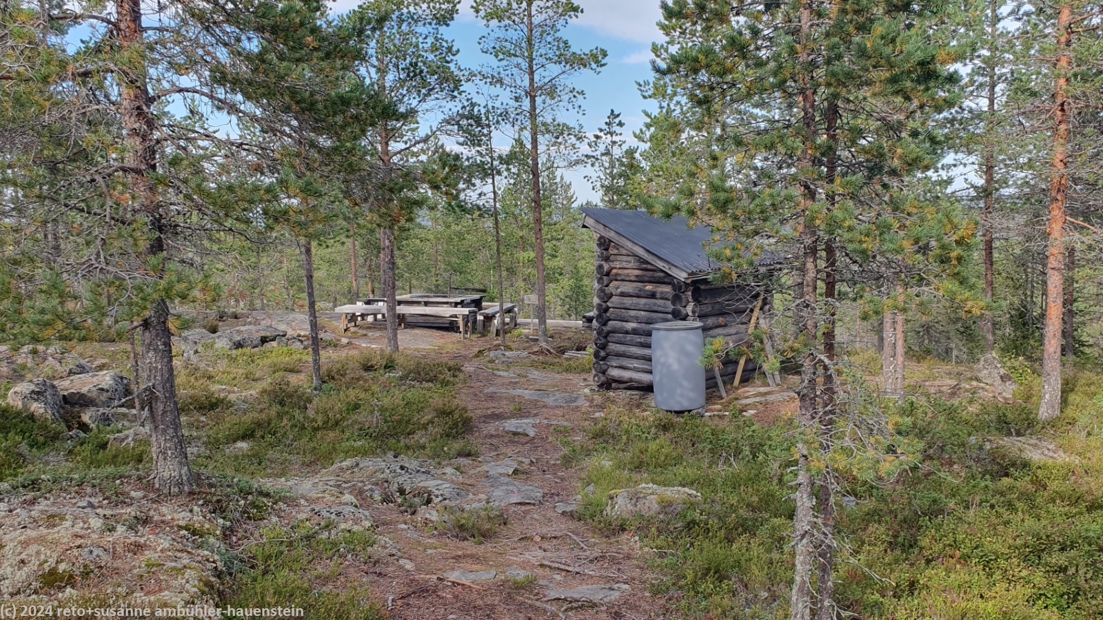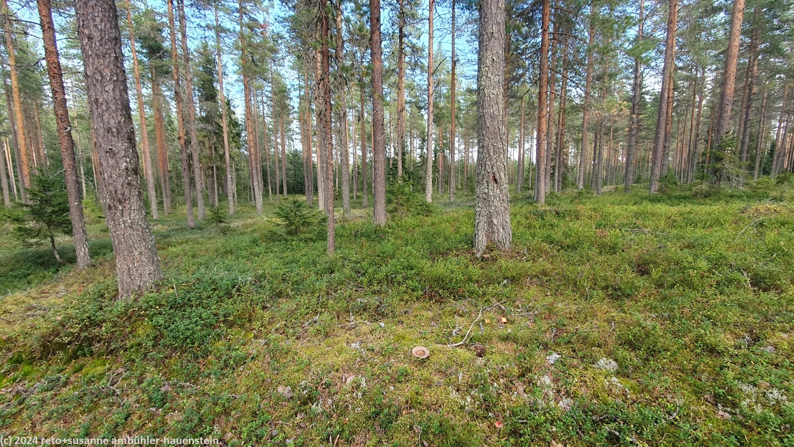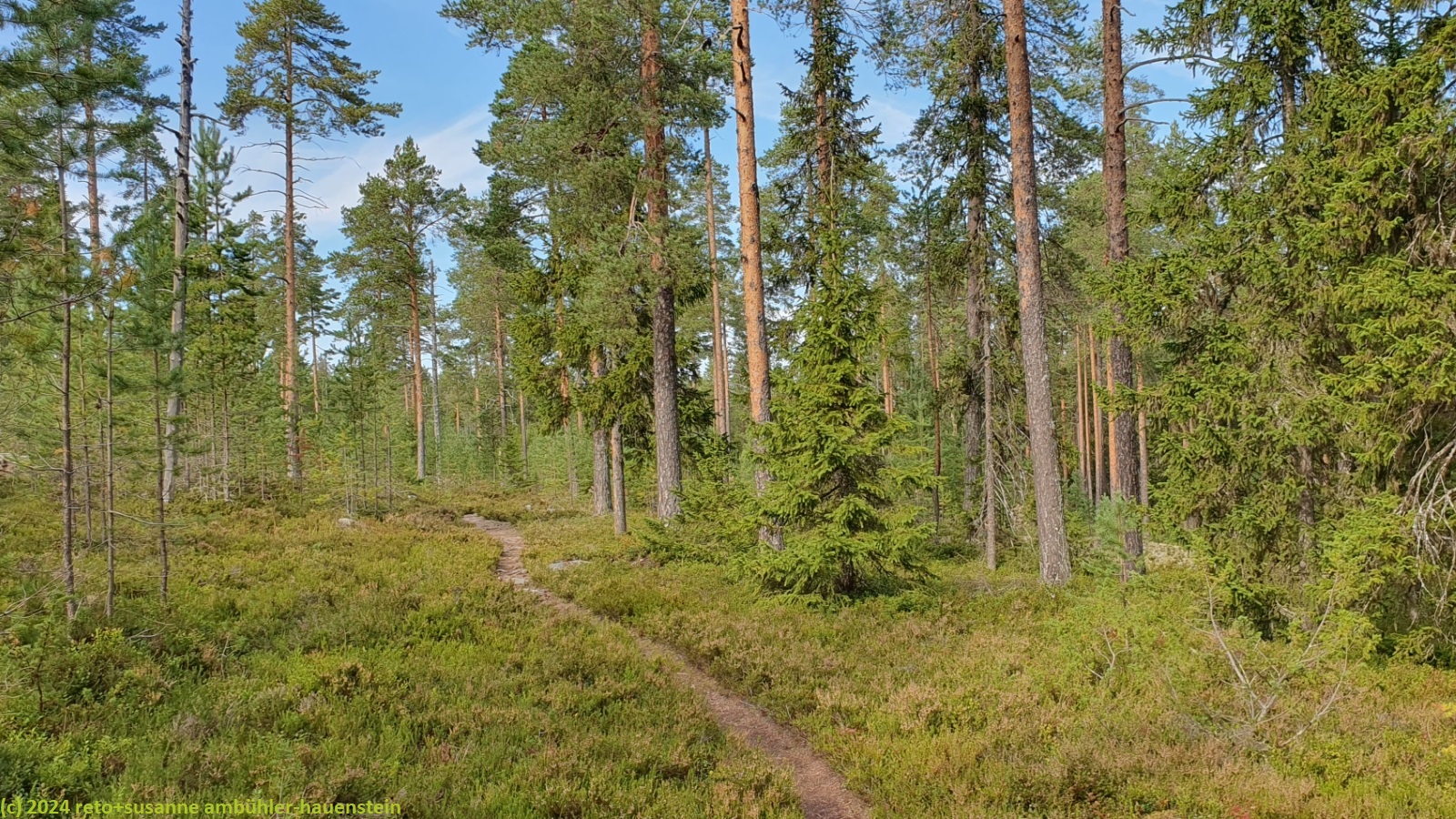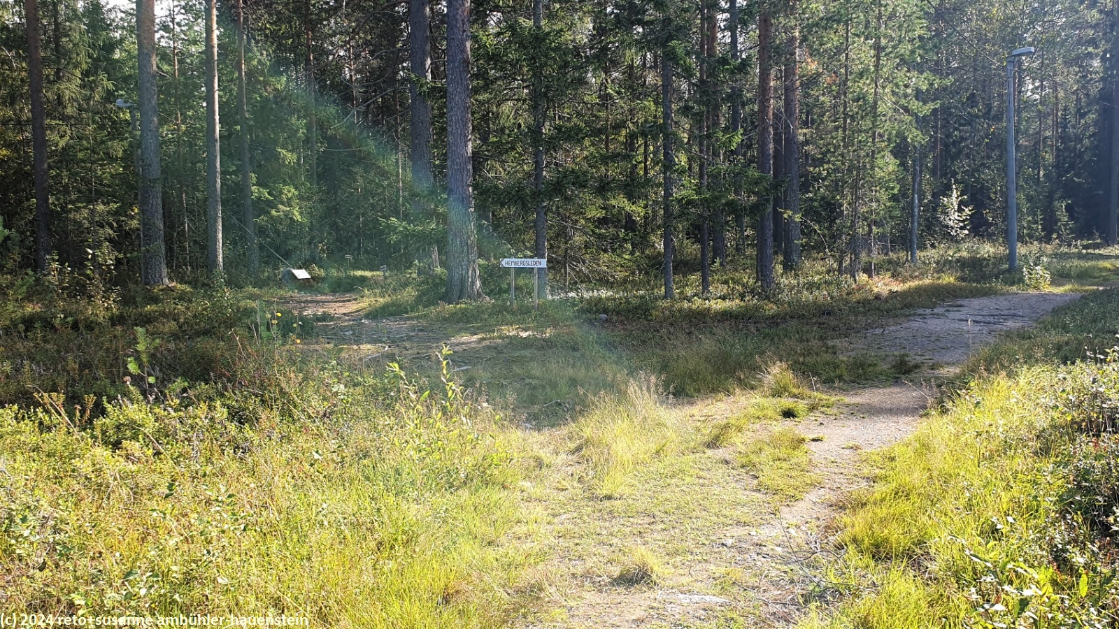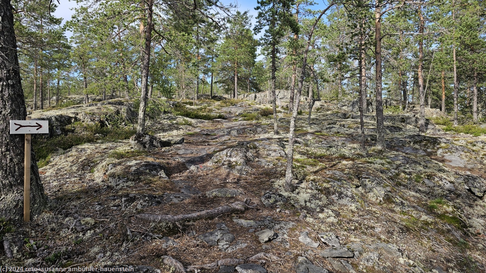 wir schlafen bis etwa 08:45 uhr. das wetter ist sehr freundlich, der himmel ist leicht bewölkt, der wind hat nachgelassen. wir gehen zum empfang und verlängern unseren aufenthalt um einen weiteren tag. zurück beim jogi müssen wir feststellen, dass der kayak-o-mat zur zeit nicht verfügbar ist. das ist äusserst blöd, wollten wir doch heute ein doppelkajak ausleihen. gestern hat das ding noch funktioniert, wir hätten ein boot mieten können. wir schauen uns den automaten an, aber da gibt es nichts, was wir tun könnten. drei doppelkajaks sind zum greifen nah und doch nicht benützbar ! auf der website steht zwar, wer für den betrieb verantwortlich ist, aber es gibt nur eine email-adresse und keine telefonnummer für soforthilfe. ich schreibe eine email, aber das wird wohl kaum etwas bringen. wir frühstücken im freien, danach überlegen wir uns, was wir tun wollen. es gibt noch den luleå kajakklubb, aber dort ist für heute kein boot verfügbar und doppelkajaks gibt es keine. wir fragen beim empfang nach. die dame bemüht sich zwar, einen kontakt für den kayak-o-mat oder einen weiteren verleih zu finden, aber viel schaut dabei nicht heraus. ich rufe die nummer an, die sie gefunden hat, aber der typ dort ist total im stress und mit irgendeiner baustelle beschäftigt, so dass er nicht wirklich zeit hat für uns. nach weiteren recherchen entschliessen wir uns, für morgen beim kajakclub zwei einzelkajaks zu mieten. dort funktioniert zumindest die website, hoffentlich klappt es dann auch mit der ausleihe. für heute entscheiden wir uns, eine wanderung über den hembergsleden zu machen. susanne hat die beschreibung dieser kurzwanderung in einer online broschüre gefunden. wir fahren nach ersnäs, dort ist der ausgangspunkt der rundwanderung. die anfahrt ist ziemlich spektakulär. von der E4 geht es erst über eine holprige strasse durch den ort und dann über feldwege zu einem kleinen parkplatz am waldrand.