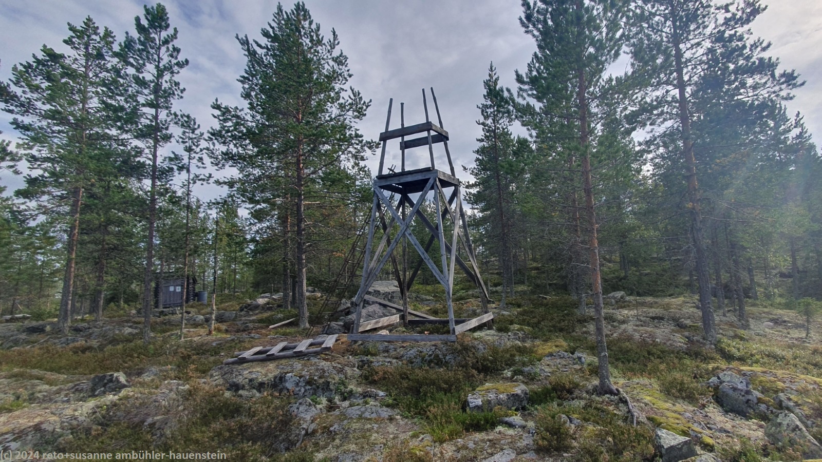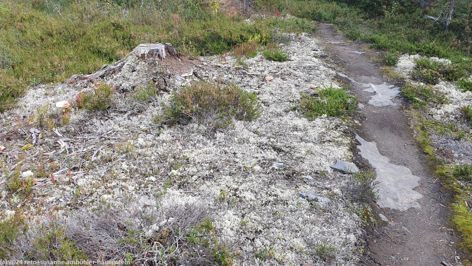 als wir gegen 08:45 uhr aufstehen, werden wir von freundlichem wetter begrüsst. noch vor dem frühstück möchten wir beim kayak-o-mat ein doppelkajak mieten, aber die einrichtung funktioniert nicht. da der kayak-o-mat gemäss website auch nach dem frühstück immer noch ausser betrieb ist, erkundigen wir uns beim empfang des campingplatzes. die dame bemüht sich zwar, hat aber auch keinen erfolg. beim lokalen kajakclub sind erst morgen kajaks verfügbar, wir verschieben daher unsere bootstour auf morgen. stattdessen fahren wir etwa 20 km südwärts und machen eine kurzwanderung auf dem hembergsleden. dies ist eine art lehrpfad mit 22 stationen zum thema wald und das leben in der umgebung. die rundwanderung führt durch einen schönen nadelwald, durch kahlgerodetes gebiet und über den 95 meter hohen hemberget. auf dem rückweg zum campingplatz gehen wir noch einkaufen. bei eher kühlem wetter geniessen wir das nachtessen im freien. während susanne nach polarlichter ausschau hält, arbeite ich im jogi am computer. kurz nach 23 uhr beginnt am nachthimmel ein tolles lichtspektakel.