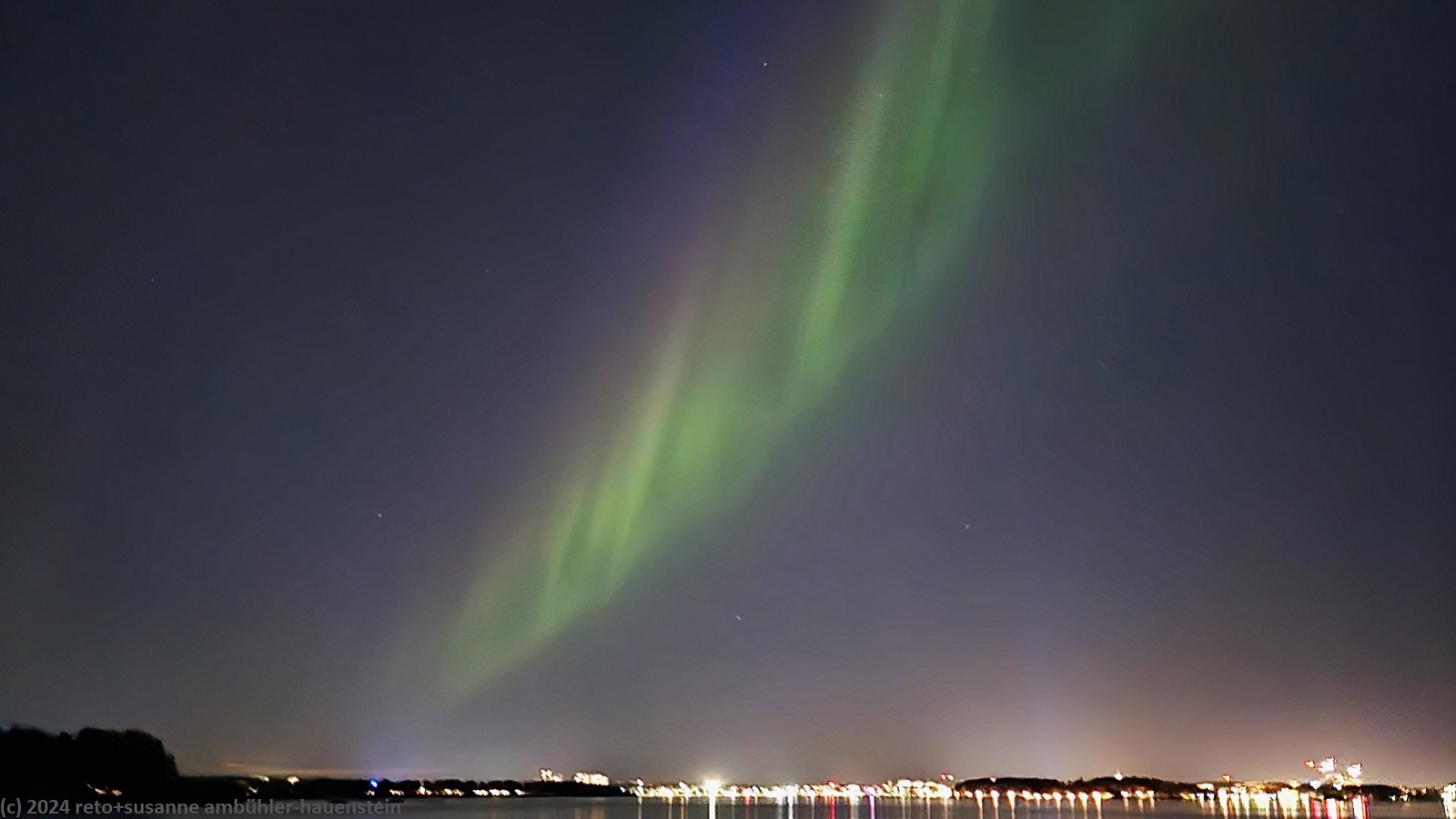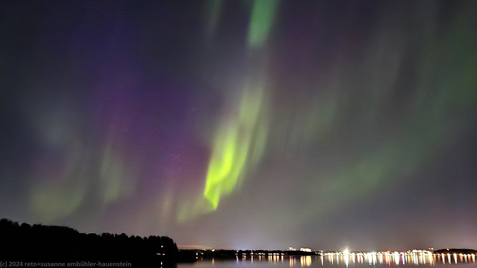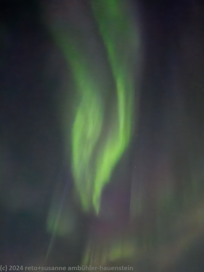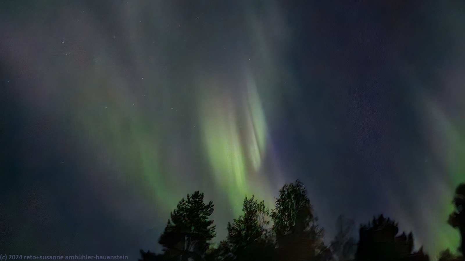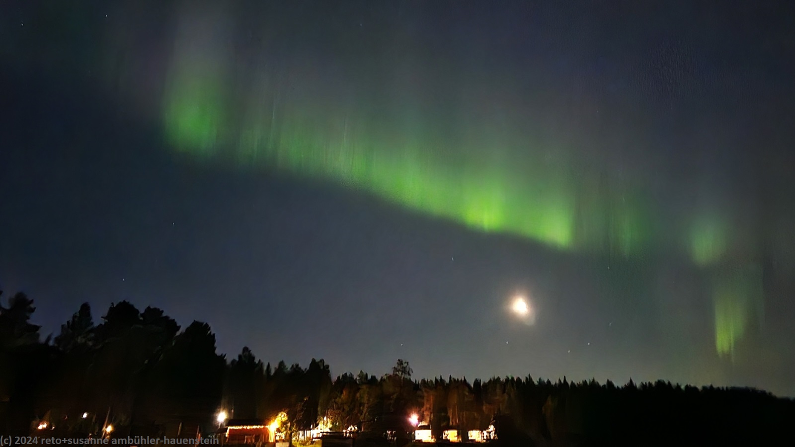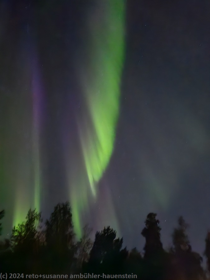 es hat etwas mehr gäste rund um unseren stellplatz. das nachtessen können wir im freien geniessen, auch wenn es ziemlich kühl ist. der himmel ist inzwischen fast wolkenlos. susanne meint, heute müsste es super sein, um polarlichter zu sehen. während sie ausschau hält, arbeite ich im jogi am computer. plötzlich ist am himmel ein gewaltiges lichtspektakel zu sehen.