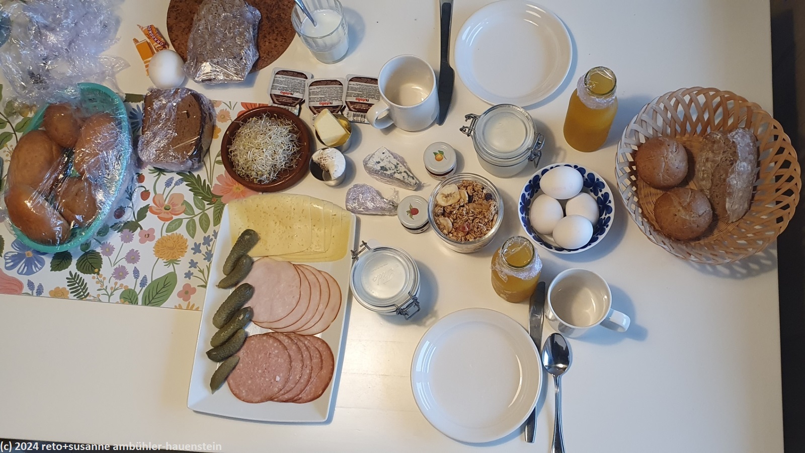 als wir gegen 8 uhr aufstehen, ist der himmel verhangen, aber es ist trocken. wir haben göttlich geschlafen in unserer wunderbaren, heimeligen stuga. unsere gastgeberin hat uns ein fürstliches frühstück bereit gemacht. es gibt saft, müesli, käse, wurst, butter, streichkäse, eier, brötchen, knäckebrot und natürlich kaffee.