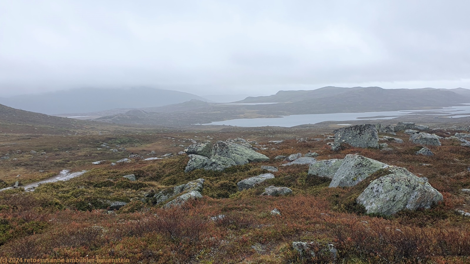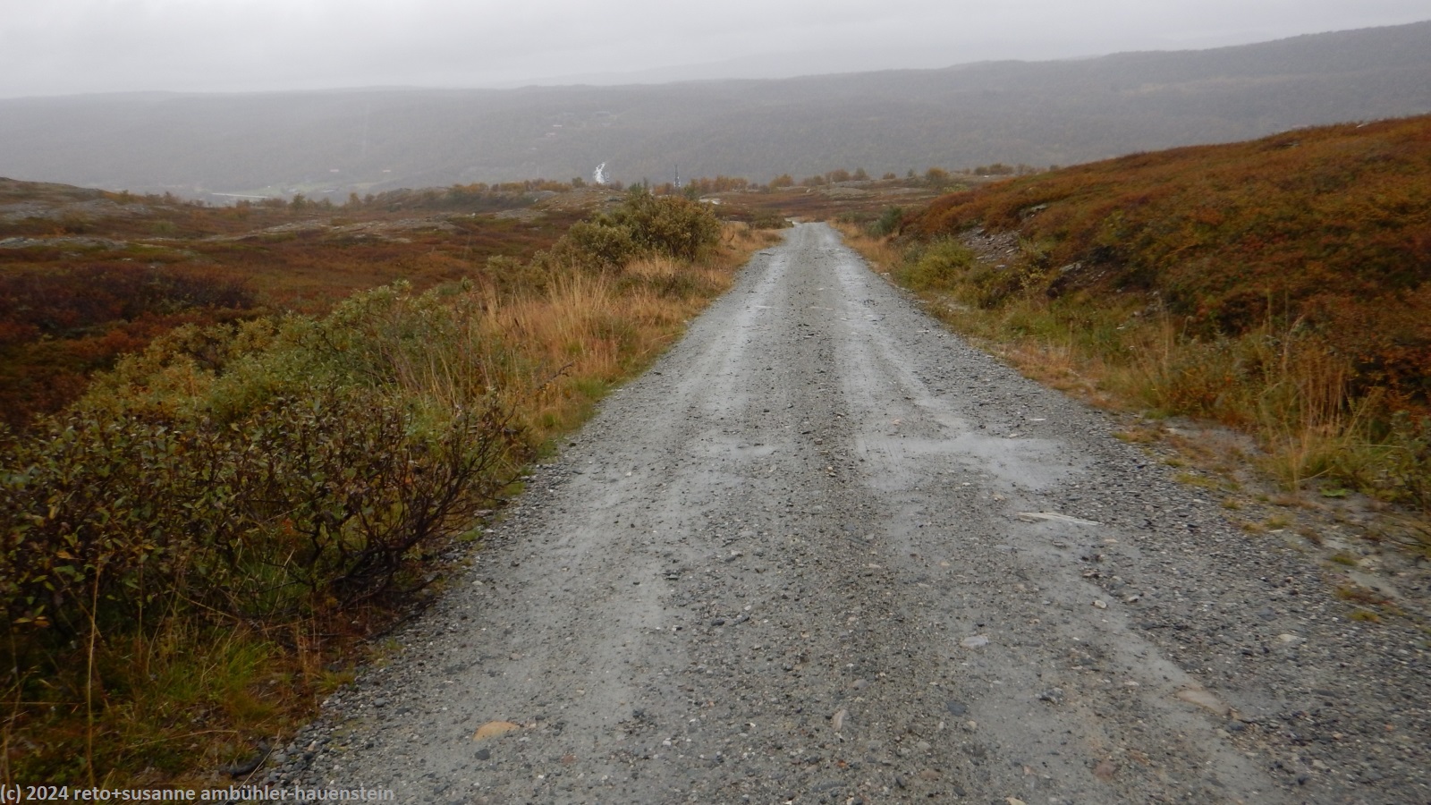 wir essen nur einen teil davon, einiges nehmen wir mit auf unsere wanderung. nach dem üppigen frühstück reinigen wir unsere hütte, dann melden wir uns bei unserer gastgeberin ab. wir wandern dem malmagen entlang am uns wohlbekannten campingplatz "fjällnäs camping & lodges" vorbei - dort haben wir vergangenes jahr vor und nach unserer wanderung über den nördlichen teil des südlichen kungsleden übernachtet, siehe tagebücher vom 27-jul-2023 und vom 05-aug-2023. leider endet der weg nach knapp 800 meter und wir müssen 1.5 km der landstrasse entlang gehen. glücklicherweise fahren hier sehr wenige autos. kurz nach dem mächtigen wasserfall zu unserer linken biegen wir nach rechts auf eine unbefestigte mautstrasse ab. diese steigt enorm steil an. während wir an höhe gewinnen, setzt der angekündigte regen ein. ich schütze mich erst mit dem schirm, aber als wir über die baumgrenze kommen, nimmt der wind stark zu und es bleibt mir nichts anderes übrig, als auch das regenzeug anzuziehen. je höher wir auf das kahle fjäll kommen, umso widerlicher wird das wetter. der wind wird immer heftiger und bläst uns den regen ins gesicht. nach etwa 5 km meint susanne: "warum tun wir uns dies noch an ?". die wettervorhersage war wirklich übel, wir hätten doch noch ein oder zwei tage warten können, meint sie. da wir die hütten entlang der route alle schon gebucht und bezahlt haben, ist eine verschiebung zwar nicht unmöglich, aber halt doch aufwändig. und so trotzen wir dem wetter und wandern bei garstigsten bedingungen über das bestimmt wunderschöne fjäll, wenn man es sehen könnte. in einer senke machen wir einen kurzen halt und essen einen stengel. bis zur ersten hütte sind es etwas mehr als 28 km. unser plan ist es, etwa die hälfte zu gehen und dort im zelt zu übernachten. morgen wollen wir dann den rest bewältigen. aber da, wo ich die übernachtung geplant hatte, ist nicht daran zu denken, das zelt aufzubauen. es giesst und stürmt und so gehen wir einfach weiter. gemäss reiseführer hat es nach etwa 18 km eine schutzhütte, die allerdings in einem üblen zustand sein soll. aber egal wie schmutzig die schützhütte auch sein soll, sie bietet uns hoffentlich etwas schutz vor dem wetter. so marschieren wir tapfer weiter. der weg wird immer holpriger, hohe und rutschige steine versperren den weg bzw. wollen überstiegen werden. gegen 16:45 uhr erreichen wir die schutzhütte und erleben eine äusserst erfreuliche überraschung: die hütte ist ganz neu und in tadellosem zustand.
