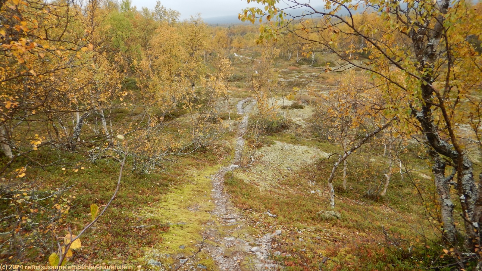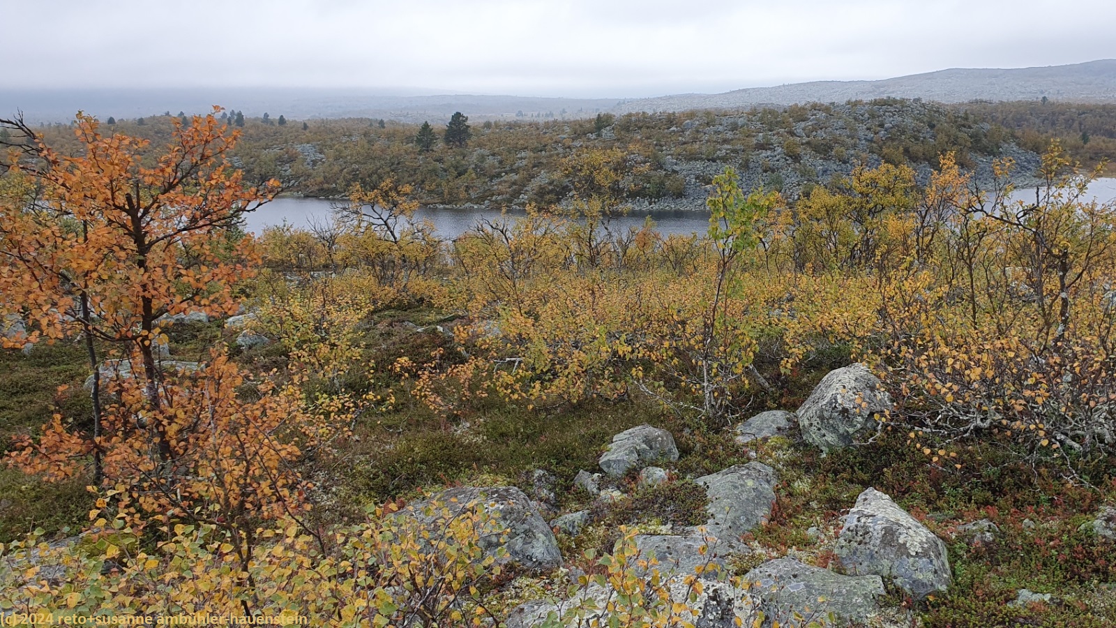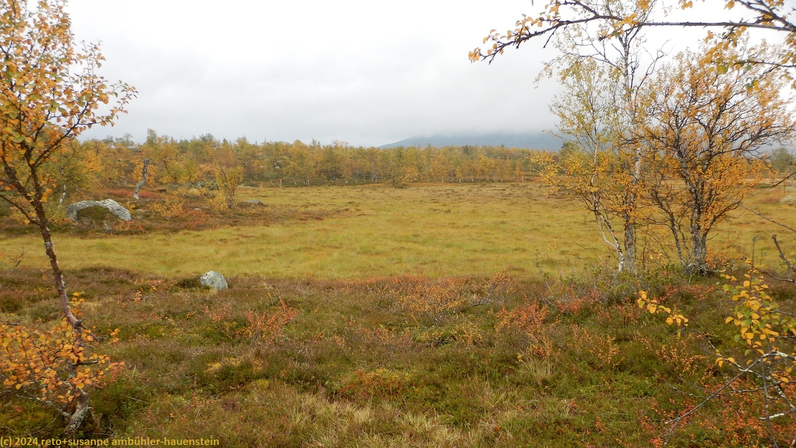 es bleibt den ganzen vormittag trocken, das ist sehr angenehm. gegen 10:15 uhr sind wir abmarschbereit. auch wenn der himmel verhangen ist, so sehen wir nun, durch was für eine wundervolle landschaft wir wandern. die kleinen birken haben alle gelbe blätter, es ist richtig herbst geworden. der weg ist weiterhin sehr holprig und mühsam zu gehen. da der boden immer noch sehr nass ist, sind die steine heimtükisch rutschig. immerhin sind die planken gut zu begehen, auch wenn ich nie ganz überzeugt bin, dass es nicht doch glitschige stellen hat. grundsätzlich ist der weg extrem nass, immer wieder müssen wir kleine sumpfgebiete umgehen. wir kommen deshalb etwas weniger rasch voran als gedacht. auch die handvoll kleine bäche, die es zu überqueren gilt, bremsen unser vorankommen. plötzlich kommt uns zwischen den steinen ein mann entgegen. er begrüsst uns mit den worten "did you take the bus?". ich bin ziemlich perplex und frage mich, wie er das wohl meint ? aber susanne erkennt den mann. er sass im gleichen bus von sveg nach funäsdalen wie wir, stieg aber etwas früher aus. wir unterhalten uns kurz. er meint, der weg bis zur skedbrostuga werde nicht besser. nach gut 2.5 km laufen wir über einen felsrücken zwischen zwei seen, das sieht toll aus. um 12 uhr machen wir einen kurzen halt.