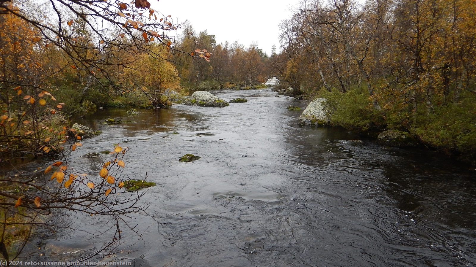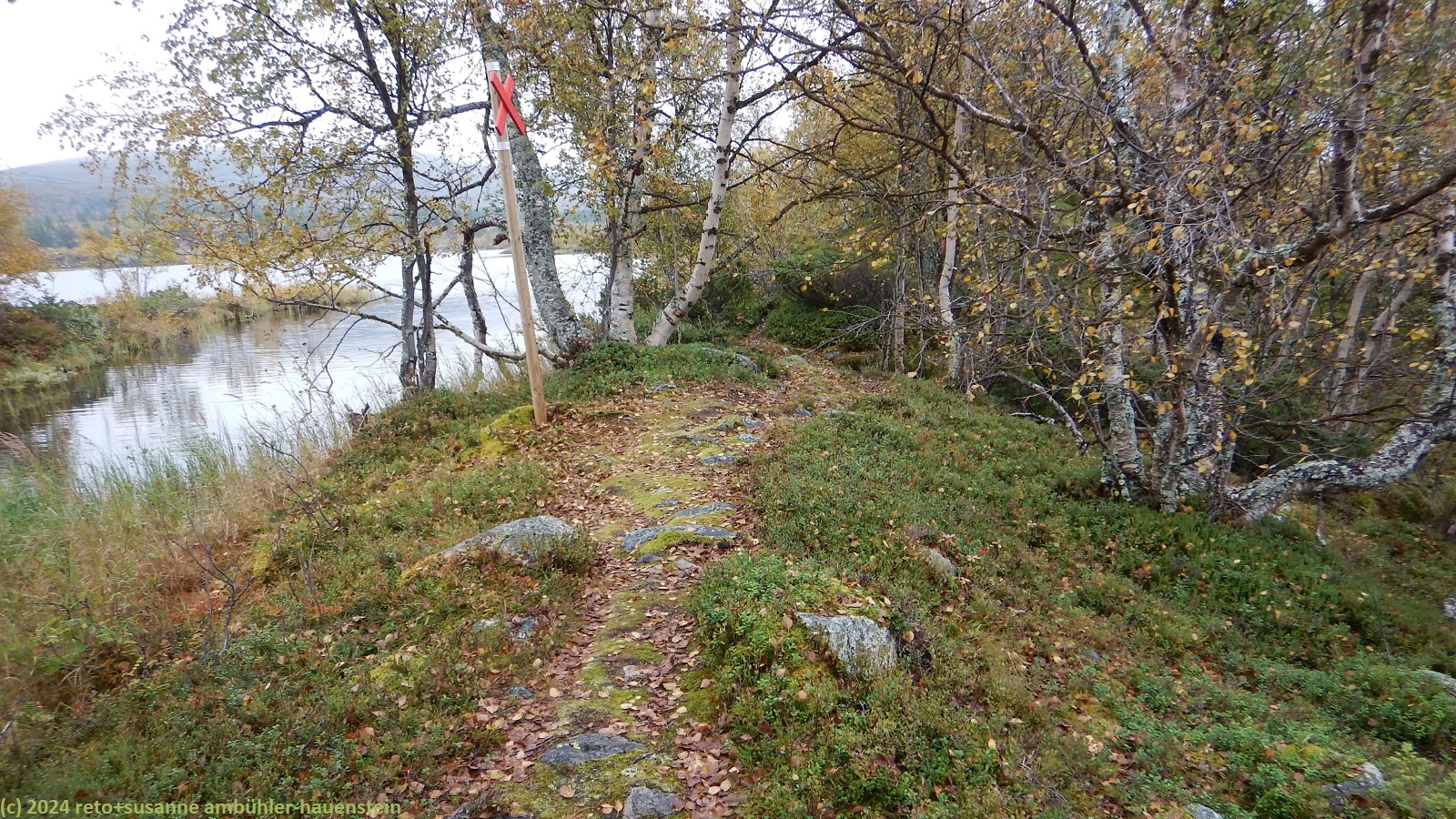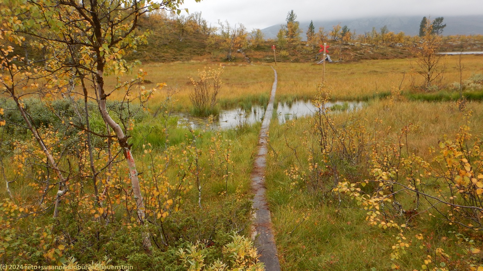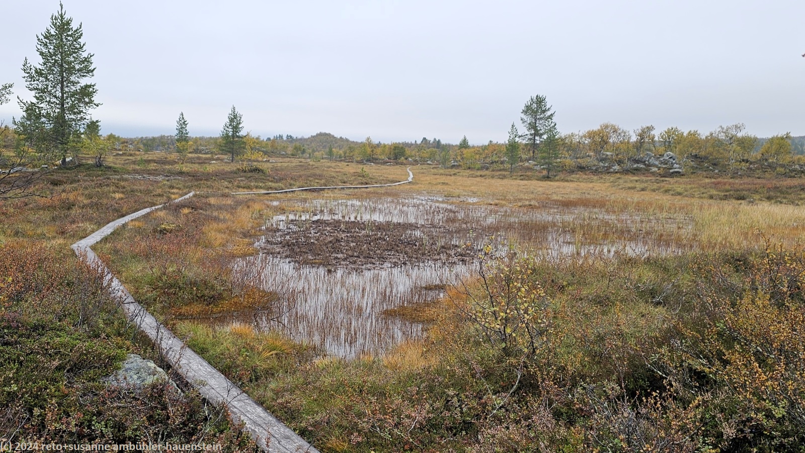 es bleibt den ganzen vormittag trocken, das ist sehr angenehm. gegen 10:15 uhr sind wir abmarschbereit. auch wenn der himmel verhangen ist, so sehen wir nun, durch was für eine wundervolle landschaft wir wandern. die kleinen birken haben alle gelbe blätter, es ist richtig herbst geworden. der weg ist weiterhin sehr holprig und mühsam zu gehen. da der boden immer noch sehr nass ist, sind die steine heimtükisch rutschig. immerhin sind die planken gut zu begehen, auch wenn ich nie ganz überzeugt bin, dass es nicht doch glitschige stellen hat. grundsätzlich ist der weg extrem nass, immer wieder müssen wir kleine sumpfgebiete umgehen. wir kommen deshalb etwas weniger rasch voran als gedacht. auch die handvoll kleine bäche, die es zu überqueren gilt, bremsen unser vorankommen. plötzlich kommt uns zwischen den steinen ein mann entgegen. er begrüsst uns mit den worten "did you take the bus?". ich bin ziemlich perplex und frage mich, wie er das wohl meint ? aber susanne erkennt den mann. er sass im gleichen bus von sveg nach funäsdalen wie wir, stieg aber etwas früher aus. wir unterhalten uns kurz. er meint, der weg bis zur skedbrostuga werde nicht besser. nach gut 2.5 km laufen wir über einen felsrücken zwischen zwei seen, das sieht toll aus. um 12 uhr machen wir einen kurzen halt.