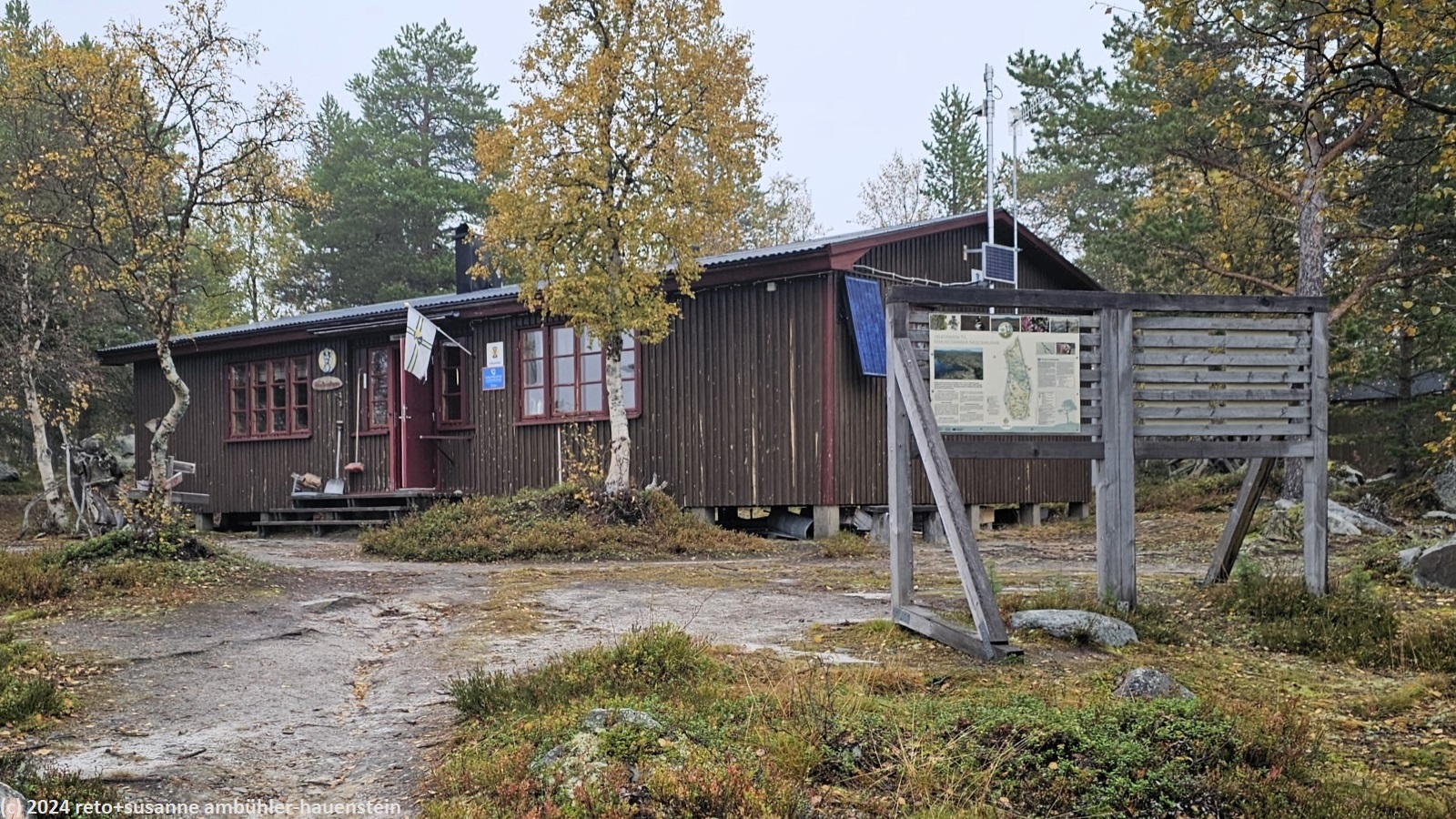 die aussicht von der hütte auf den rogen und die dahinterliegenden berge ist fantastisch. der hüttenwart begrüsst uns freundlich und meint, wir seien im moment die einzigen gäste. er erwartet noch ein schwedisches paar, welches aber erst spät ankommen wird. wir erhalten ein glas preiselbeersaft, der schmeckt fantastisch. auch diese stuga hat zwei räume mit je zwei schlafnischen. allerdings gibt es hier nur vier betten pro nische und nicht fünf, wie in den meisten anderen hütten dieser art. wir dürfen den einen raum in beschlag nehmen.