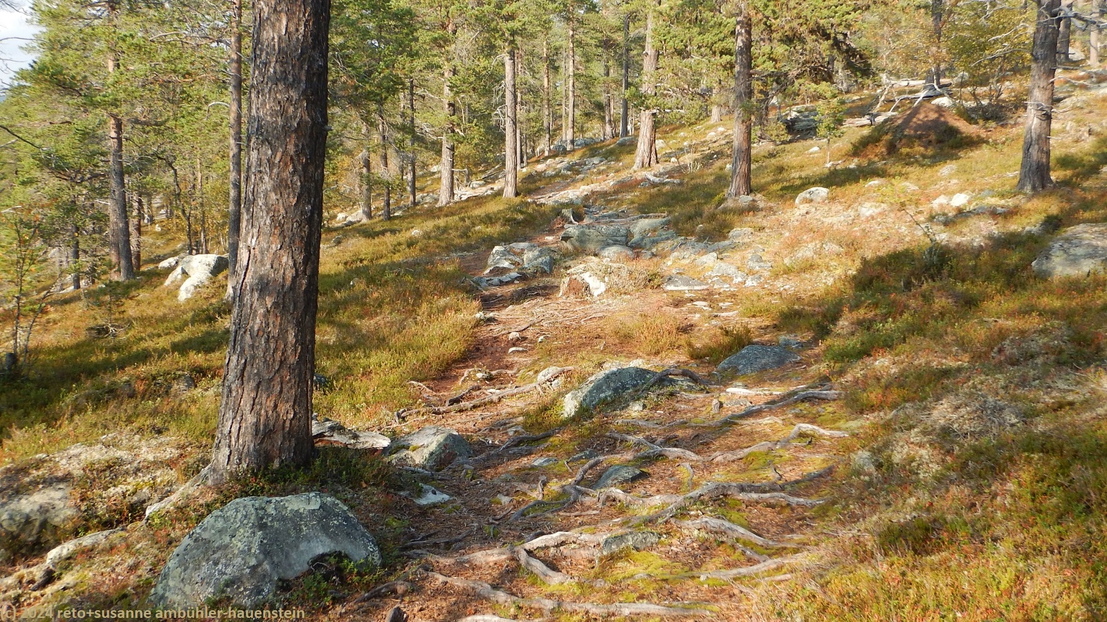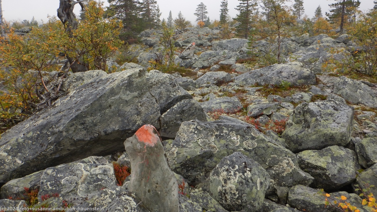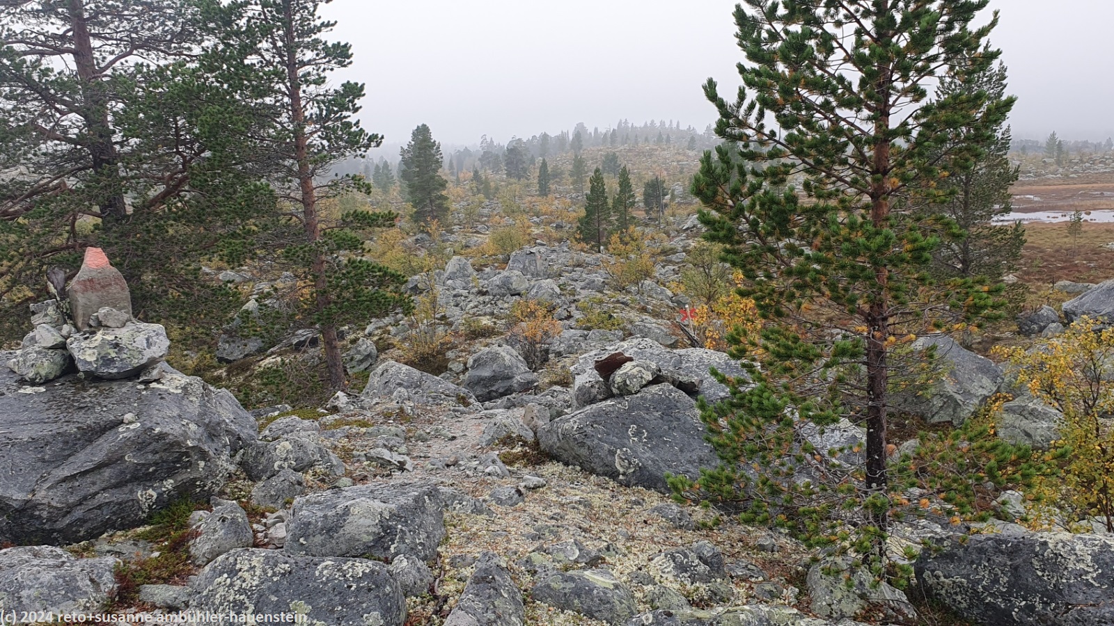 unser handy weckt uns um 7 uhr. ich habe wunderbar geschlafen, susanne "es geht so". als ich zur toilette gehe, stelle ich überrascht fest, dass es regnet. damit haben wir überhaupt nicht gerechnet, es ist ein sonniger tag angesagt. nach dem frühstück packen wir unsere rucksäcke und reinigen unseren hausteil. als wir aufbrechen, hat der regen aufgehört, aber der himmel ist ziemlich verhangen. allerdings sind es keine wolken, sondern nebel. anfangs präsentiert sich der pfad ähnlich wie gestern, sehr holprig und steinig und enorm rutschig. die landschaft ist wunderschön, richtung westen sehen wir seen und die hohen norwegischen berge. kurz vor 10:15 uhr erreichen wir die abzweigung richtung reva. die grenze zu norwegen ist knapp 750 meter entfernt. wir bleiben jedoch auf dem kungsleden und wandern nun ostwärts, womit wir uns wieder von der schwedisch/norwegischen grenze entfernen. inzwischen hat sich der nebel verzogen. die sonne scheint, am blauen himmel hat es nur wenige, vereinzelte wolken. schon am morgen war es drückend warm, jetzt kommen wir richtig ins schwitzen. der pfad führt durch einen schönen wald, vorbei an den beiden gipfeln des bustvålen. der waldboden ist dicht bewachsen, dazwischen liegen weit verstreut felsbrocken. wir überqueren die flanke des bustvålen wobei der weg kontinuierlich ansteigt. manchmal ist er ganz gut zu begehen, dann ist er wieder mit steinen übersät oder führt durch sehr nasses gelände. der kleinere gipfel hat auf unserer seite eine beeindruckende felswand. kurz nach der brücke über die verbindung zwischen dem öster-rödsjön und dem rödviken hat es am seeufer einen sehr schön gelegenen windschutz. meine frau nutzt den sandstrand für ein kurzes bad, ich erfrische mich ohne ins wasser zu gehen. danach essen wir im windschutz unsere brote und haben dabei eine tolle aussicht auf den rogen.