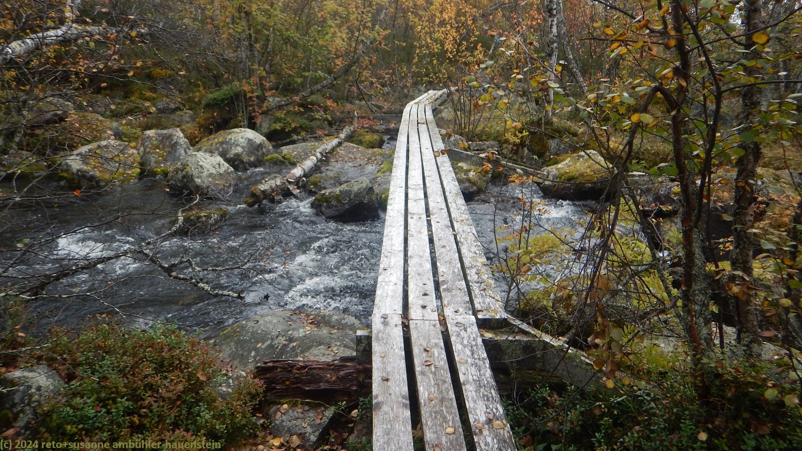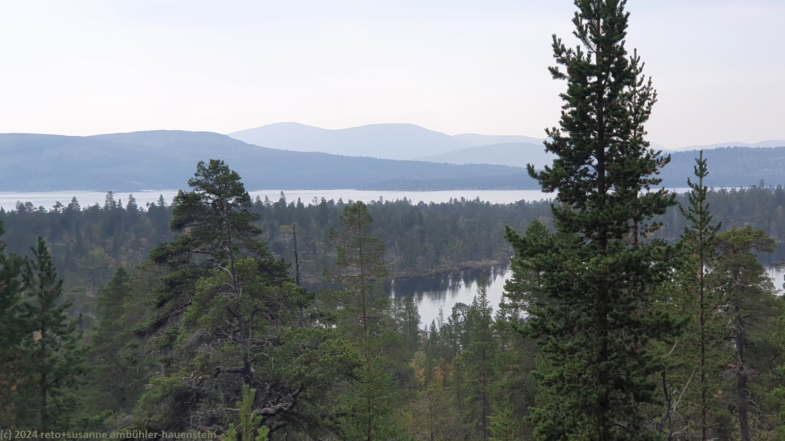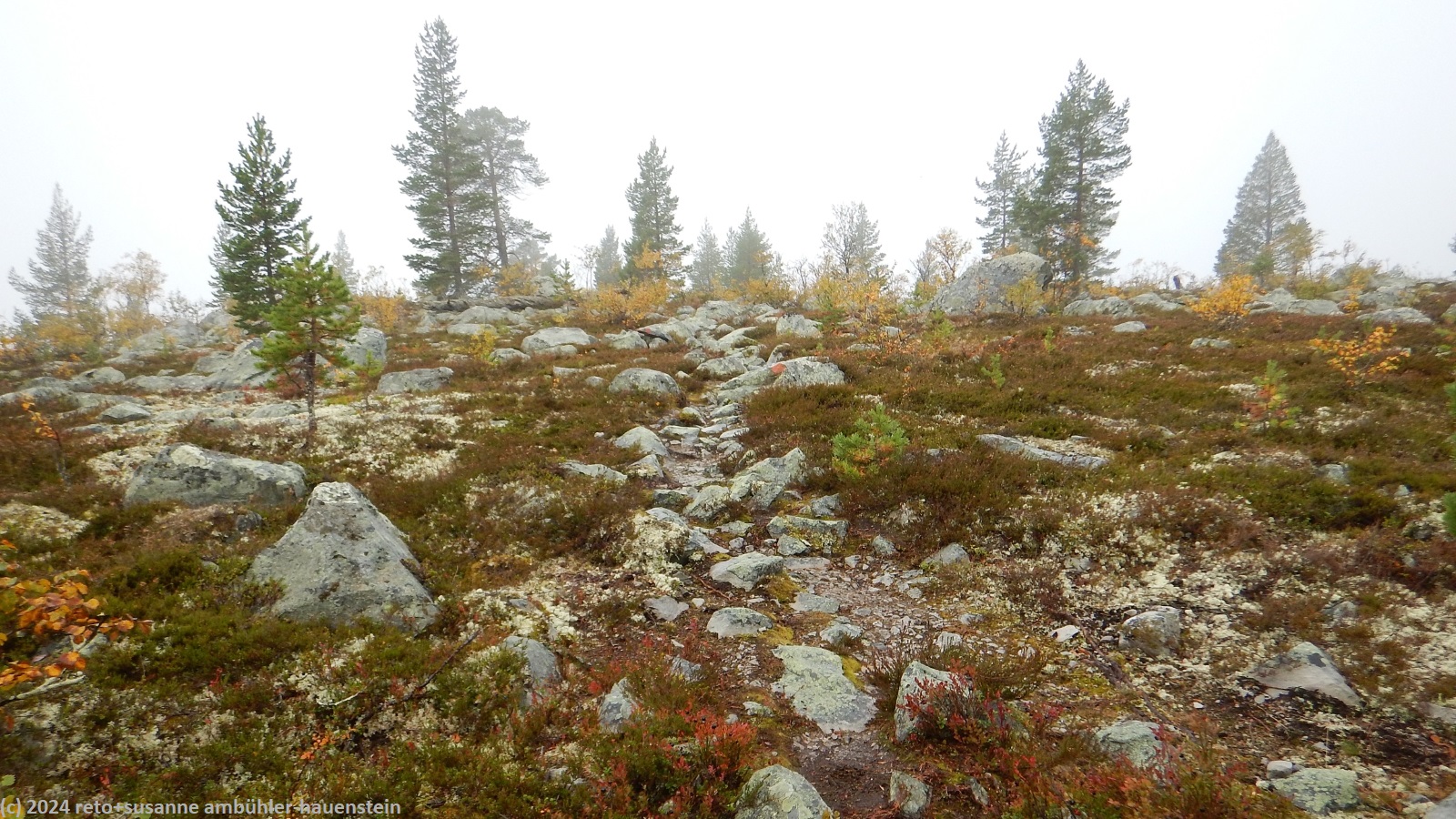 unser handy weckt uns um 7 uhr. ich habe wunderbar geschlafen, susanne "es geht so". als ich zur toilette gehe, stelle ich überrascht fest, dass es regnet. damit haben wir überhaupt nicht gerechnet, es ist ein sonniger tag angesagt. nach dem frühstück packen wir unsere rucksäcke und reinigen unseren hausteil. als wir aufbrechen, hat der regen aufgehört, aber der himmel ist ziemlich verhangen. allerdings sind es keine wolken, sondern nebel. anfangs präsentiert sich der pfad ähnlich wie gestern, sehr holprig und steinig und enorm rutschig. die landschaft ist wunderschön, richtung westen sehen wir seen und die hohen norwegischen berge. kurz vor 10:15 uhr erreichen wir die abzweigung richtung reva. die grenze zu norwegen ist knapp 750 meter entfernt. wir bleiben jedoch auf dem kungsleden und wandern nun ostwärts, womit wir uns wieder von der schwedisch/norwegischen grenze entfernen. inzwischen hat sich der nebel verzogen. die sonne scheint, am blauen himmel hat es nur wenige, vereinzelte wolken. schon am morgen war es drückend warm, jetzt kommen wir richtig ins schwitzen. der pfad führt durch einen schönen wald, vorbei an den beiden gipfeln des bustvålen. der waldboden ist dicht bewachsen, dazwischen liegen weit verstreut felsbrocken. wir überqueren die flanke des bustvålen wobei der weg kontinuierlich ansteigt. manchmal ist er ganz gut zu begehen, dann ist er wieder mit steinen übersät oder führt durch sehr nasses gelände. der kleinere gipfel hat auf unserer seite eine beeindruckende felswand. kurz nach der brücke über die verbindung zwischen dem öster-rödsjön und dem rödviken hat es am seeufer einen sehr schön gelegenen windschutz. meine frau nutzt den sandstrand für ein kurzes bad, ich erfrische mich ohne ins wasser zu gehen. danach essen wir im windschutz unsere brote und haben dabei eine tolle aussicht auf den rogen.