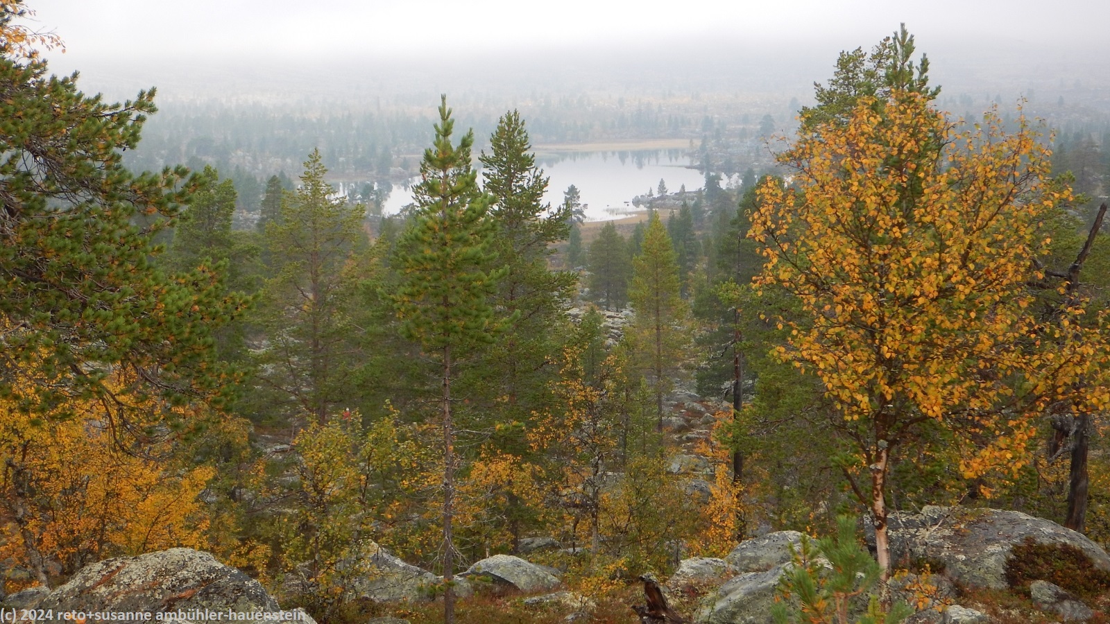wir stehen um 7 uhr auf und nehmen überrascht zur kenntnis, dass es draussen regnet, obwohl ein sonniger tag angesagt ist. als wir um 08:30 uhr aufbrechen, hat der regen aufgehört, aber es herrscht dichter nebel. der blick über den see hat etwas mystisches. nach 75 minuten sind wir bei der abzweigung richtung reva und damit nur noch knapp 750 meter von norwegen entfernt. der nebel hat sich inzwischen aufgelöst und während wir an den beiden gipfeln des bustvålen vorbei wandern, scheint die sonne wie vorhergesagt. als wir gegen 12:45 uhr bei einer schutzhütte am rogen rasten, ist es so warm, dass wir uns am see abkühlen. nach dem mittagessen folgen wir dem ufer des rogen und erreichen kurz nach 16:30 uhr unser tagesziel rogenstugan. der hüttenwart begrüsst uns freundlich. um 18 uhr dürfen wir uns in die schöne und geräumige sauna setzen. zwischen den sitzungen kühlen wir uns im glasklaren see ab. nach dem nachtessen erleben wir eine wunderschöne abendstimmung über dem see.