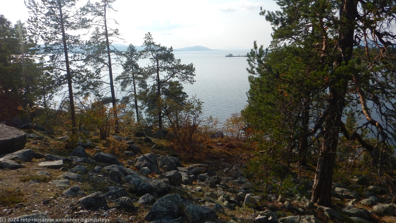 danach machen wir zwei sitzungen in der sauna, dazwischen kühlen wir uns im glasklaren see ab. zurück in der hütte bereitet susanne das abendessen zu. dieses geniessen wir mit fantastischer aussicht auf den see. während susanne liest und ich tagebuch schreibe, färbt sich der himmel über dem see wunderschön rot und violett.