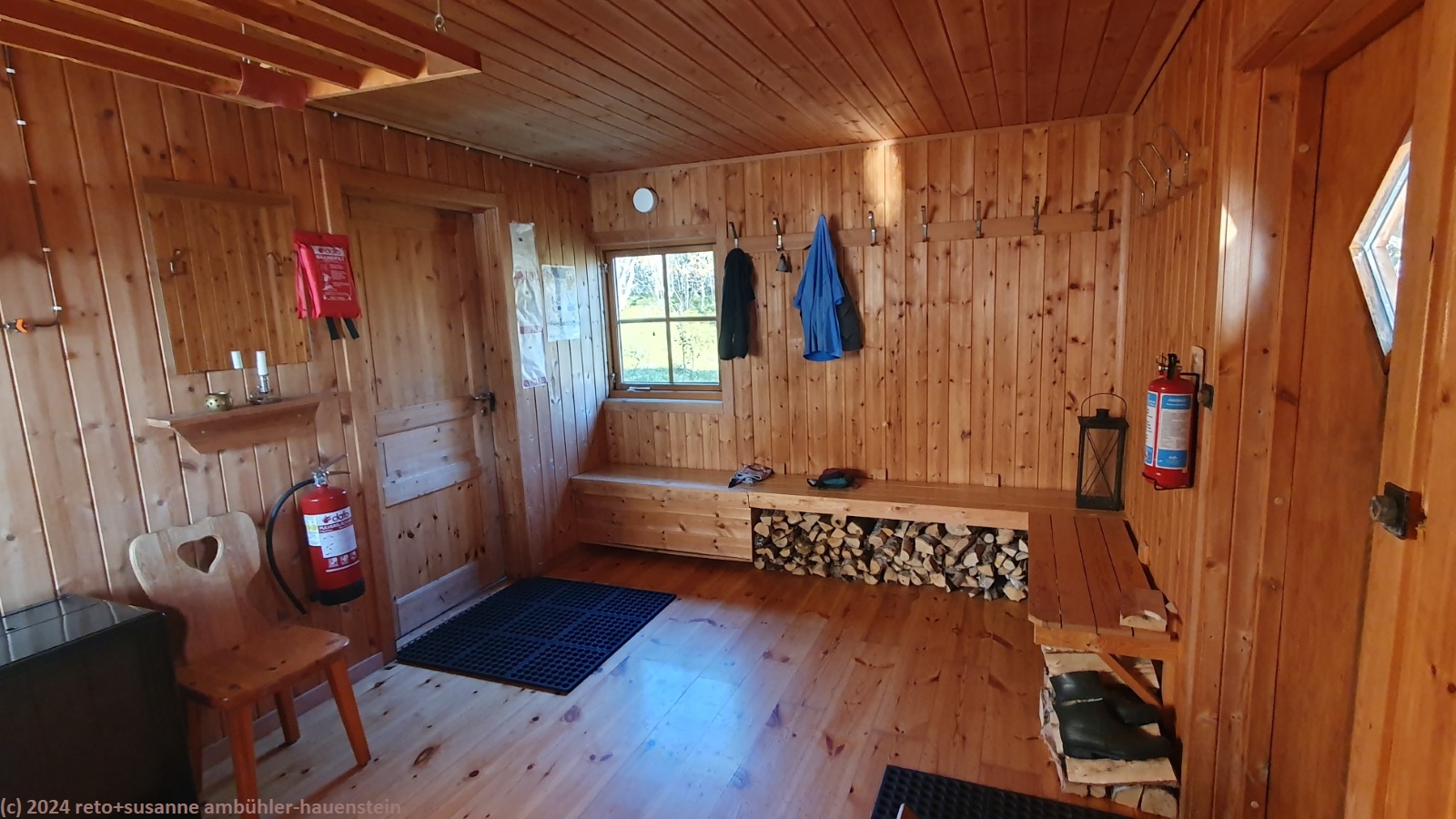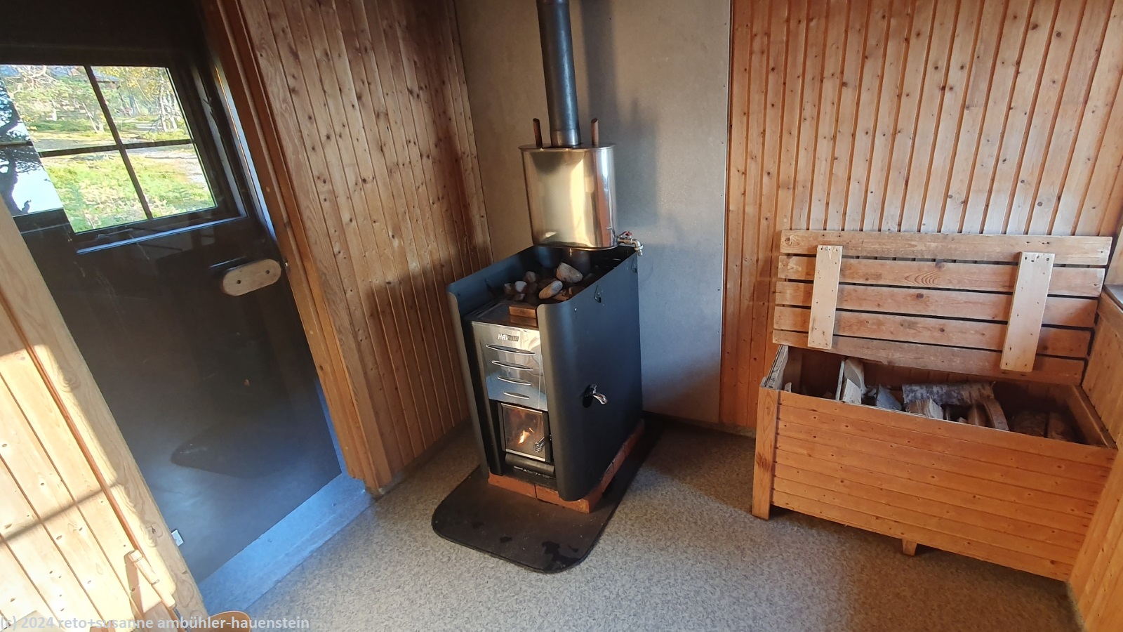 wir gönnen uns einen kleinen snack, danach richten wir uns ein. gegen 18 uhr dürfen wir die sauna benutzen. diese sieht ganz neu aus. im waschraum hängt ein eimer mit einem kleinen hahn an der decke. wir füllen ihn mit warmem wasser und geniessen eine erfrischende dusche.