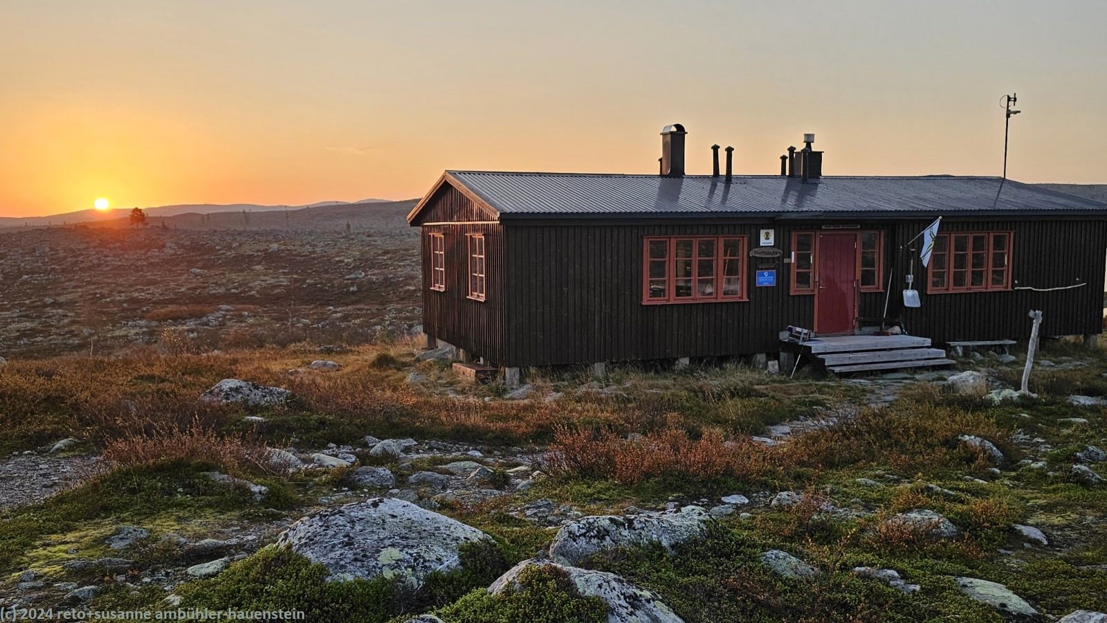 ein einzelner wanderer gesellt sich wenig später zu uns und kocht etwas abseits sein mittagessen. kurz nach 13:30 uhr brechen wir wieder auf. auf dem rückweg zum pfad füllen wir unsere wasserflaschen auf. bis auf weiteres ändert sich nicht viel an der landschaft. um 14:45 uhr machen wir nochmals kurz rast, essen einen stengel und trinken wasser. über einen mehr oder weniger steinigen weg geht es auf der flanke des jakobshöjden bergwärts. hoch über uns sehen wir einen markanten antennenmasten. am höchsten punkt machen wir noch einmal einen kurzen halt. nun geht es mit angenehmem gefäll talwärts. als wir die waldgrenze erreichen, wird der weg steiler und noch einmal richtig holprig. interessanterweise gibt es zahlreiche wegweiser, aber keinen, der richtung grövelsjön fjällstation zeigt. unser navi führt uns aber zielsicher direkt dorthin. um 16:30 uhr haben wir das tagesziel und damit auch das ende dieser mehrtageswanderung glücklich erreicht.