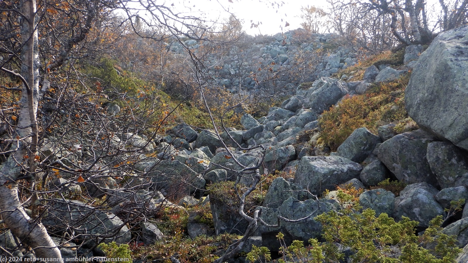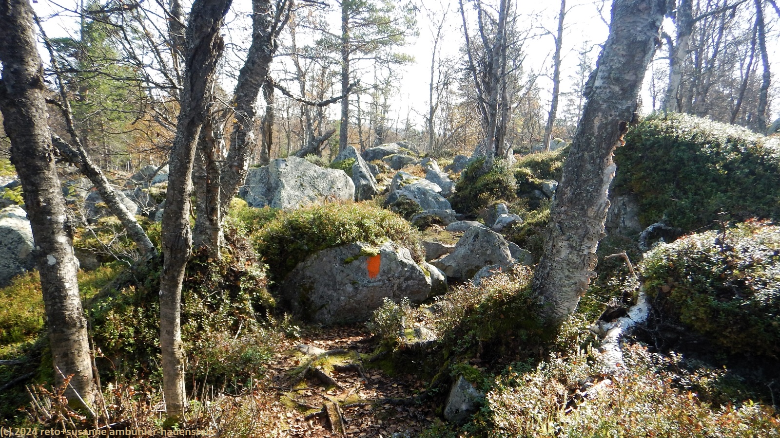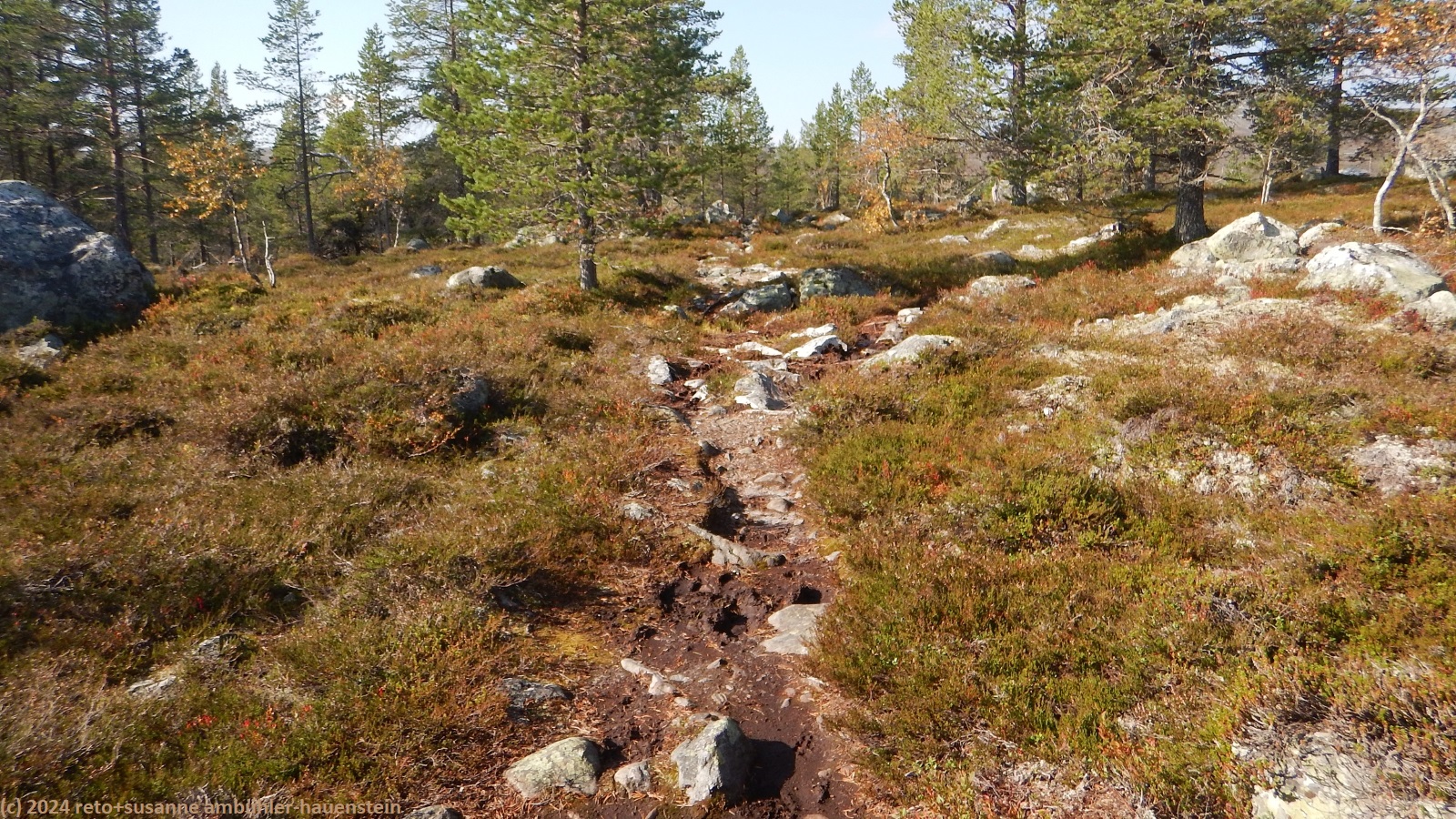 nach 15 minuten brechen wir wieder auf. eine brücke führt über die verbindung zwischen dem hävlingen und dem särsjön. hier füllen wir unsere trinkflaschen auf. der pfad folgt nun ein kurzes stück dem südlichen seeufer. wir haben eine fantastische aussicht über den hävlingen, in welchem sich der herbstliche wald spiegelt. dann dreht der weg langsam richtung süden und entfernt sich damit vom see. solange wir durch den wald wandern, ist der weg äusserst mühsam zu begehen, über der waldgrenze wird es einfacher. der weg steigt weiter kontinuierlich an, wobei die steigung eher abnimmt. gegen 12:30 uhr sind wir auf der höhe der schutzhütte särsjöbäcken. diese liegt knapp 250 meter vom wanderweg entfernt, direkt am winterpfad. querfeldein gehen wir zu hütte und essen auf deren treppe bei strahlendem sonnenschein zu mittag.