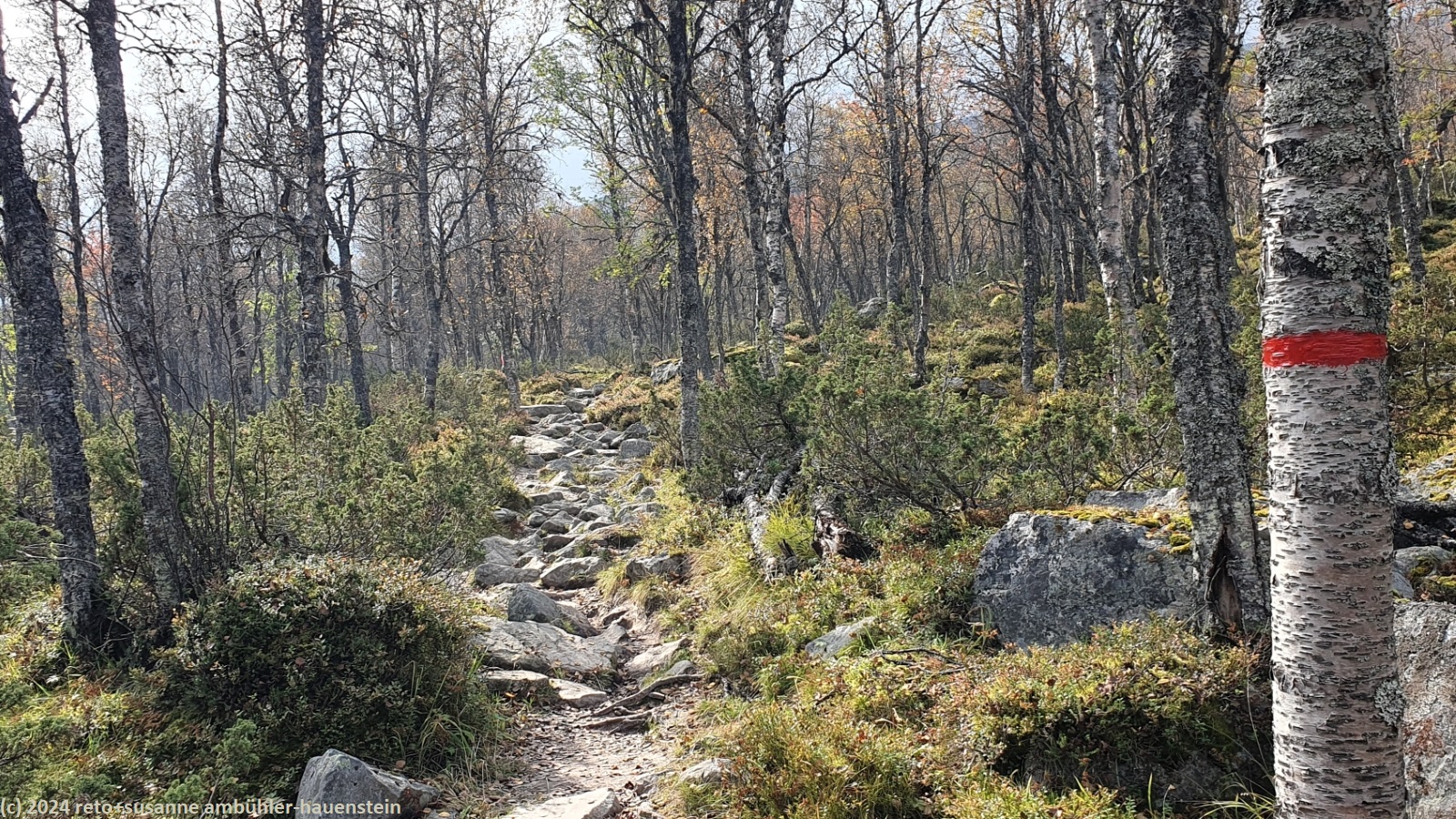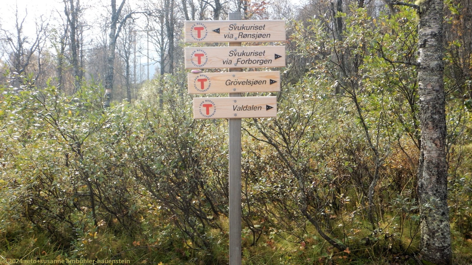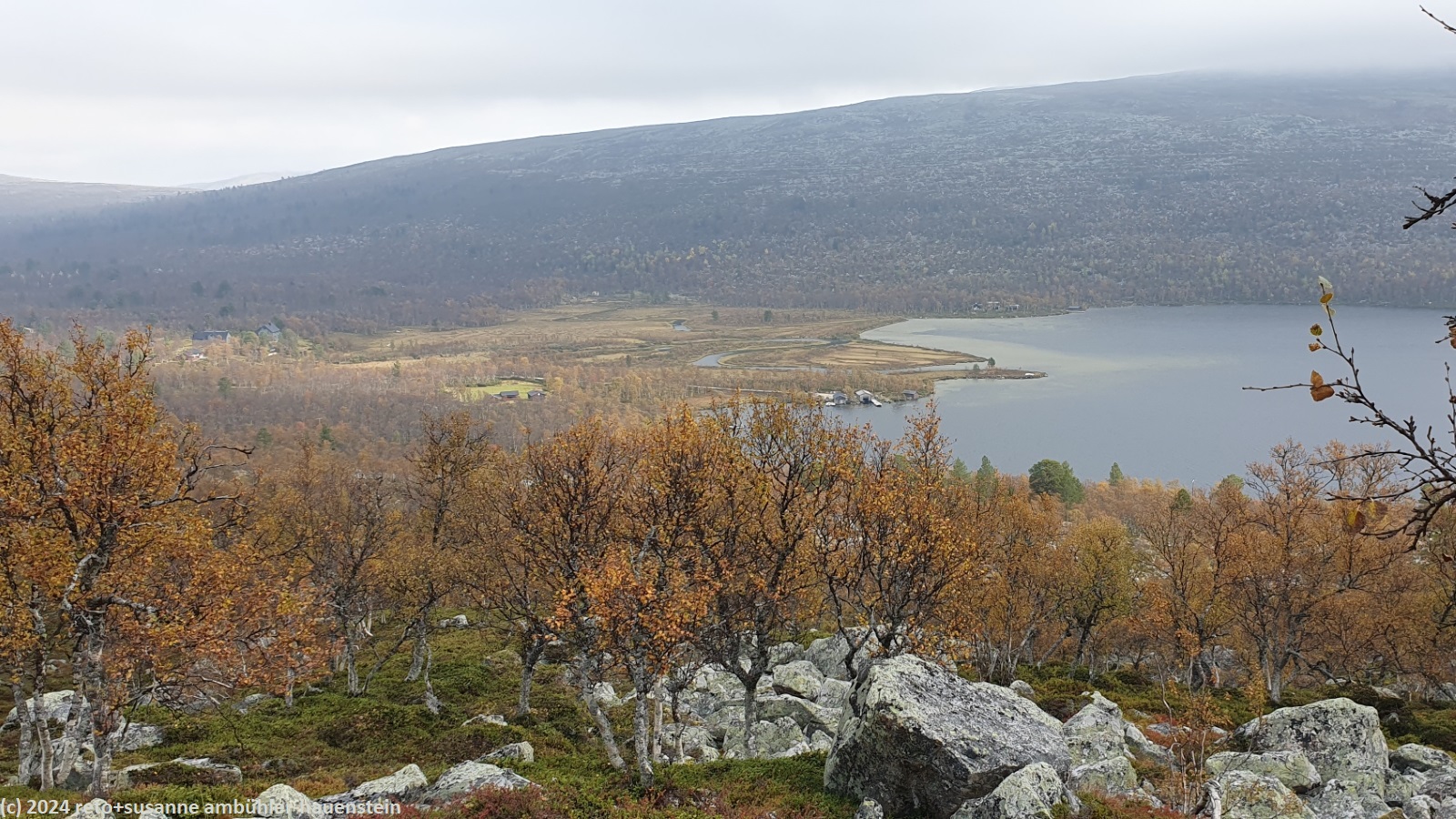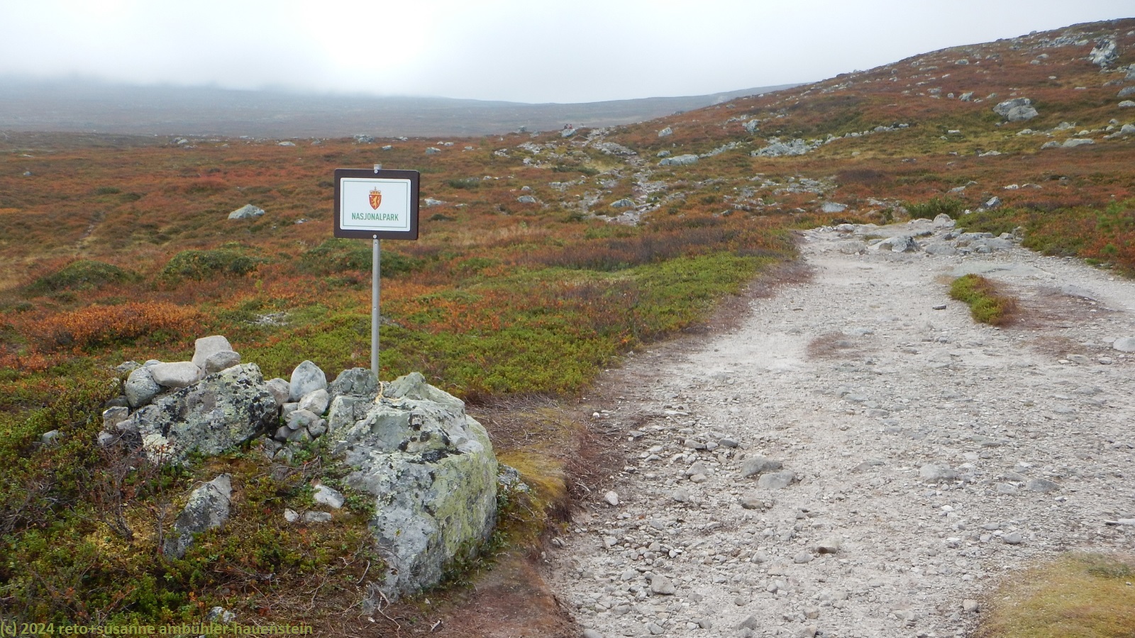 der himmel ist zwar immer noch bewölkt, aber wir sehen nun ab und zu blaue flecken und manchmal sogar für einen kurzen moment die sonne. der weg folgt erst ein kurzes stück dem grøvelåa entlang richtung ryvang, dann geht es südwärts. der pfad steigt nun recht steil an und führt durch einen wunderschönen herbstwald. anfangs geht es über die berüchtigten steine, aber mit dem leichten rucksack geht das viel einfacher. auf etwa 850 m.ü.m erreichen wir die baumgrenze. der weg steigt nun etwas weniger steil an. der wanderweg ist hier nicht ein einziger pfad, sondern es verlaufen mehrere trampelpfade mehr oder weniger parallel neben- und durcheinander. aus der ferne könnte man die wanderwege als strasse interpretieren. während dem aufstieg begegnen wir immer wieder anderen menschen. viele sind tagesausflügler wie wir, andere haben viel gepäck dabei und sind wohl länger unterwegs. auf dem weg zum höchsten punkt bläst uns ein mässiger wind ins gesicht. mit 1065 m.ü.m haben wir ersteren erreicht. nun senkt sich der pfad sanft talwärts. wir würden gerne picknicken, aber das ist gar nicht so einfach. wir befinden uns im femundsmarka nationalpark und entlang des weges hat es immer wieder schilder, dass man den pfad nicht verlassen darf. so direkt am weg essen möchten wir aber auch nicht. schliesslich kommen wir an einem grösseren felsen knapp neben dem weg vorbei, bei diesem rasten wir.