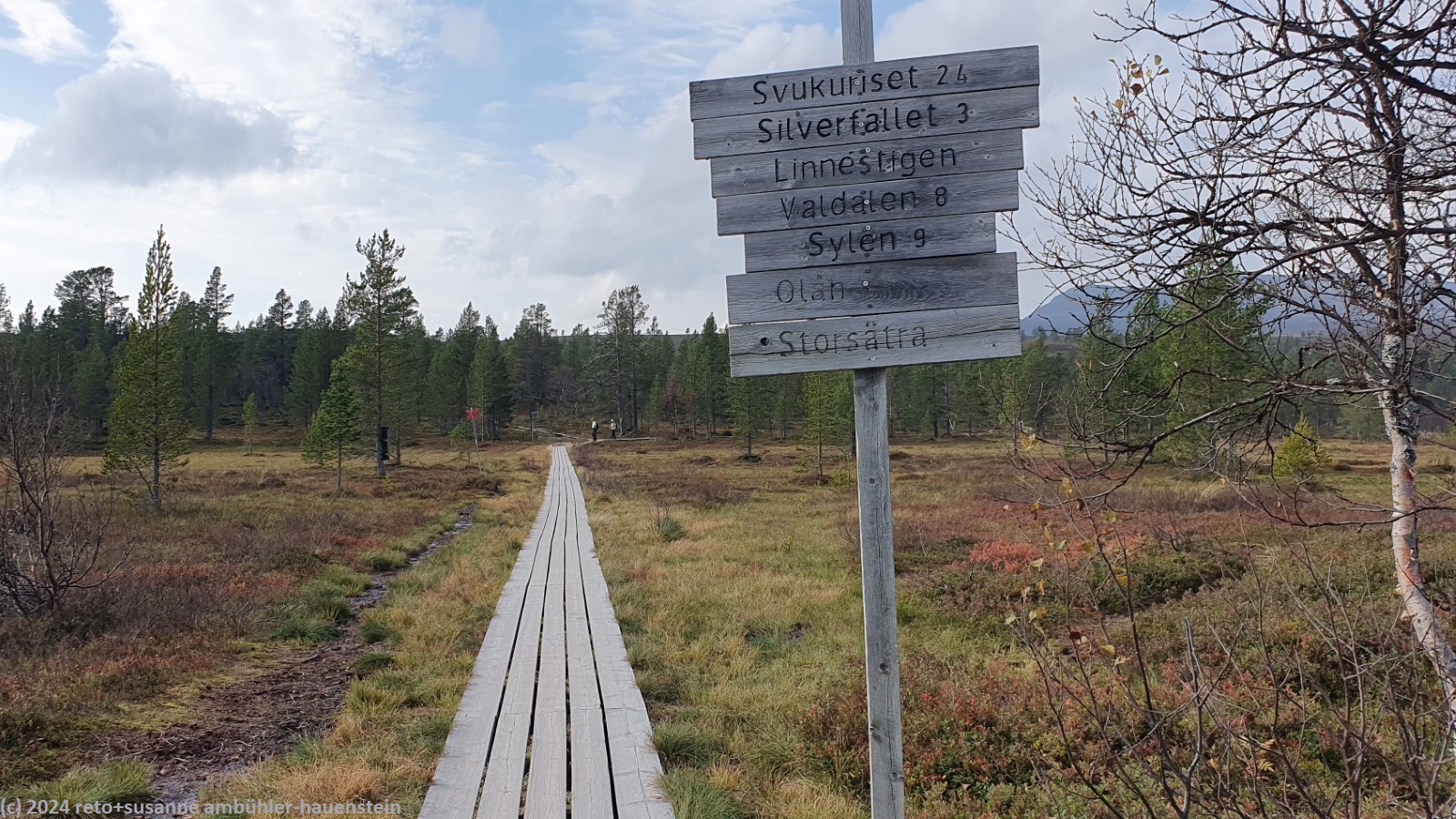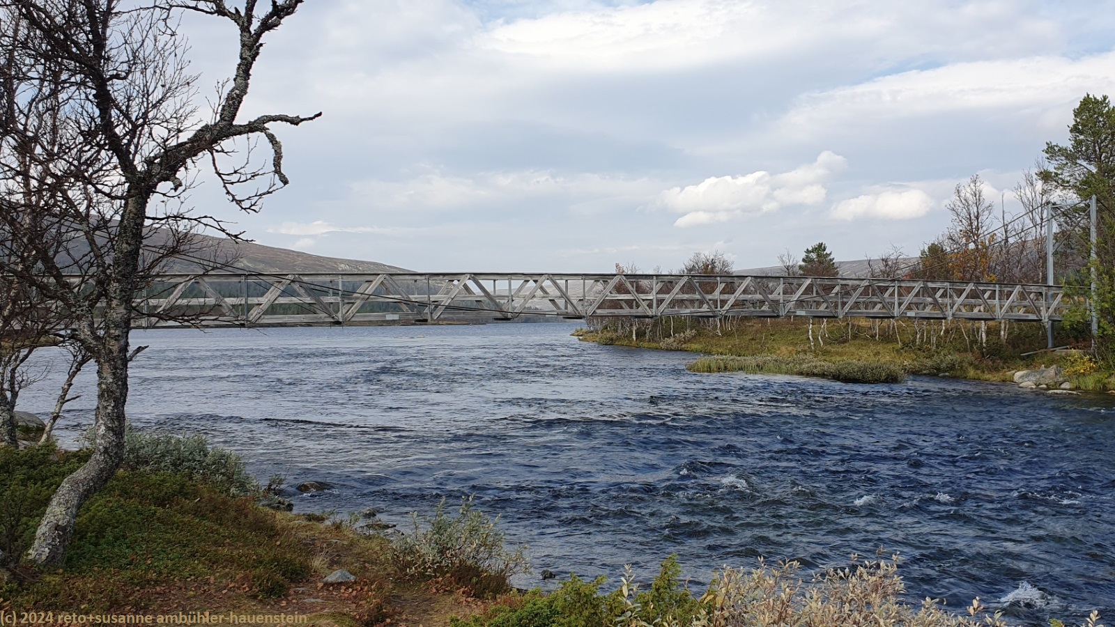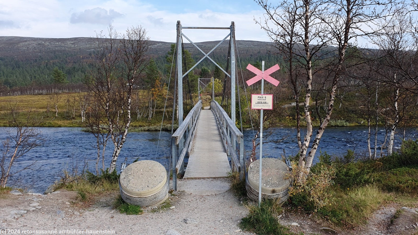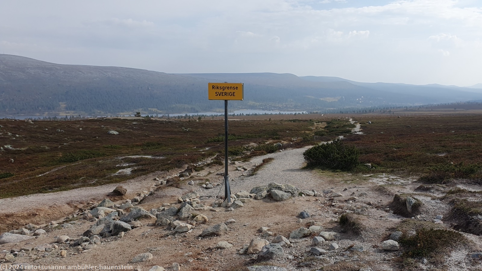 während wir unsere brote verzehren, zeigt sich das wetter von allen seiten. erst scheint die sonne, dann fallen einige regentropfen, angereichert wird das ganze mit einem böigen wind. nach gut 30 minuten wird uns langsam kalt und wir setzen unsere wanderung fort. es geht nicht lange, da scheint die sonne wieder. der abstieg richtung grövelsjön ist einfach zu begehen. nach knapp 1 km überschreiten wir die grenze zwischen norwegen und schweden, damit endet unser kurzer ausflug nach norwegen. schon bald erreichen wir die waldgrenze und wenig später sind wir bei der markanten hängebrücke über den grövlan.