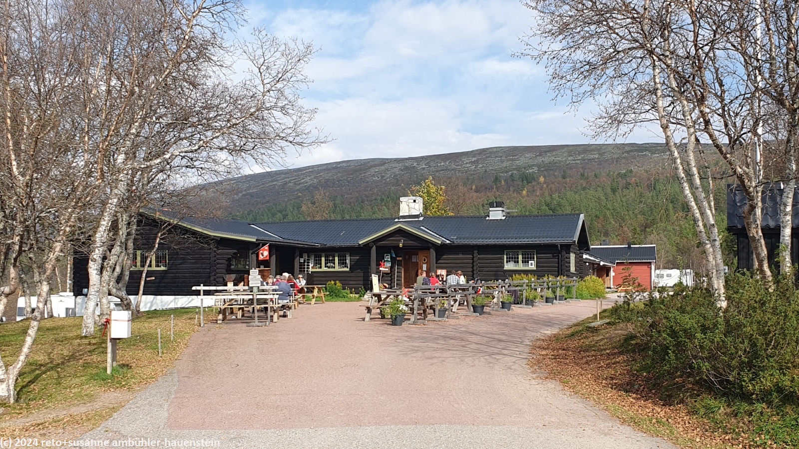 über die zufahrtsstrasse kehren wir zur fjällstation zurück. wir packen unser nasses zelt aus und stellen es auf dem spielplatz zum trocknen auf. bei dem wind geht das ziemlich rasch. kaum haben wir es zusammengepackt, beginnt es zu regnen. wir trocknen den boden und die kleinteile noch kurz im trockenraum, dann falten wir das zelt wieder zusammen. die zeit bis zum abendessen verbringen wir im aufenthaltsraum mit lesen und tagebuch schreiben. um 18 uhr setzen wir uns in den wunderschönen speisesaal und geniessen das abendessen. heute besteht die vorspeise aus rote beete mit geissenkäse, danach gibt es vier verschiedene salate, kartoffelgratin, rotkohl und rentierfleisch. susanne verzichtet heute auf eine nachspeise, ich wähle ein stück nektarinenkuchen mit vanillesosse. nach dem essen setzen wir uns in die sauna. wir machen zwei eher kurze sitzungen, denn mit 86°C ist die sauna sehr warm und es gibt keinen see oder fluss, um sich abzukühlen. den abend verbringen wir im idyllischen nebensaal des restaurants der fjällstation. es hat zwar immer noch einige gäste, aber heute abend ist es erwartungsgemäss viel ruhiger als gestern. kurz vor 22 uhr ziehen wir uns in unser zimmer zurück und schlüpfen in die schlafsäcke.