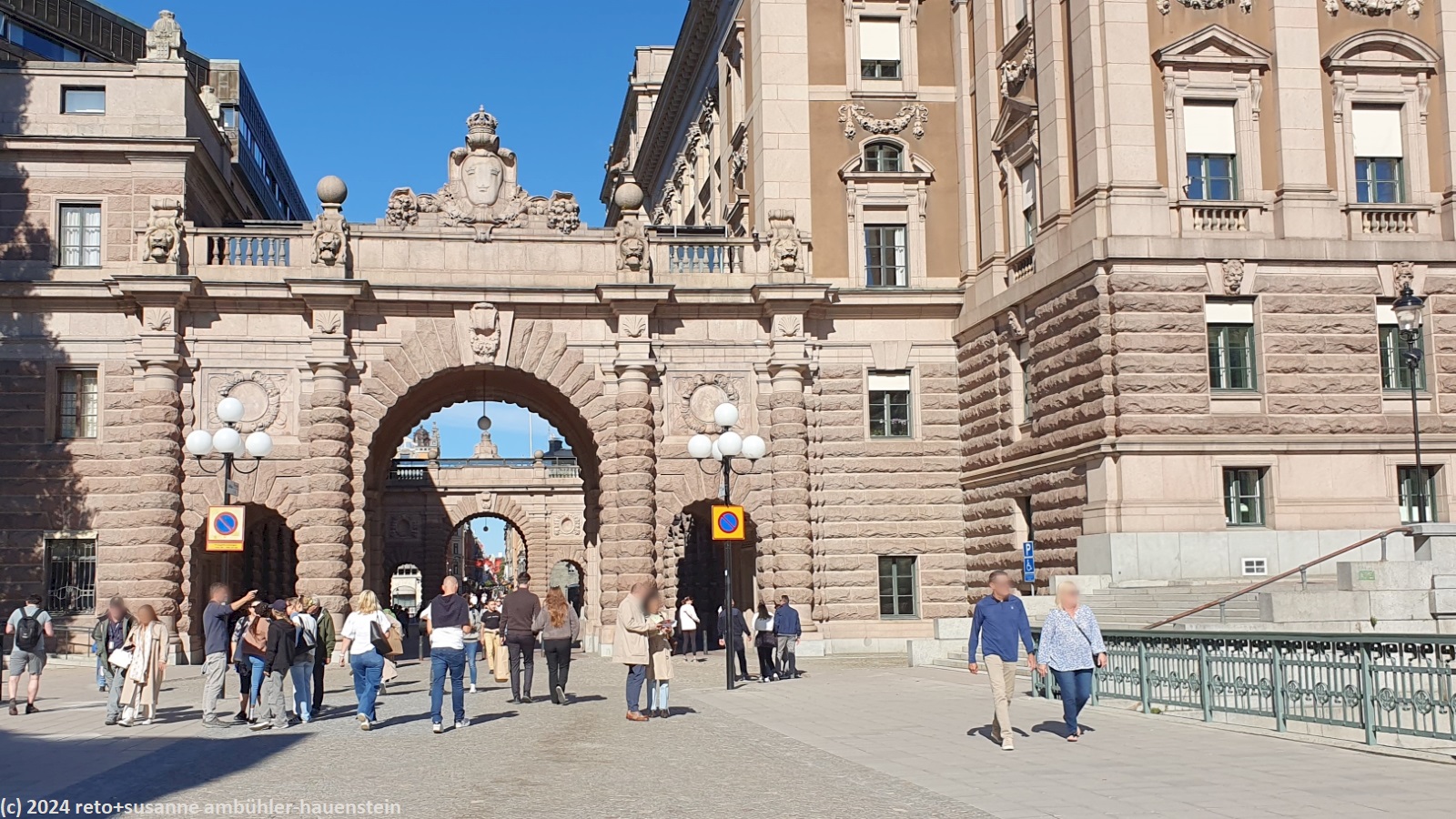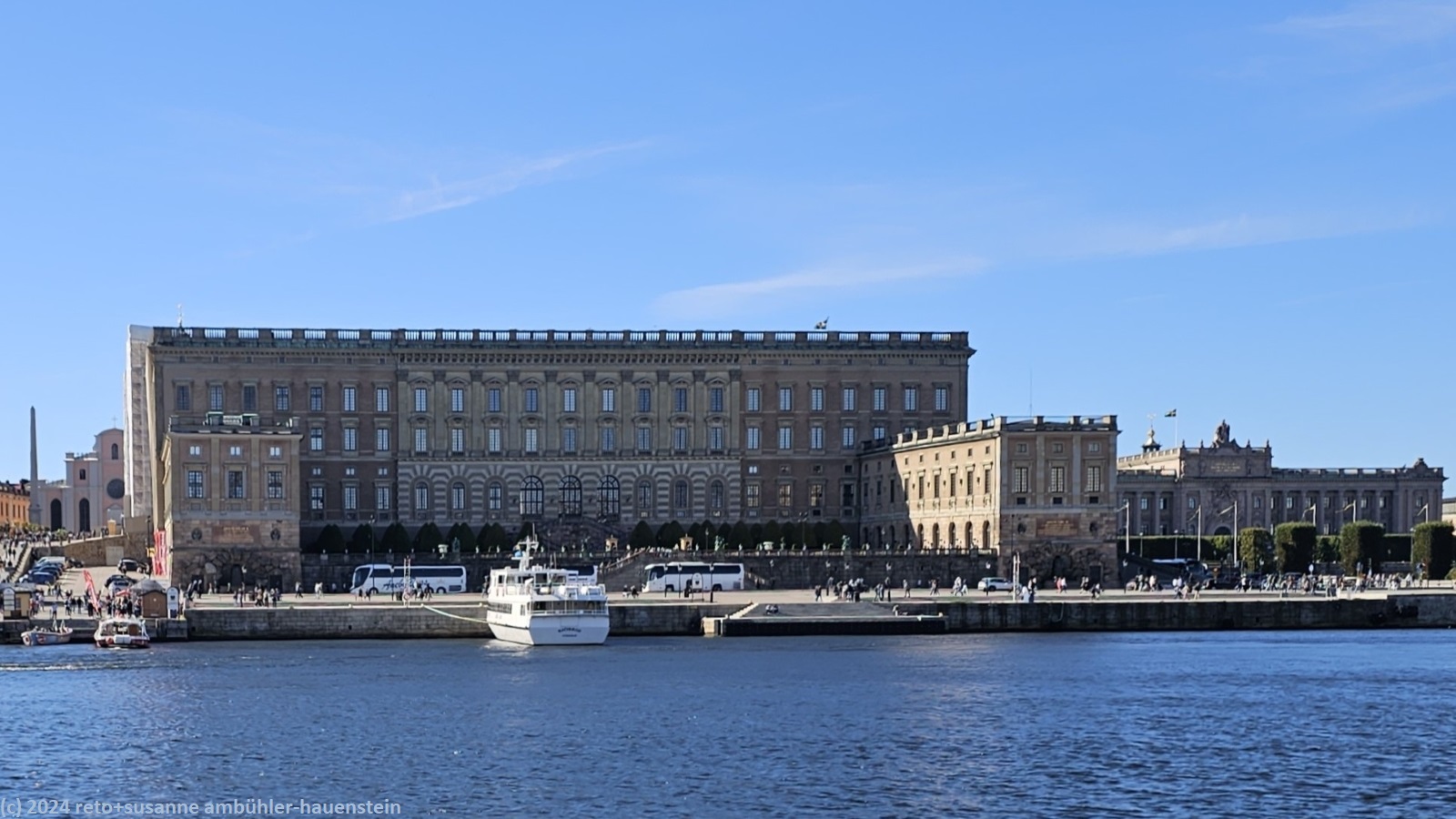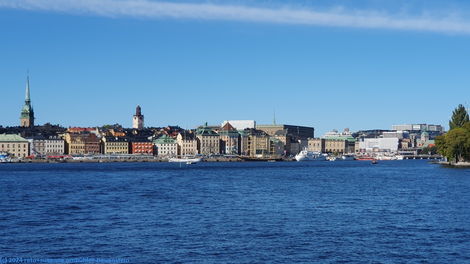 die fahrt nach stockholm dauert eine stunde und zehn minuten. unterwegs stoppt die fähre bei den verschiedenen kleinen inseln. bei strahlendem sonnenschein gleiten wir in den hafen von stockholm, direkt bei gamla stan. wir schlendern durch die schmalen gassen. wenig überraschend sind an diesem wunderschönen samstag viele menschen in der stadt. beim schloss geraten wir gerade in den beginn der wachablösung. wir laufen erst einmal um das schloss und dann um das hafenbecken richtung nationalmuseeum. von da geht es über eine brücke auf die kleine insel skeppsholmen.