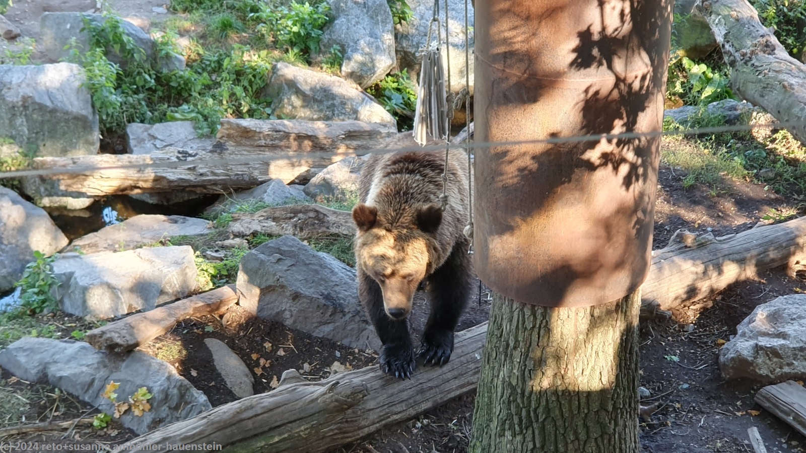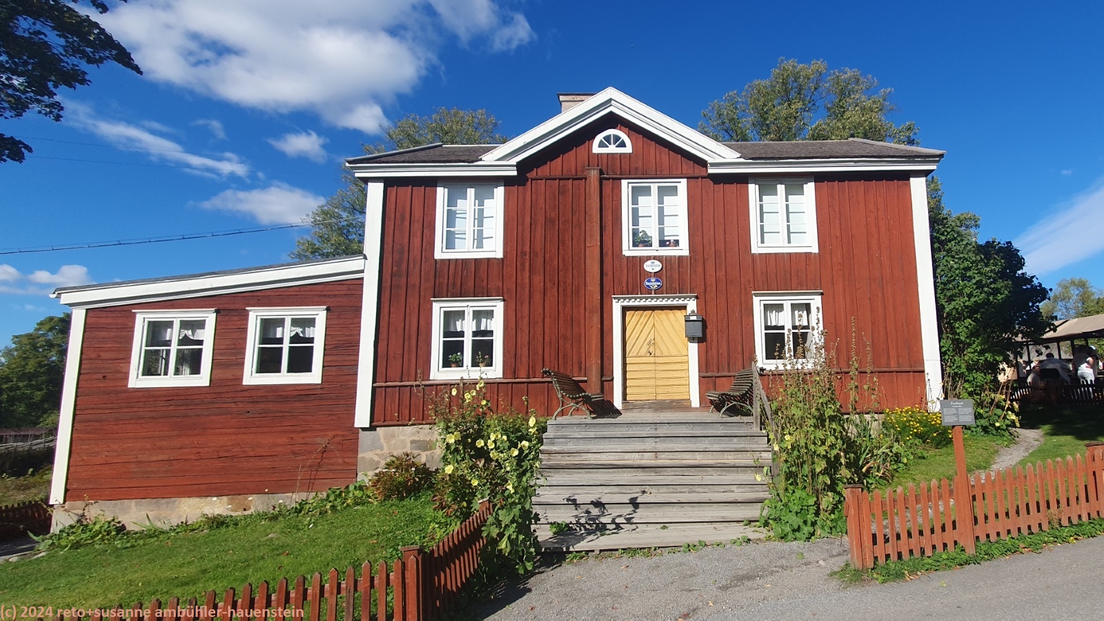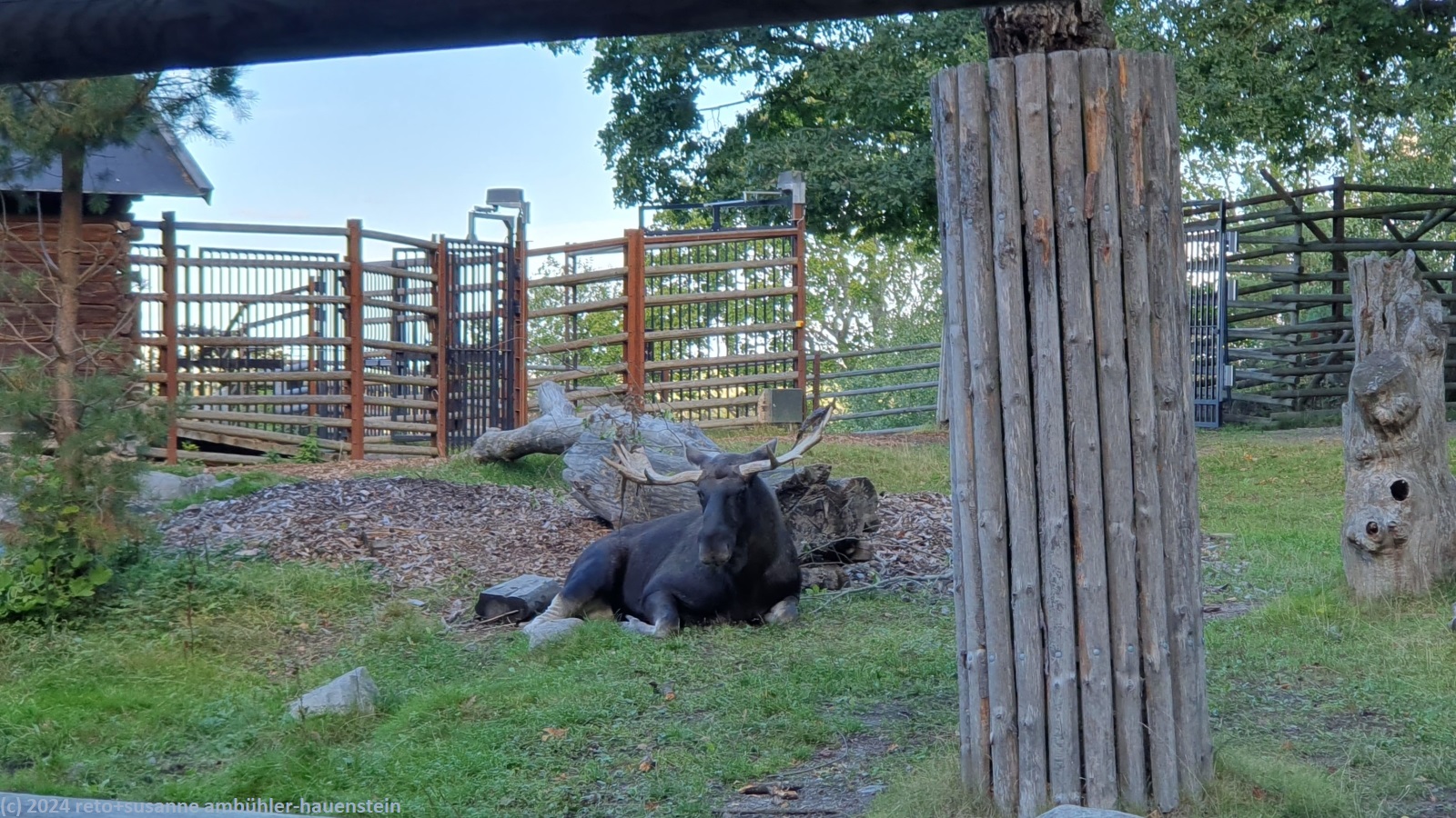 wir möchten eigentlich zum skansen. dieses liegt auf der gleichen insel wir der tiergarten und der vergnügungspark gröna lunda. zwischen den beiden inseln fährt ein kleines boot. dieses macht allerdings die runde hafen - tierpark - skeppsholm, das heisst, wir fahren zuerst zum hafen und erst dann nach djurgården. wir geniessen die kleine stadtrundfahrt. beim anleger djurgården verlassen wir die fähre und marschieren am gröna lunda vorbei zum haupteingang des skansen. da bereits 13 uhr vorbei ist, essen wir zuerst im grossen restaurant etwas. die auswahl ist allerdings sehr beschränkt. in der heimeligen ehemaligen apotheke geniessen wir anschliessend kaffee und kuchen im schönen gärtchen. danach besuchen wir die elche, bären und moschuchsochsen. die hätten wir alle gerne auf dem fjäll gesehen, aber ausser rentieren und schneehühner gab es in der freien natur keine tiere zu sehen.