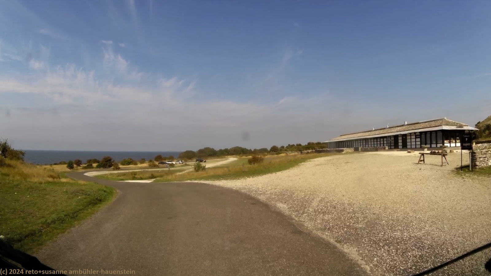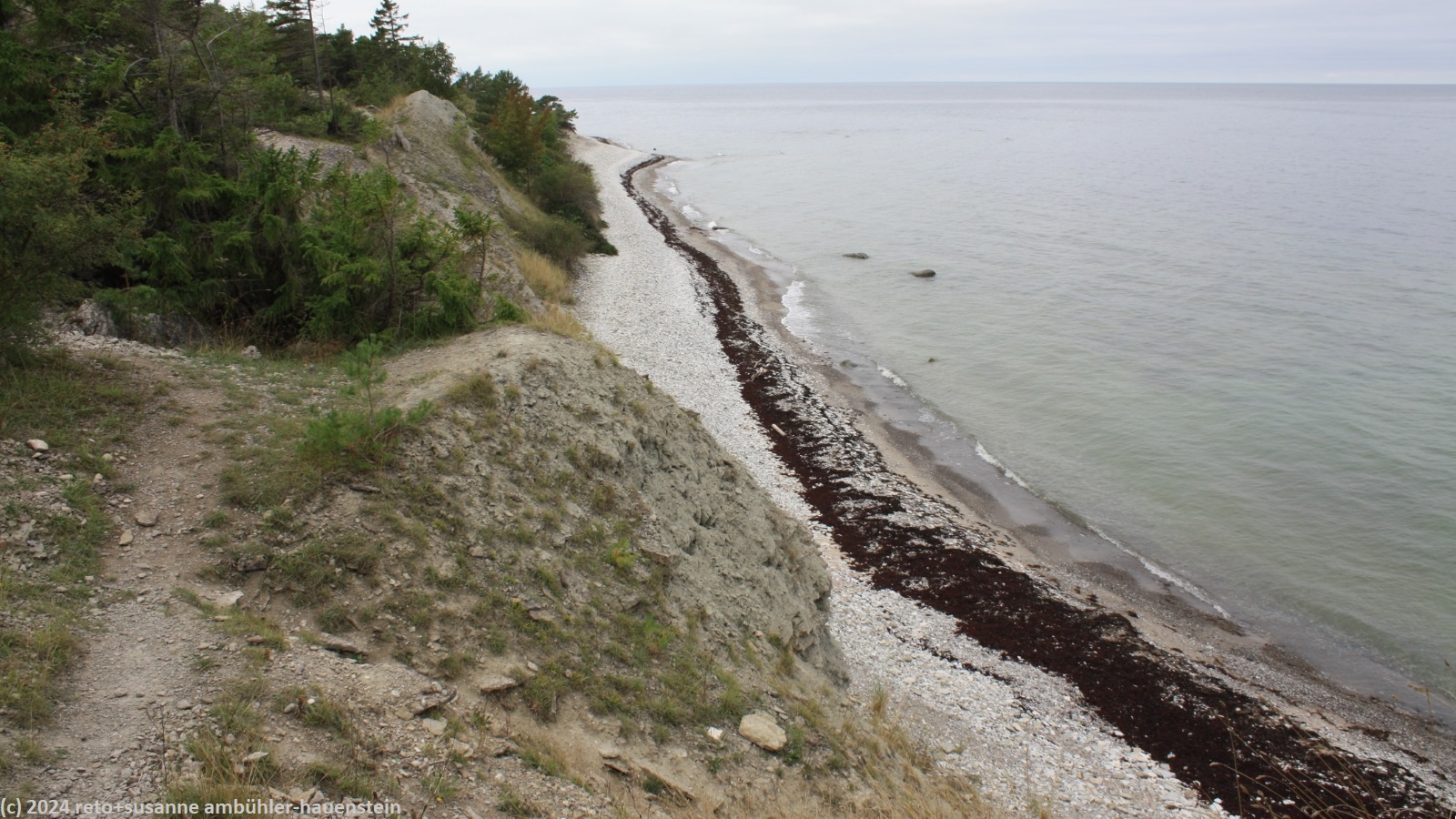 diese bis zu knapp 50 meter hohe steilküste erstreckt sich wenige kilometer südwestlich von visby. ganz in der nähe des parkplatzes befindet sich der höchste punkt der küste. von hier hat man eine tolle aussicht auf den hafen von visby. eine metalltreppe führt auf etwa halbe höhe der steilküste hinab. unter dem höchsten punkt hat es eine höhle. bei manchen ausgesetzten felsen sieht man tiefe risse im boden, da halten wir uns lieber fern. wir folgen dem weg entlang der klippe. dieser senkt sich langsam richtung meereshöhe. nach etwa einem kilometer kommen wir zum wasser hinunter. der strand ist mit rundgeschliffenem kies übersät. allerdings hat es auch angeschwemmte algen, die sehen etwas weniger hübsch aus. ein schmaler pfad führt auf die kante der steilküste hinauf, dann geht es auf dem gleichen weg zurück zum parkplatz.