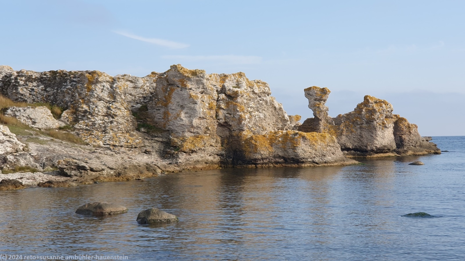 als wir gegen 8 uhr aufstehen, hat es zwar auch heute viele wolken, aber wir sehen einige kleine blaue flecken am himmel. nach dem frühstück brechen wir auf richtung südspitze von gotland. auf der fahrt über die strasse 140 machen wir südwestlich von visby einen abstecher zur steilküste högklint. über einen schmalen pfad steigen wir zum wasser hinunter und kehren dann auf einem weg oben auf der klippe zum wagen zurück. den nächsten zwischenhalt machen wir beim leuchtturm neben dem visby golfklubb. kurz nach 13:20 uhr sind wir bei hoburgen in der nähe der südspitze von gotland und picknicken an einem tisch des geschlossenen restaurants. danach spazieren wir ein wenig der küste entlang. über die "schöne küstenstrasse" und schmale strässchen fahren wir nach holmhällar. hier soll es einen besonders schönen sandstrand haben. wir sind allerdings ziemlich enttäuscht, denn am strand hat es einen hässlichen, braunen streifen stinkiges etwas. dafür finden wir ganz in der nähe eine pension mit einem hübschen gartenrestaurant. anschliessend unternehmen wir eine kleine rundwanderung entlang der küste und bewundern zahlreiche raukar. über die strasse 142 geht es zurück nach visby, wo wir lebensmittel einkaufen und unseren wagen auftanken. wieder beim campingplatz geniessen wir unser abendessen im schönen aufenthaltsraum. den abend verbringen wir im jogi.