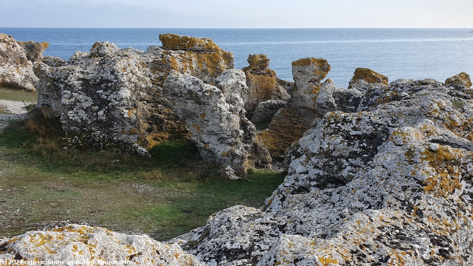 wieder kehren wir zur strasse 140 zurück. wir folgen nun der westlichen küste südwärts. ab klintehamn verläuft die strasse im landesinneren. gegen 13 uhr erreichen wir burgsvik. auf wunsch meiner frau verzichten wir darauf, im einzigen restaurant zu mittag zu essen und fahren weiter bis hoburgen in der nähe der südspitze von gotland. dort picknicken wir an einem tisch des geschlossenen restaurants. um diese jahreszeit hat fast alles auf dieser insel zu. nach dem essen spazieren wir zu den raukar, welche auch hier zahlreich vorhanden sind.