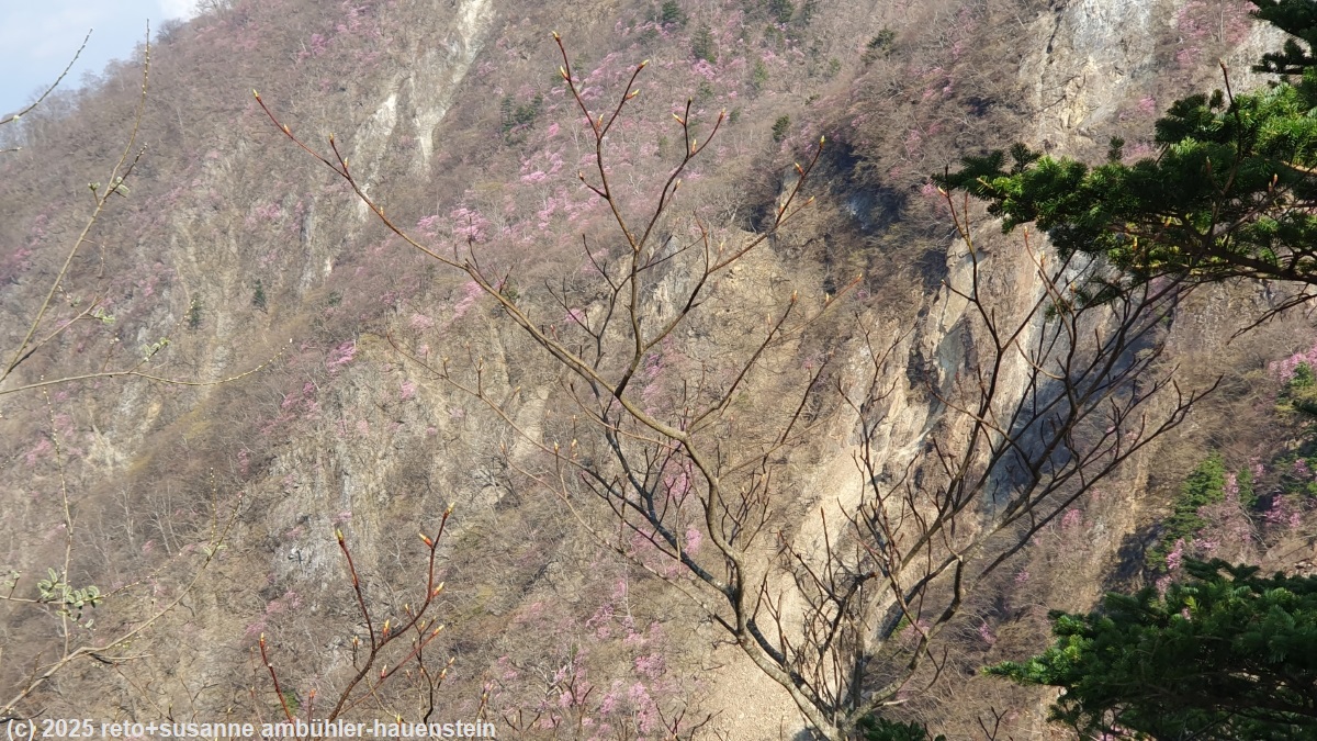es empfängt uns ein bedeckter himmel und es bläst ein kühler wind. vor der weiterfahrt haben wir zeit, im nahen familymart picknick einzukaufen. mit einem bus fahren wir zum lake chunzenji, einem hübsch gelegenen see auf über 1200 m.ü.m. die fahrt führt über eine äusserst spektakuläre, kurvenreiche strasse. bis chugushi hat es über ein duzend spitzkehren. von der bushaltestelle spazieren wir zum seeufer und folgen diesem richtung westen. der wanderweg verläuft zwischen der strasse 120 - genannt "japan romantic highway" - und dem steinigen seeufer. gegen dorfende hat es hoch über dem see einen holzsteg mit bänken. auf einer solchen essen wir zu mittag. der himmel hat sich aufgehellt, die sonne scheint, aber der kühle wind bläst nach wie vor.